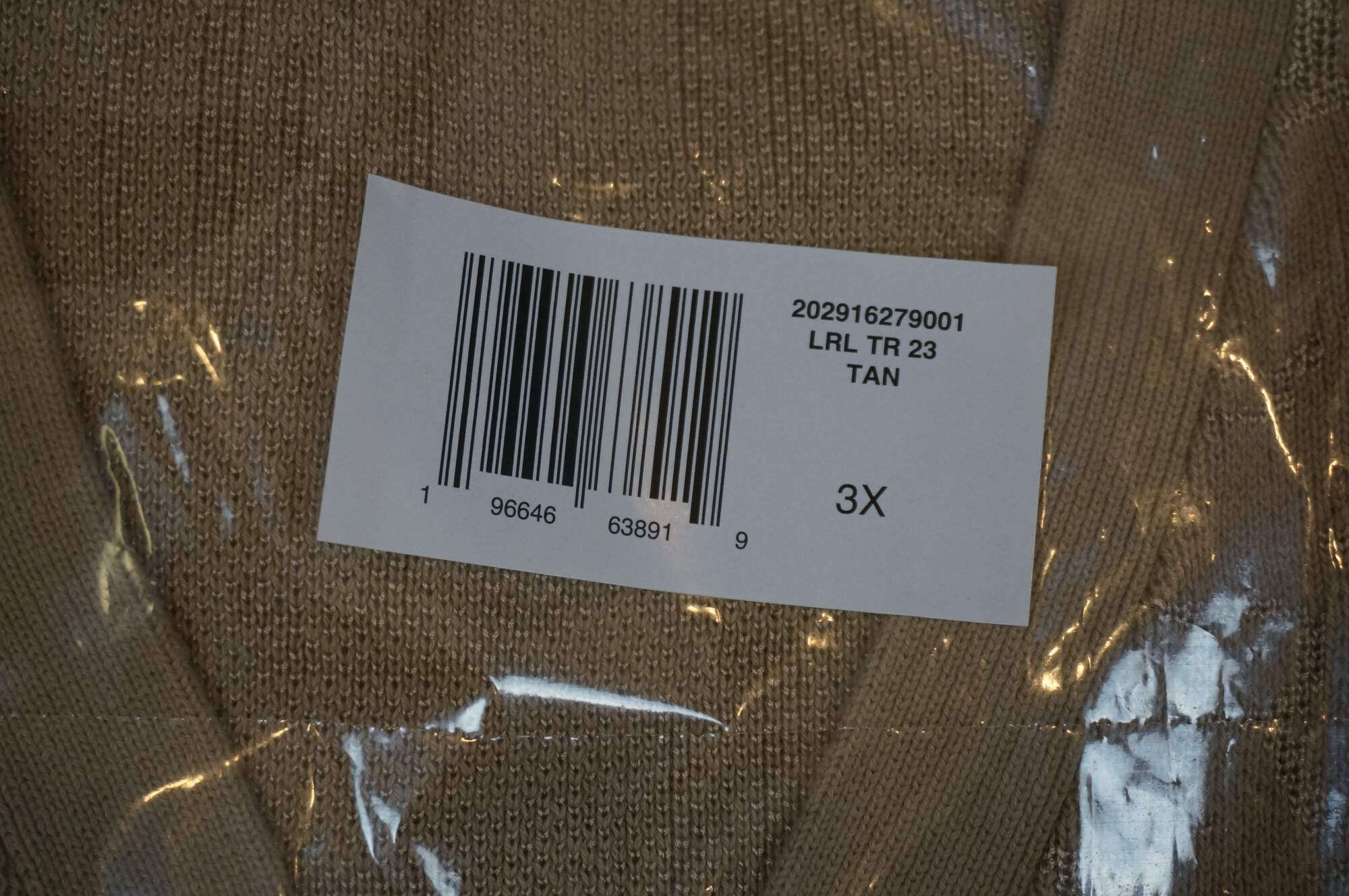 Lauren Ralph Lauren long sleeve women's cardigan sweater. V-neck, button closure. Tan with monogram pattern. Made in China.