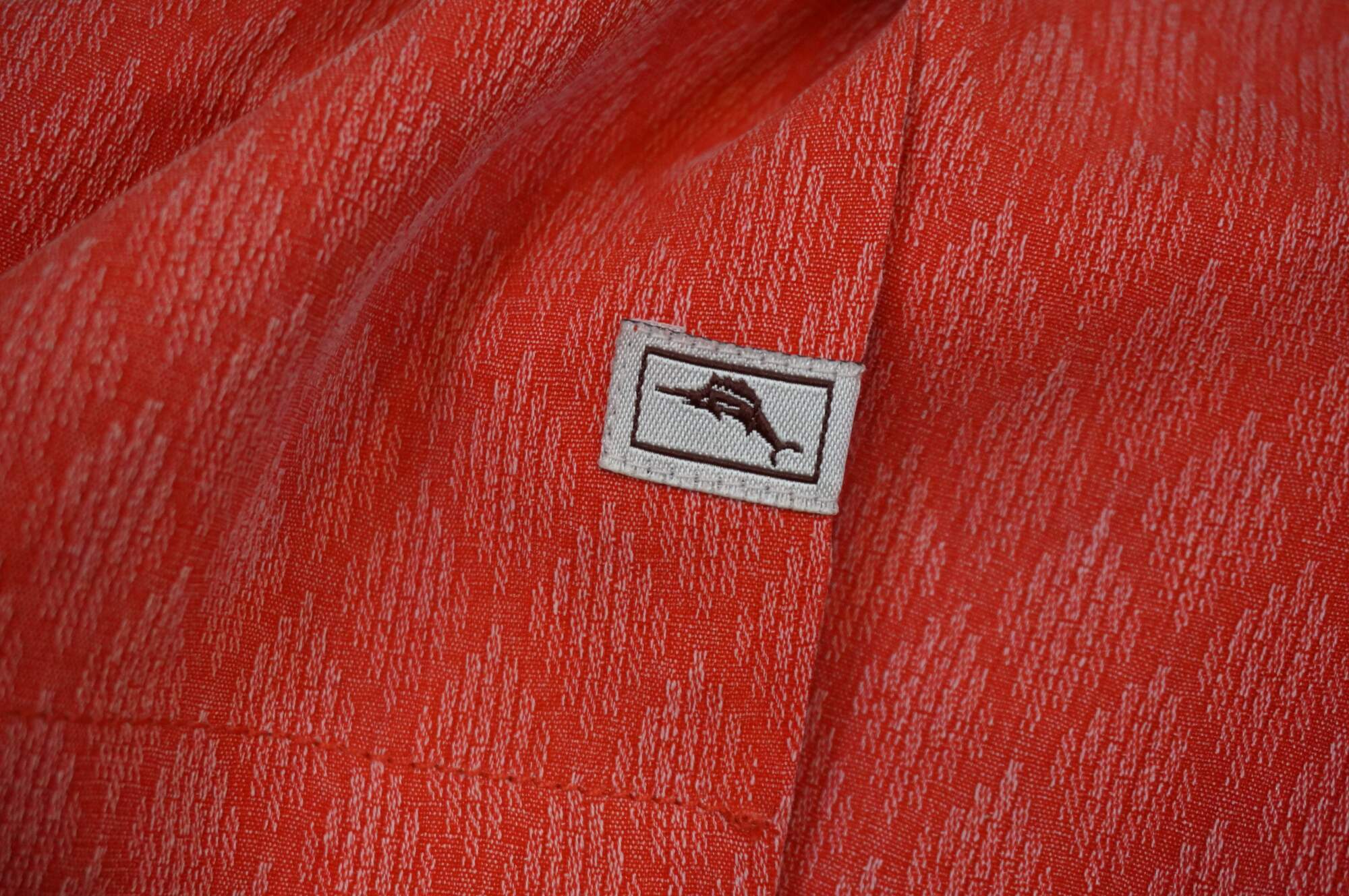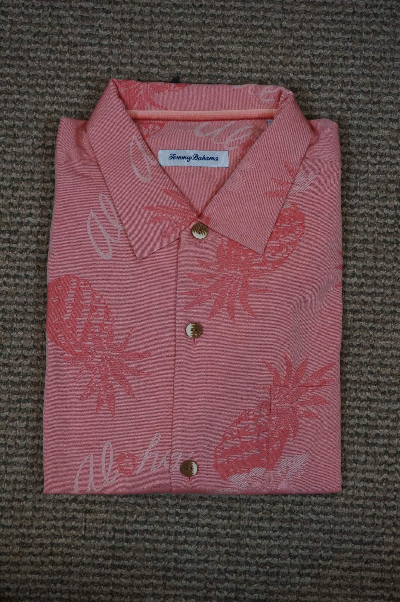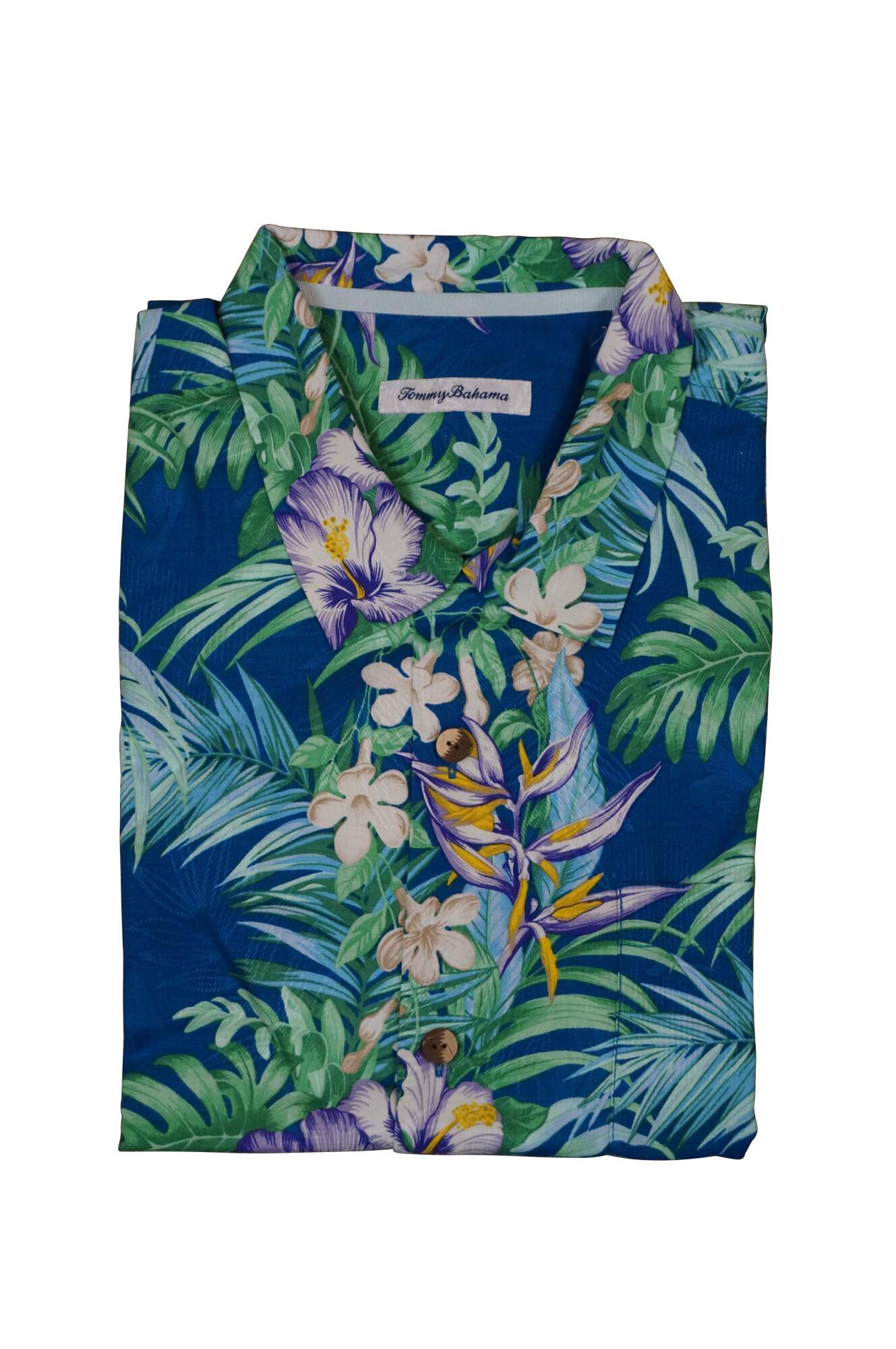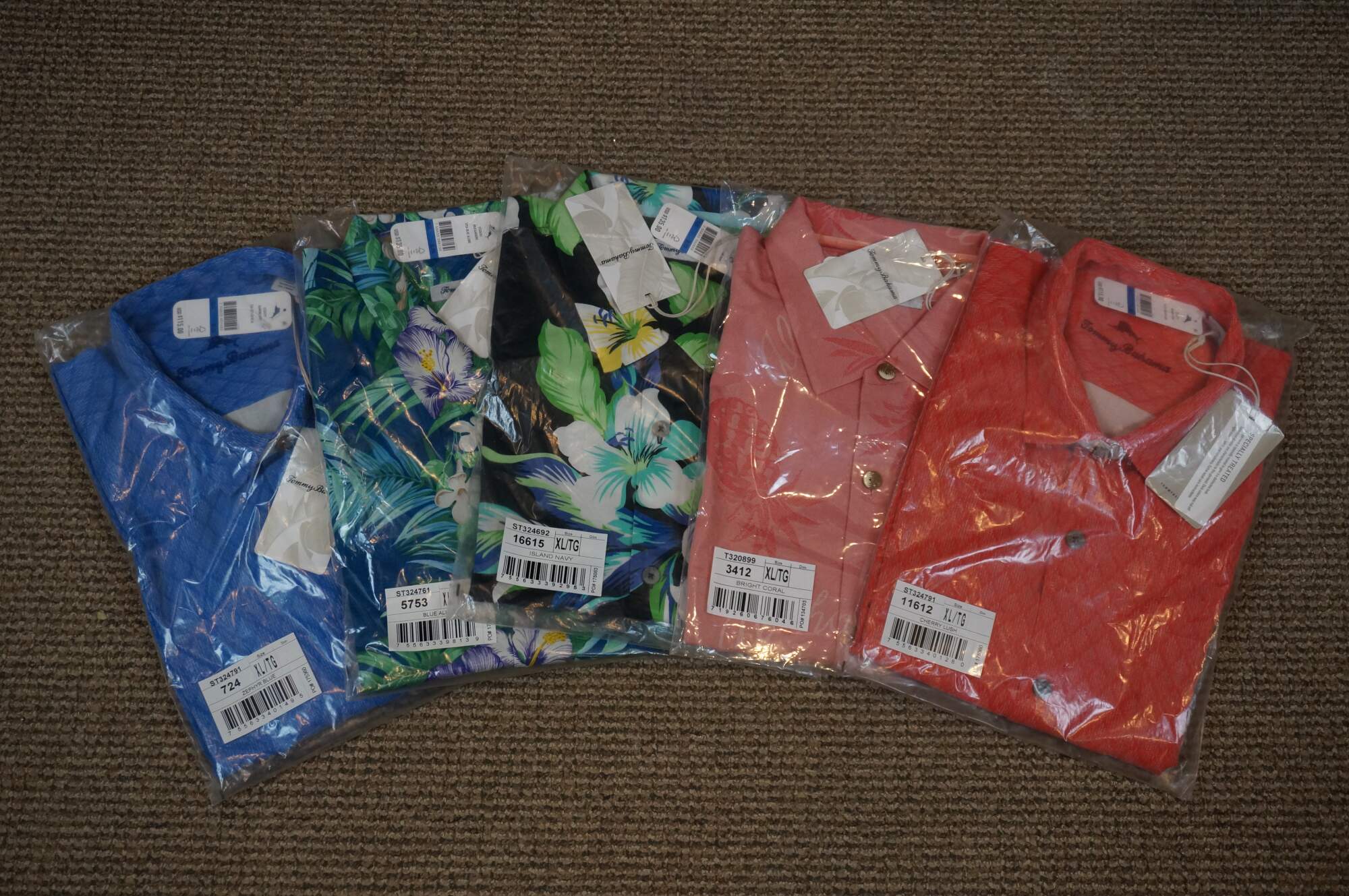Set of five Tommy Bahama men's button up, short sleeve Hawaiian style camp shirts. Island Navy, Cherry Lush, Blue Allure, Bright Coral, and Zephyr Blue. 100% Silk. Made in China.