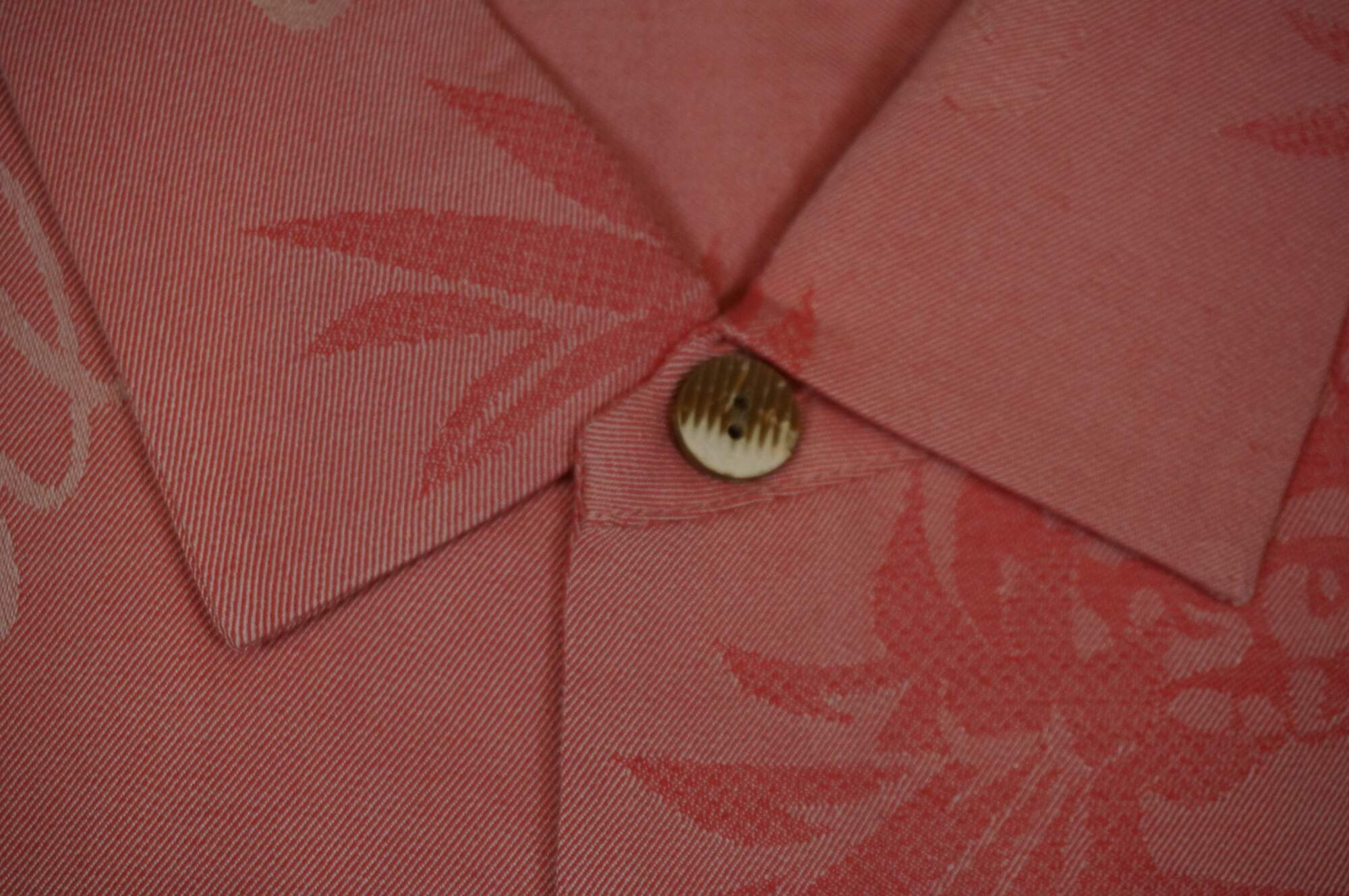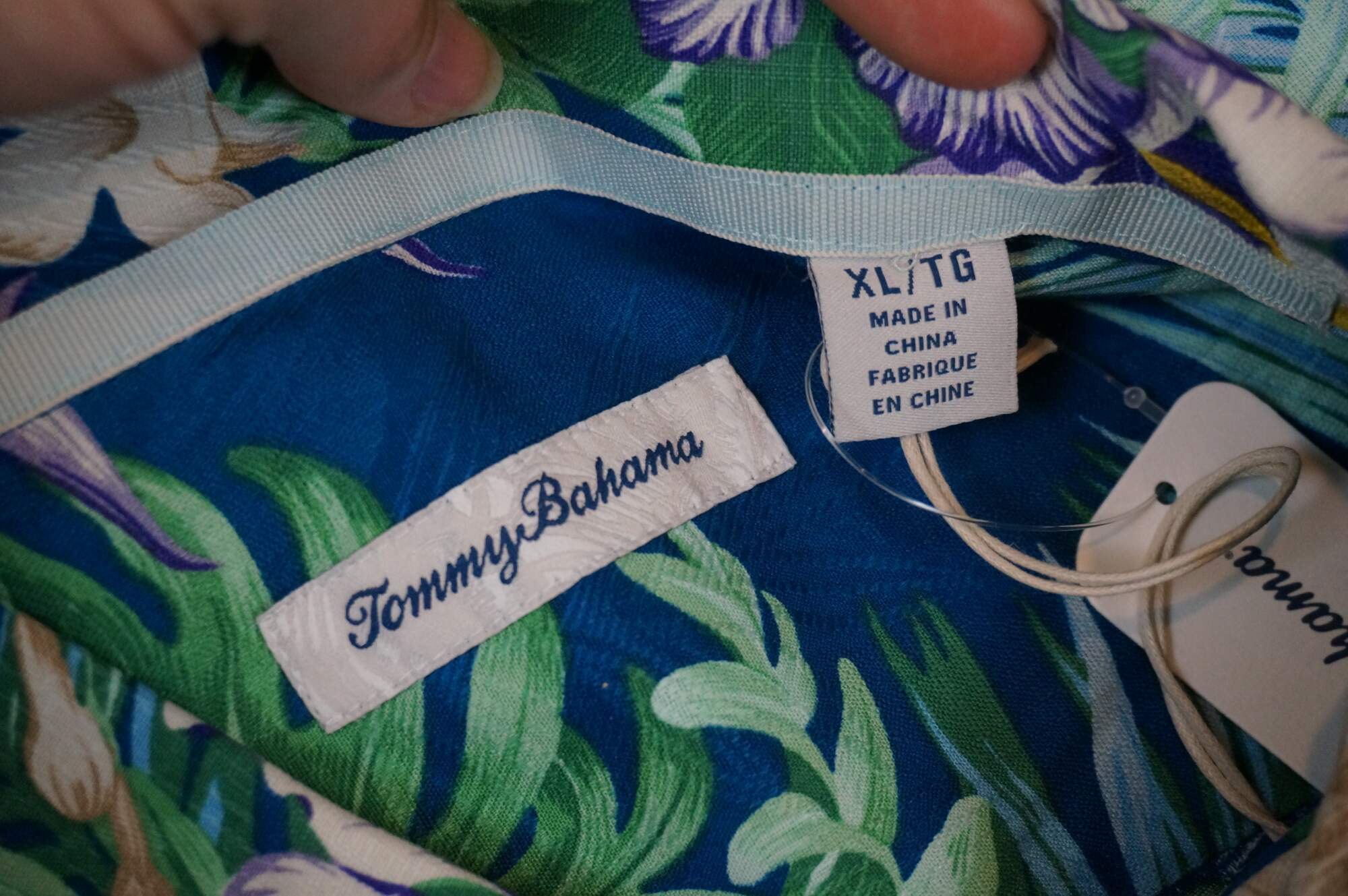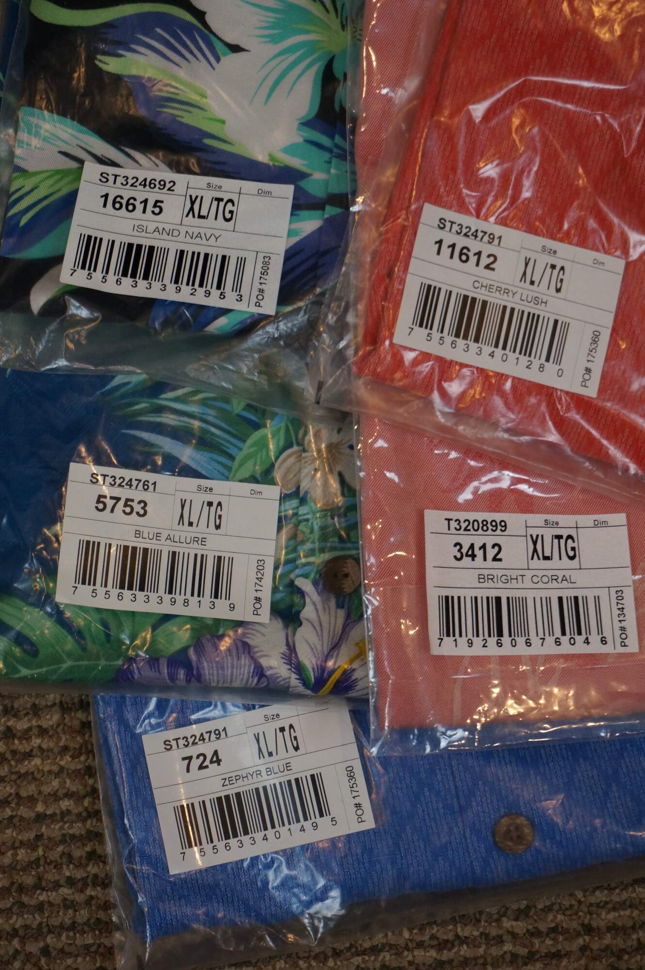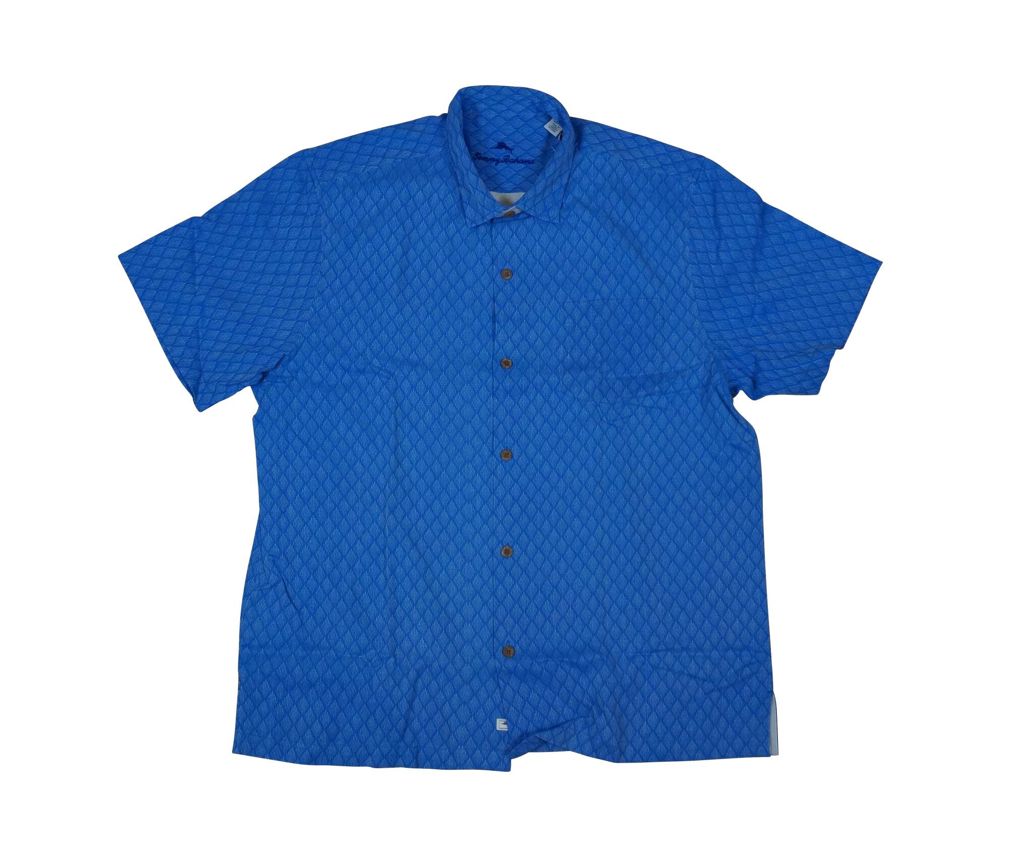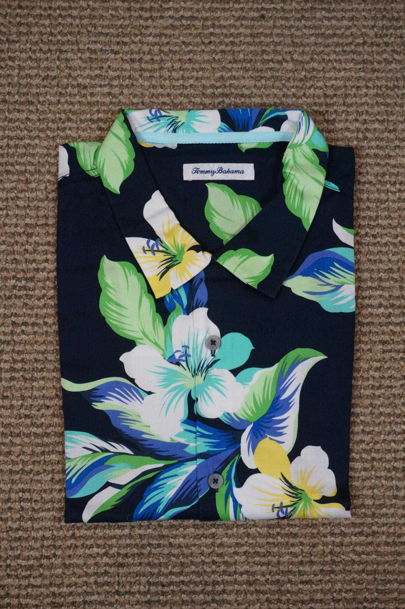 Set of five Tommy Bahama men's button up, short sleeve Hawaiian style camp shirts. Island Navy, Cherry Lush, Blue Allure, Bright Coral, and Zephyr Blue. 100% Silk. Made in China.