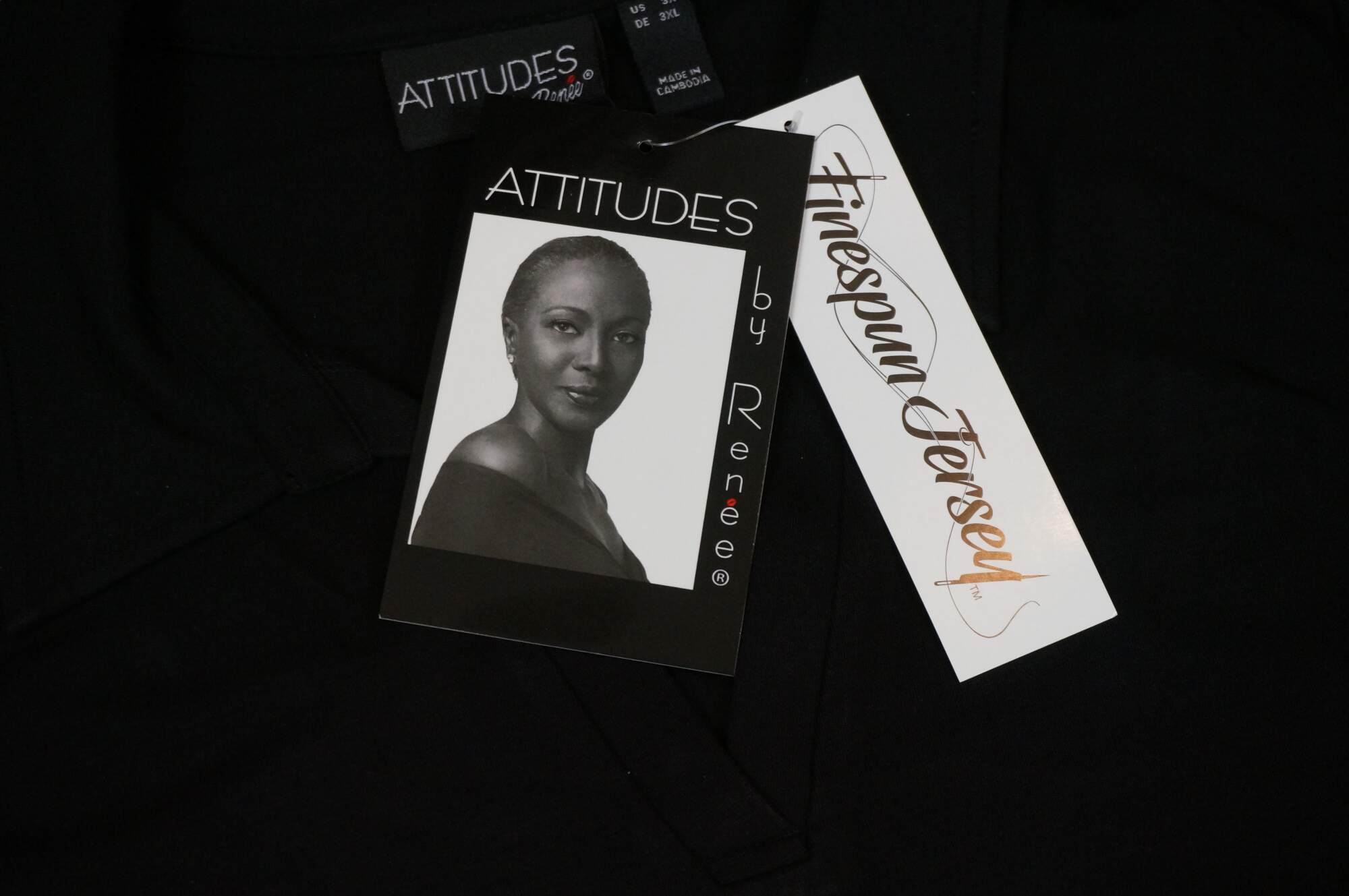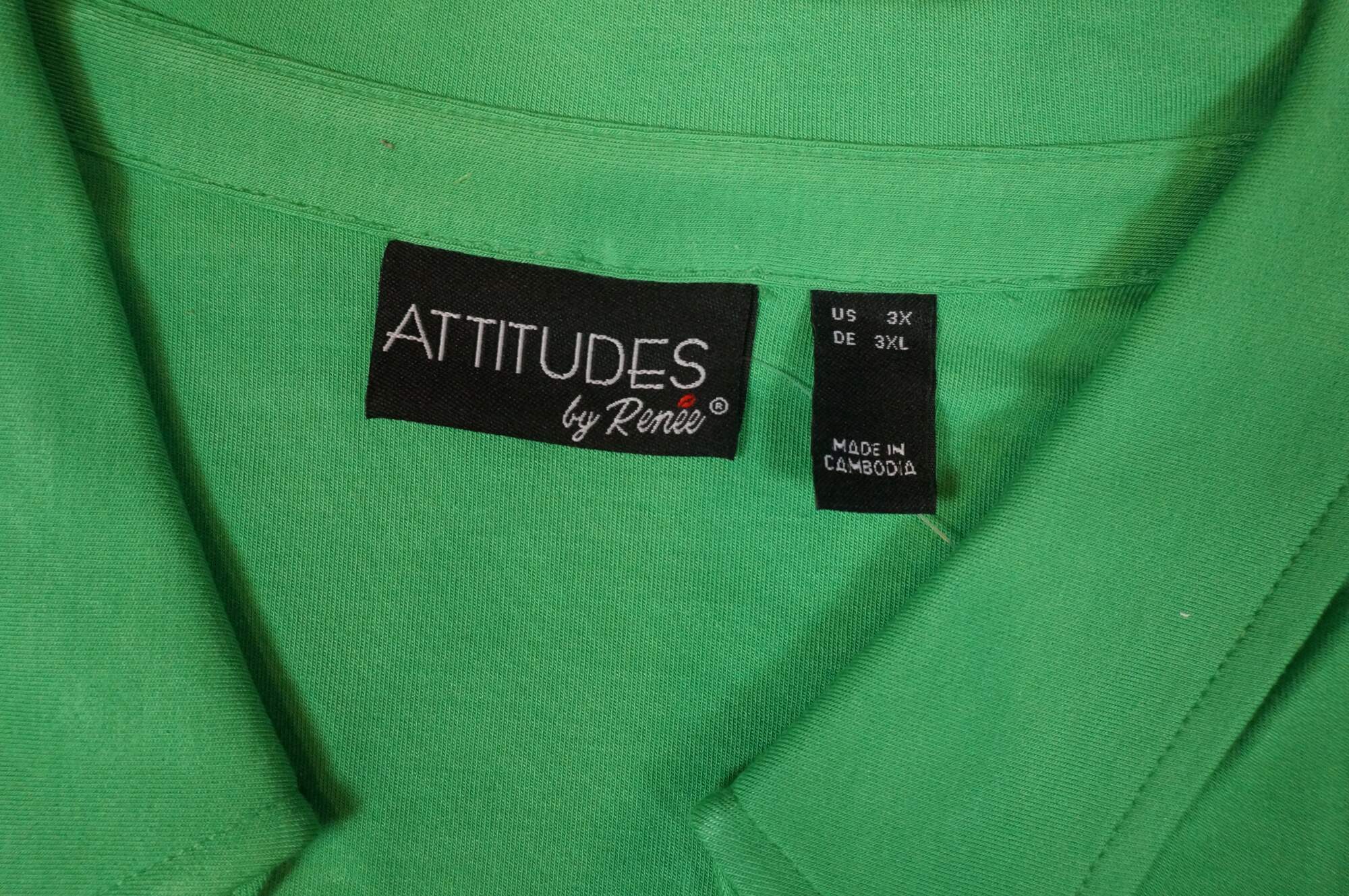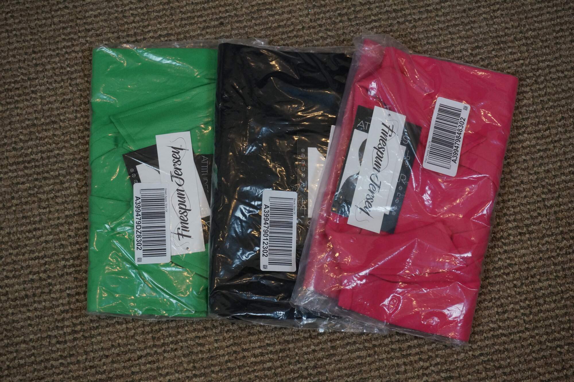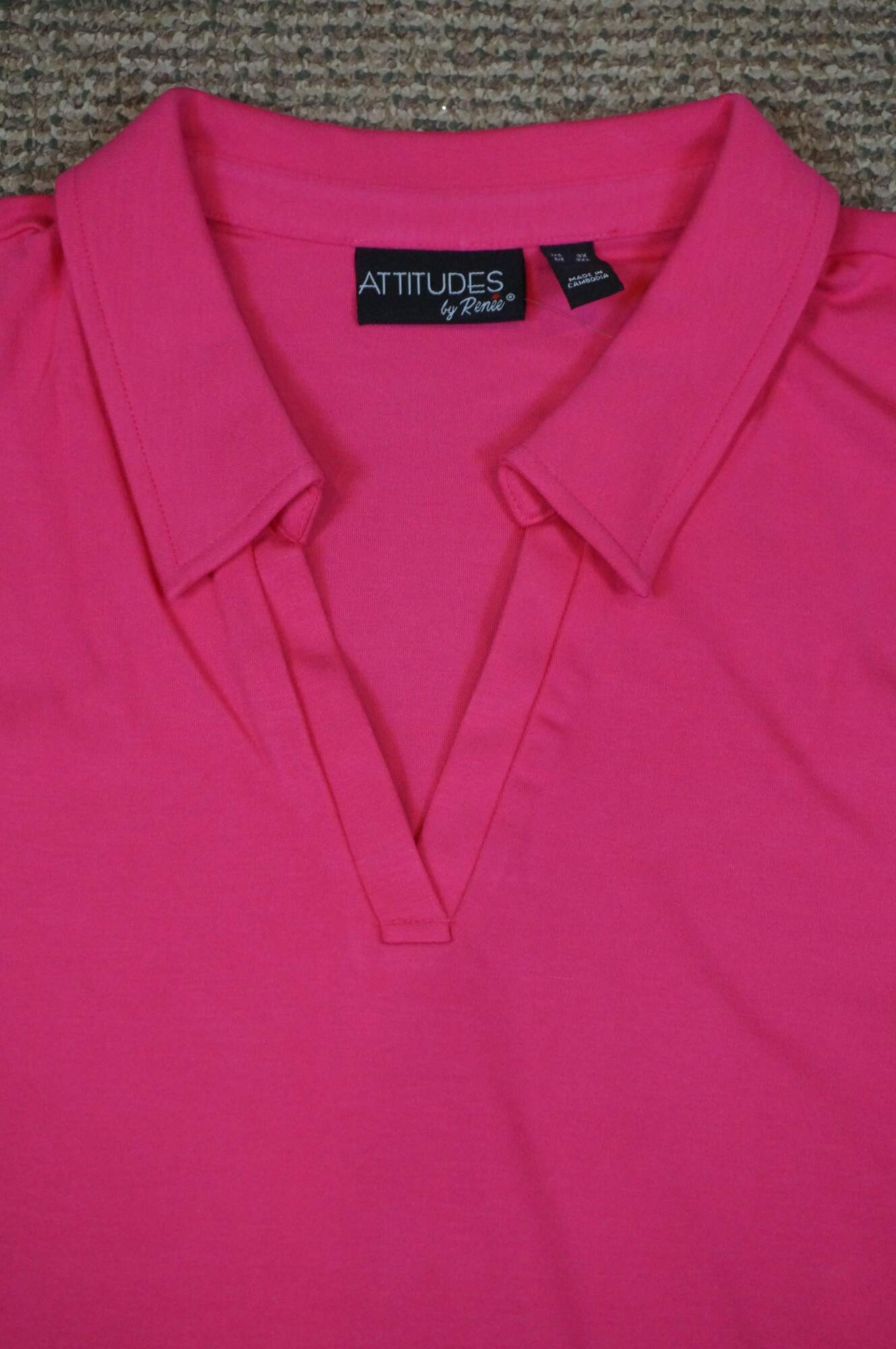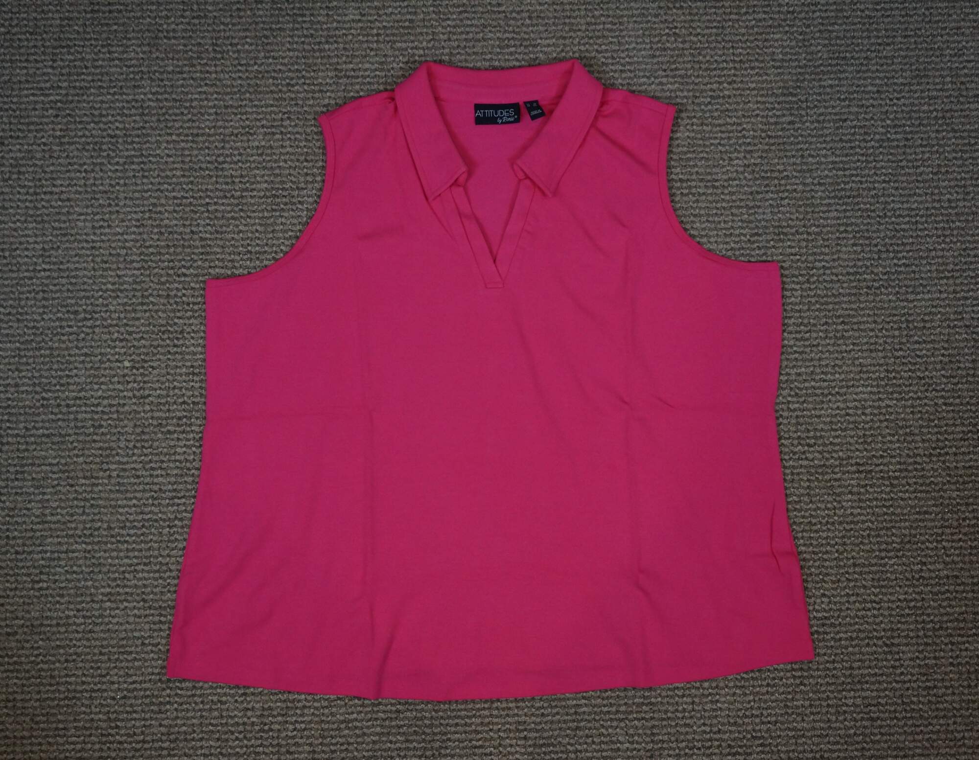 Set of three Attitudes by Renee finespun jersey sleeveless golf shirts. Kelly green, black and bright pink. Rayon/Spandex. Made in Cambodia.