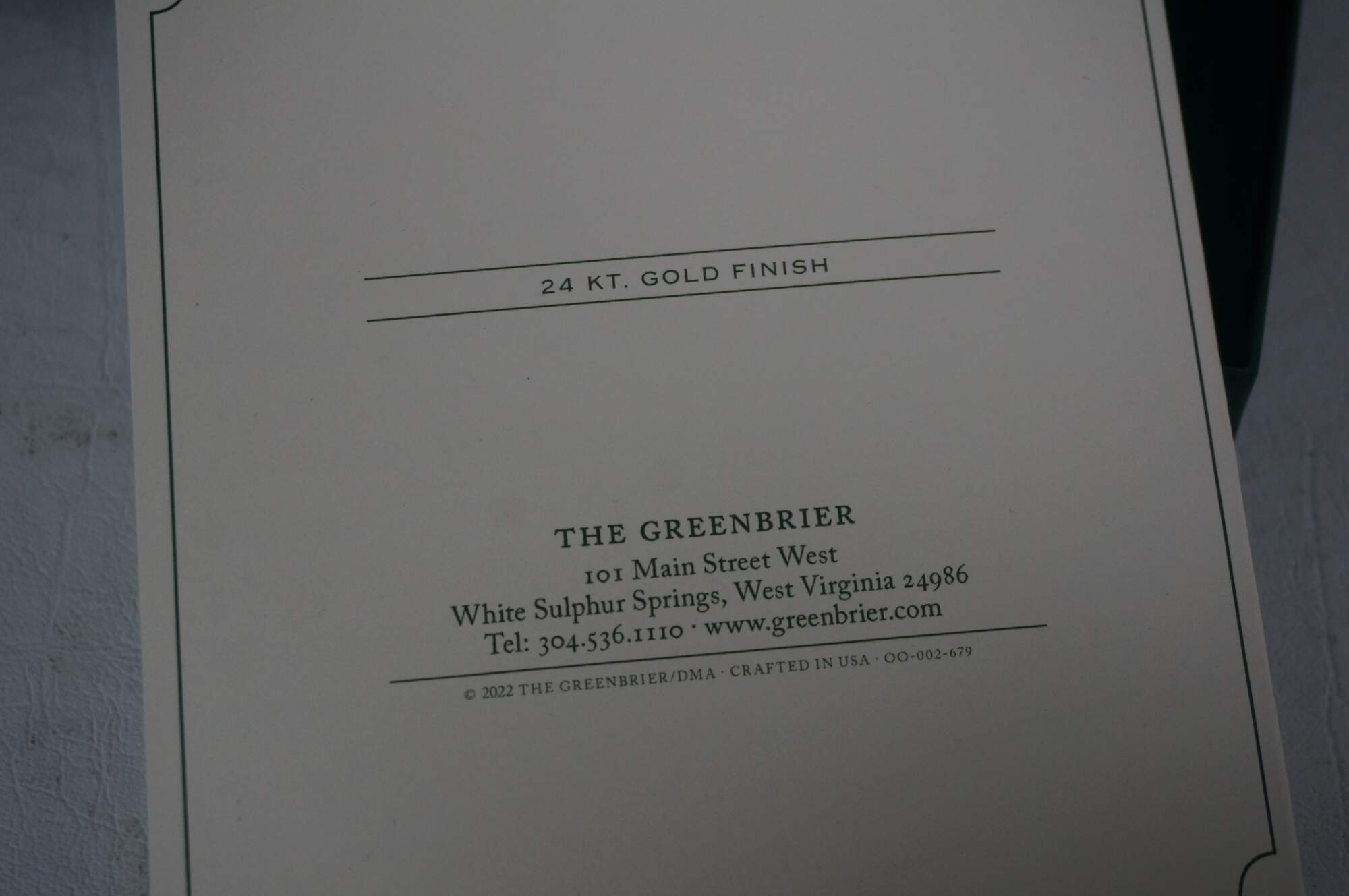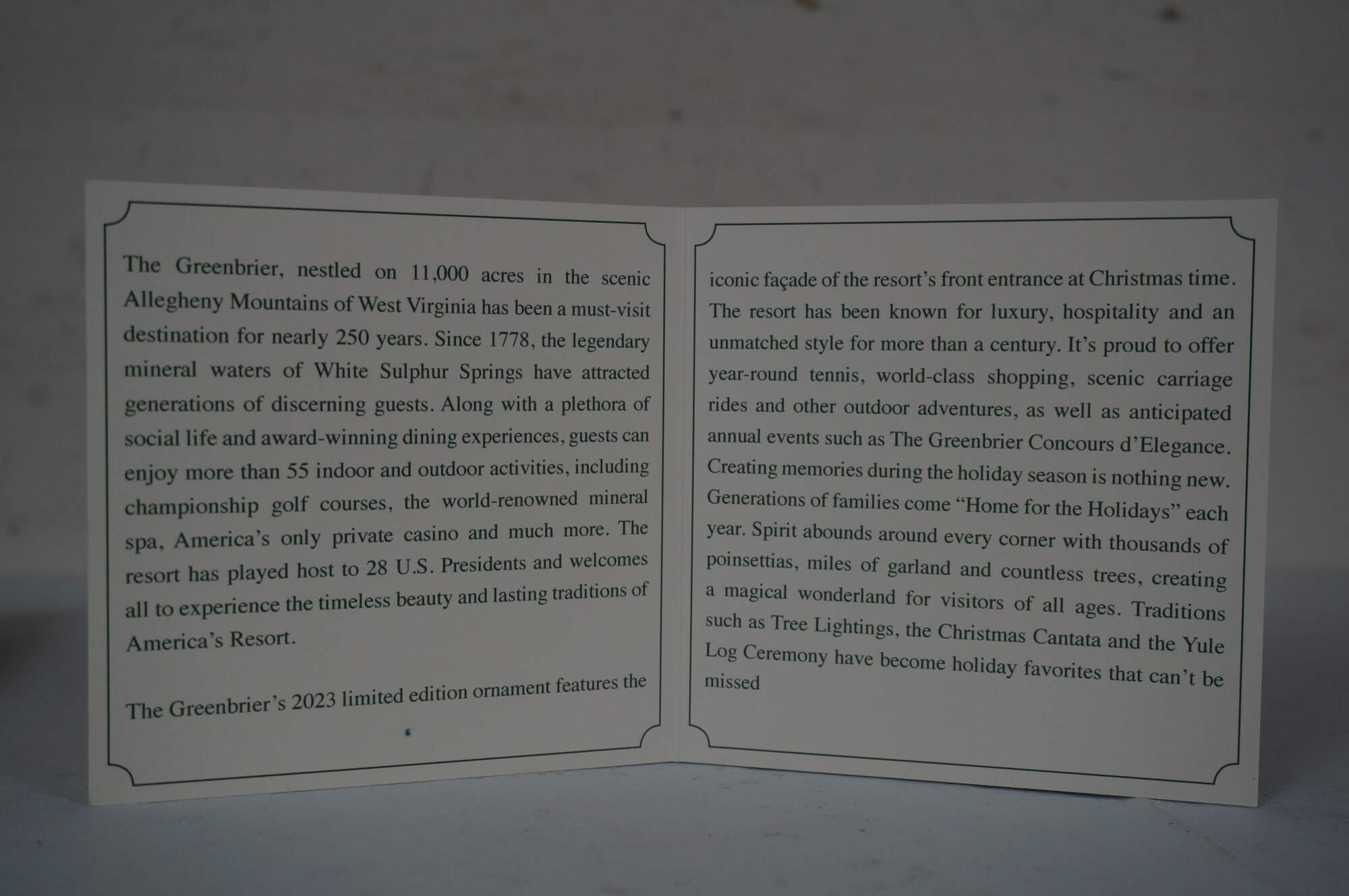 Set of three limited edition Christmas / holiday ornaments from West Virginia's The Greenbrier hotel and resort. 24K Gold finish with enameled details. Years: 2020, 2021, 2023. Include original boxes and inserts. Made in USA.