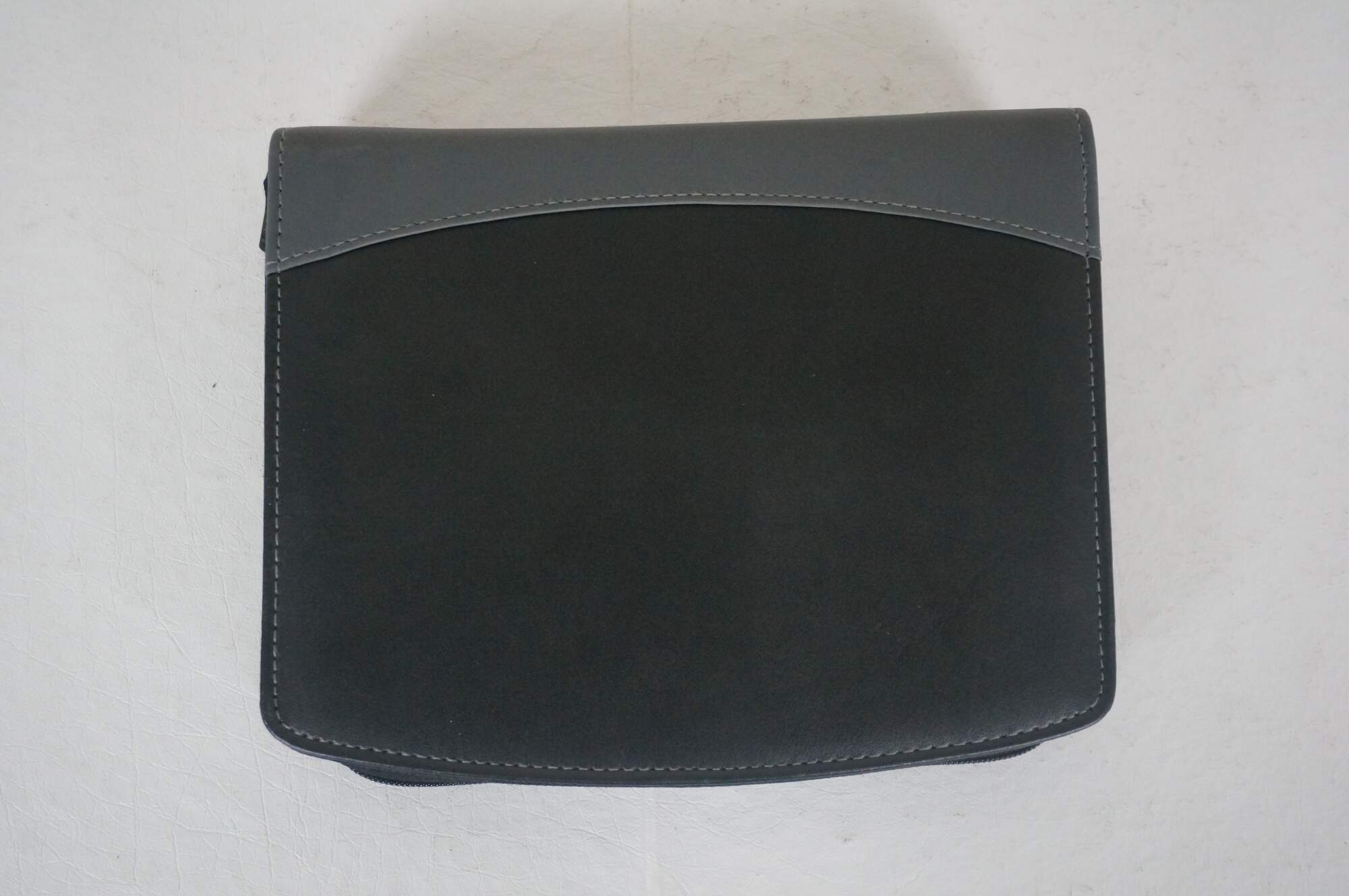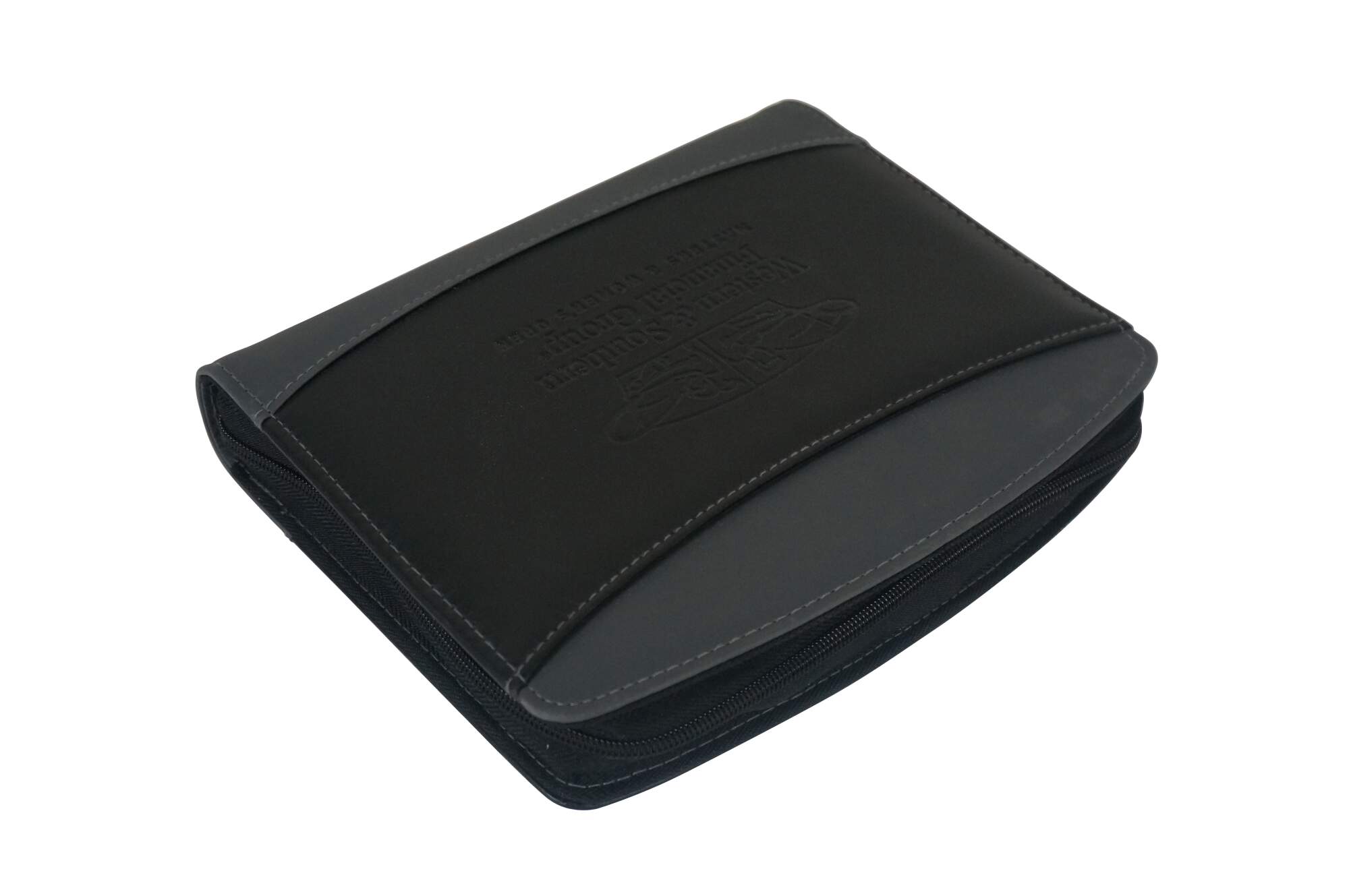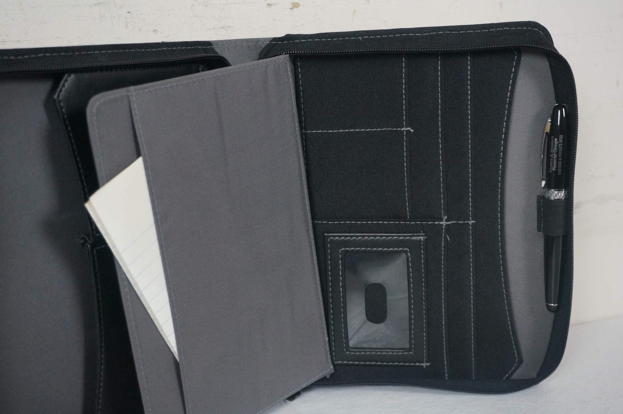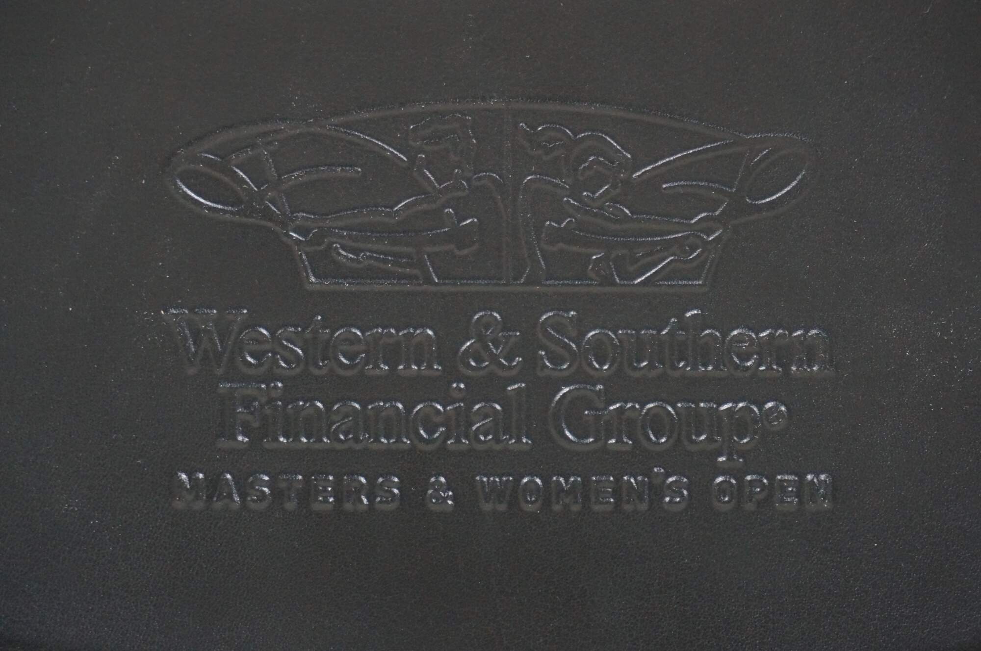 A5 size black and gray leather padfolio / organizer customized to commemorate the Cincinnati Open, sponsored by the Western & Southern Financial Group, circa 2002-2011. Front slip pocket, zippered closure, 11 assorted interior pockets, removable mesh pencil case, pen loop and re-fillable ballpoint pen, 5" x 8" note pad.