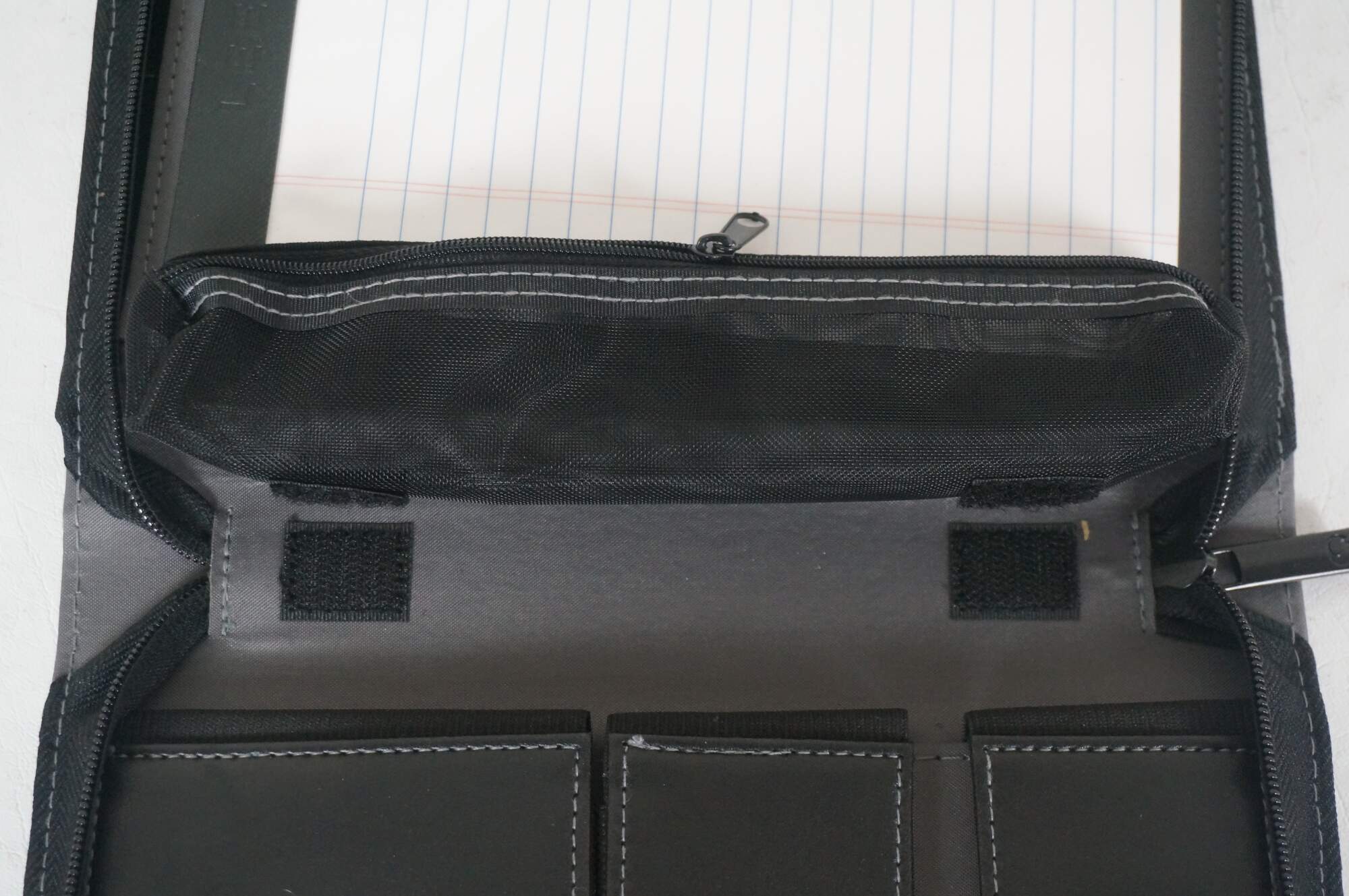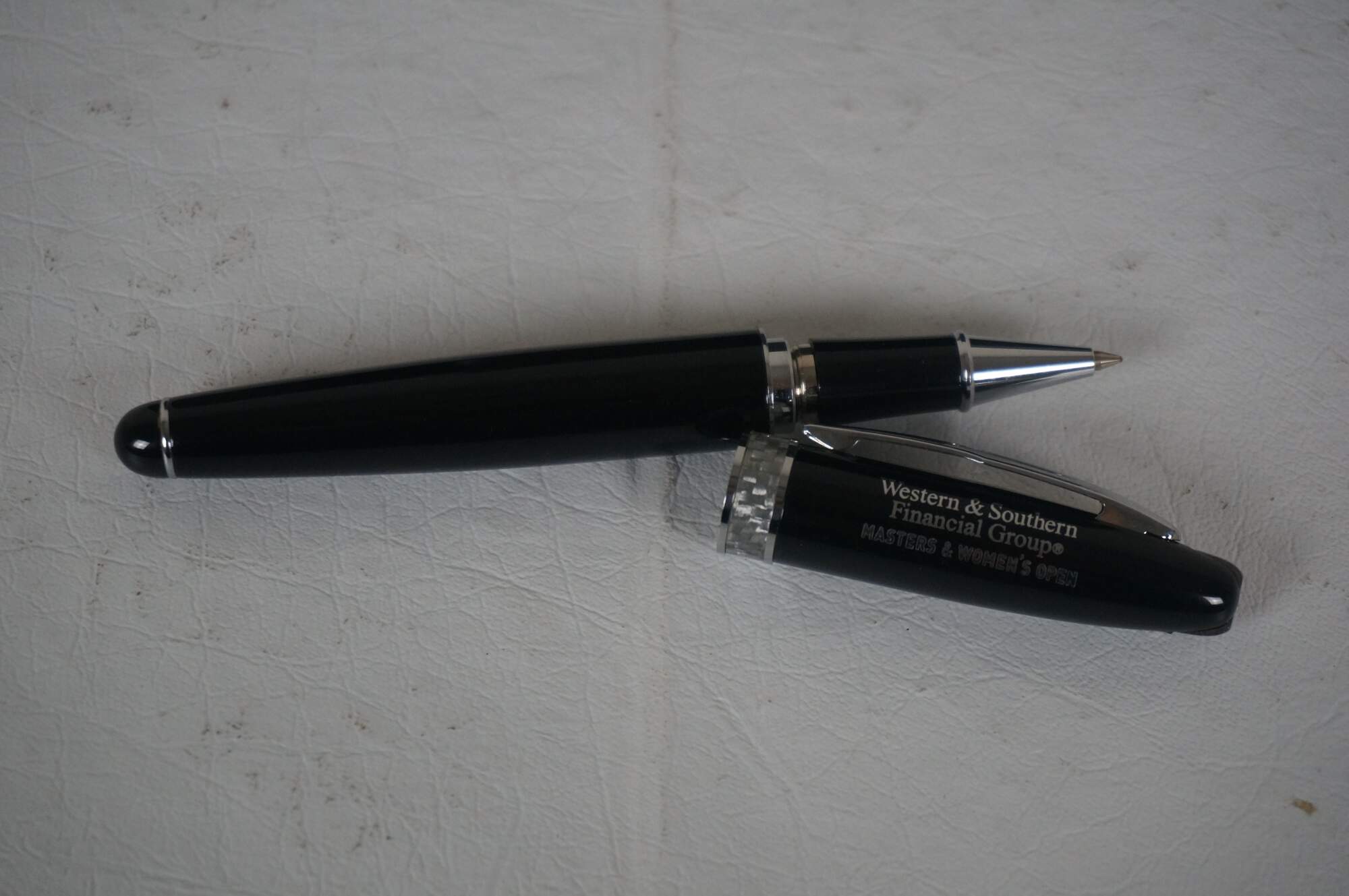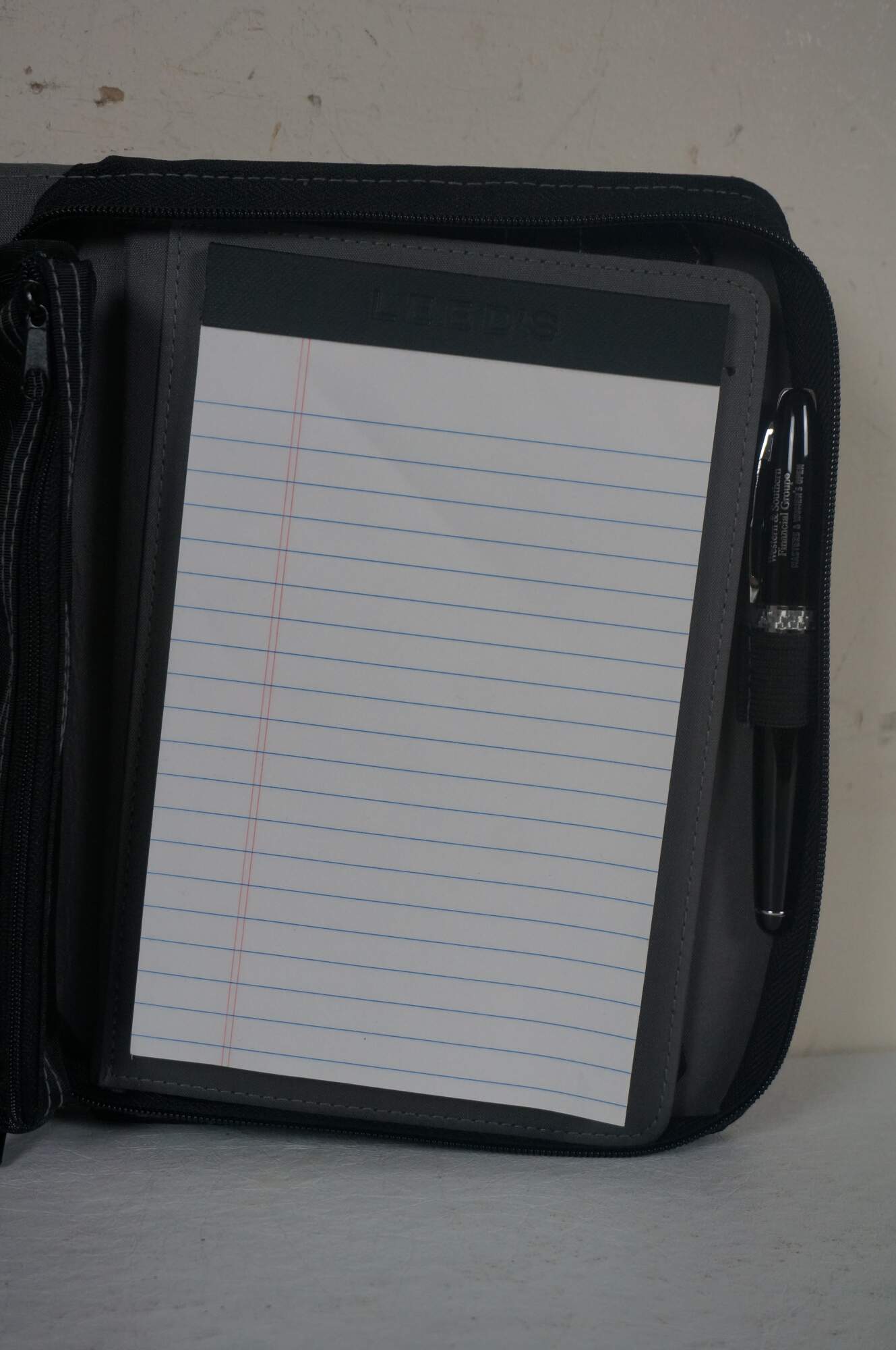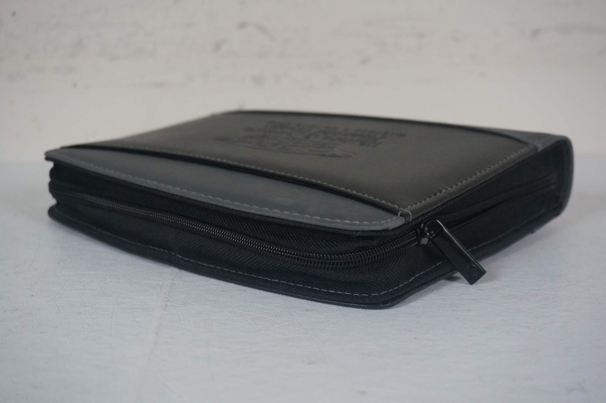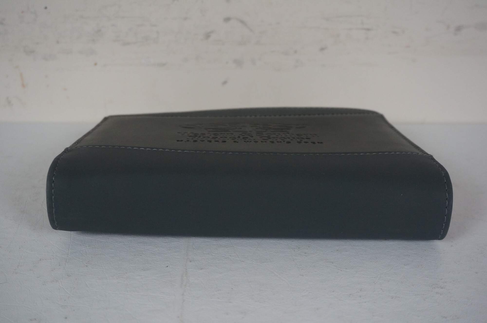 A5 size black and gray leather padfolio / organizer customized to commemorate the Cincinnati Open, sponsored by the Western & Southern Financial Group, circa 2002-2011. Front slip pocket, zippered closure, 11 assorted interior pockets, removable mesh pencil case, pen loop and re-fillable ballpoint pen, 5" x 8" note pad.