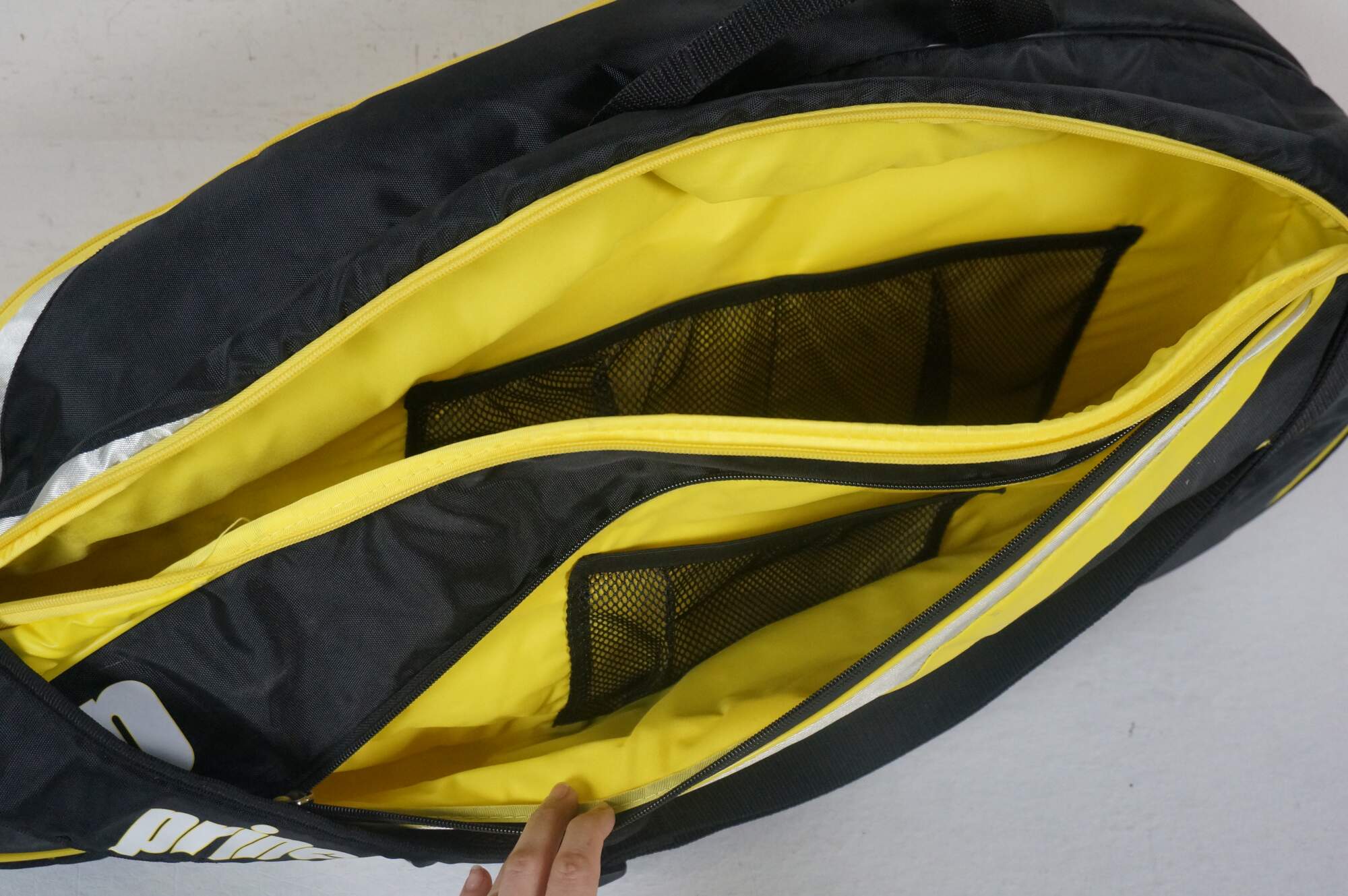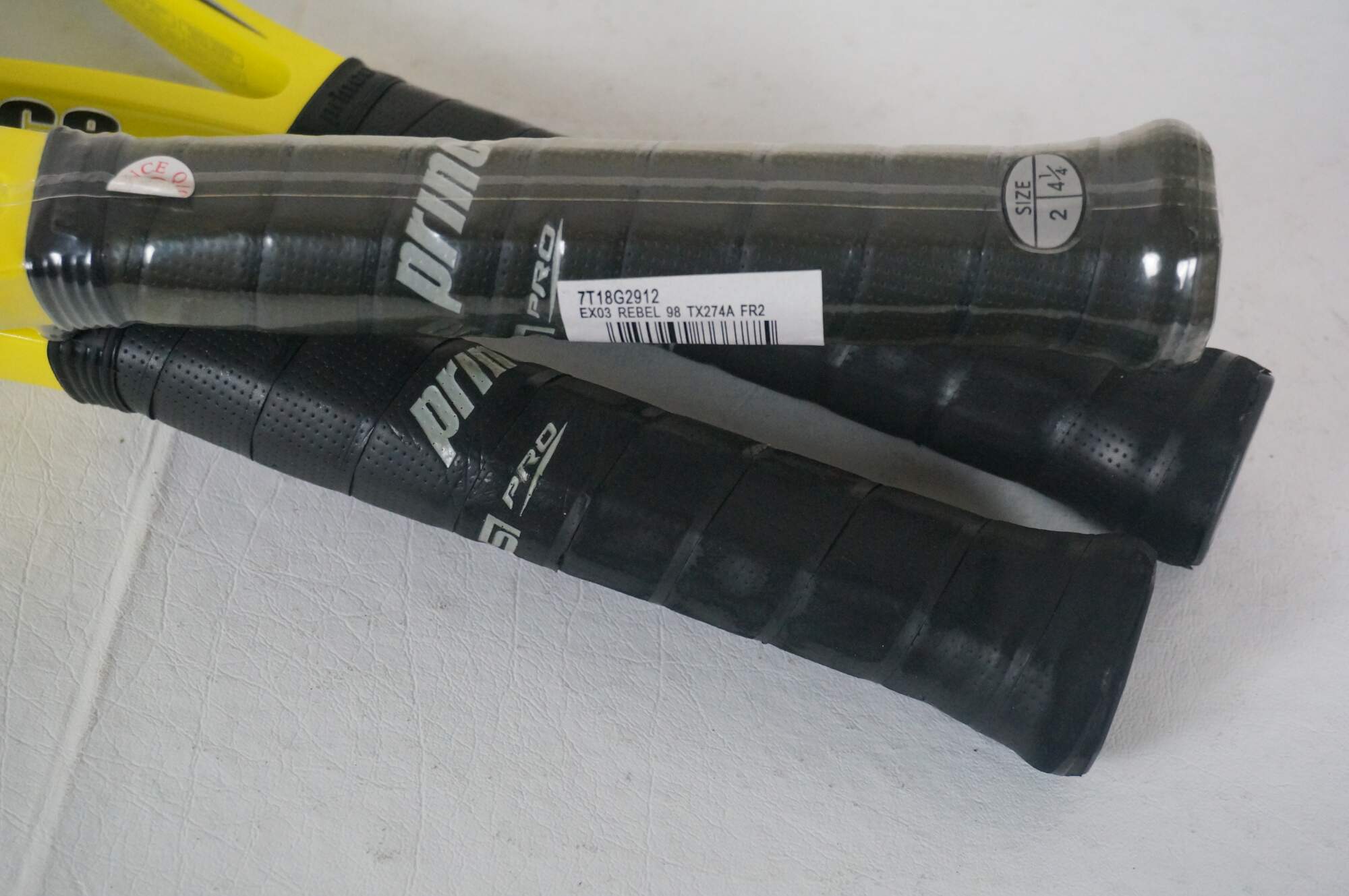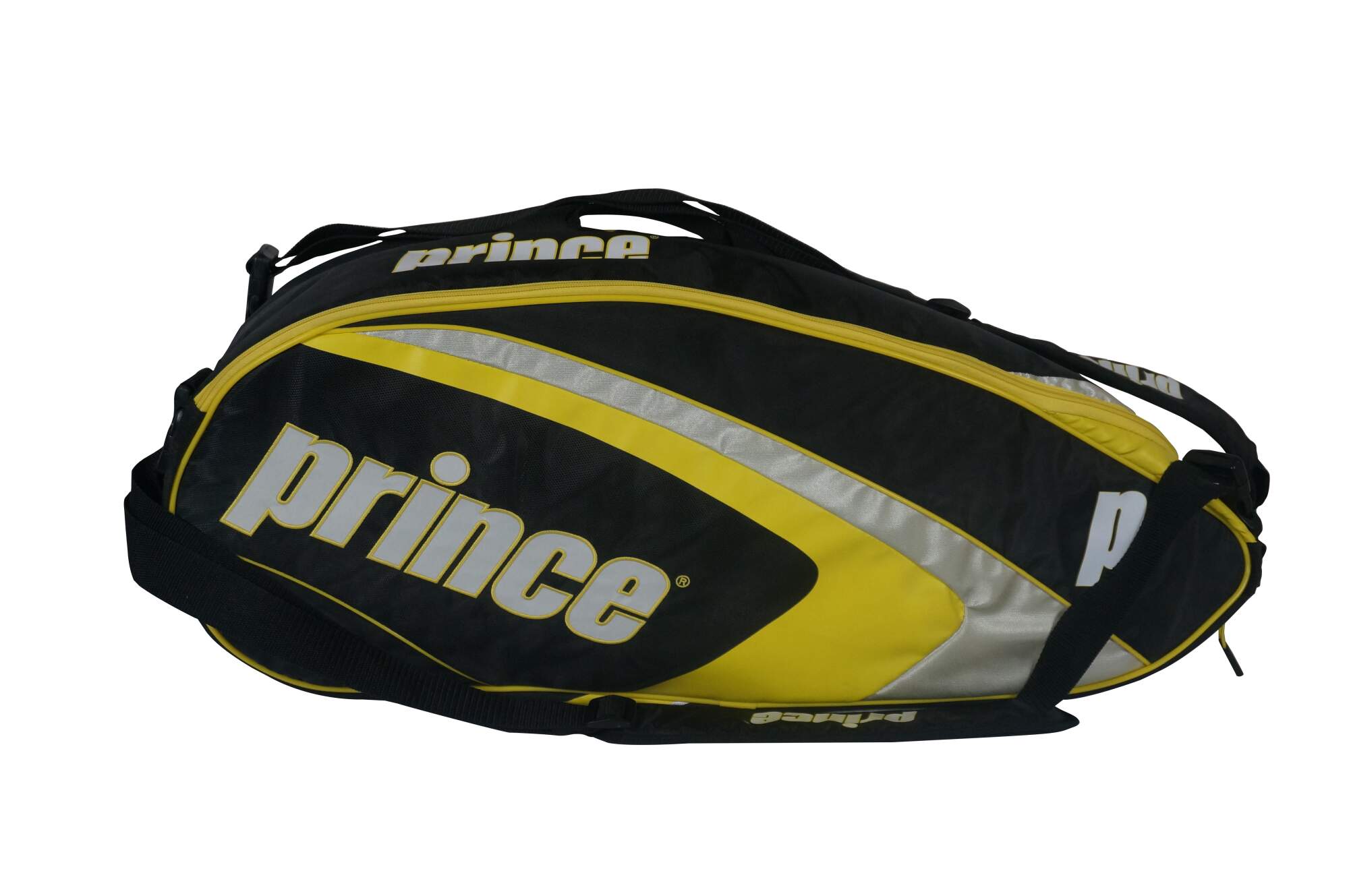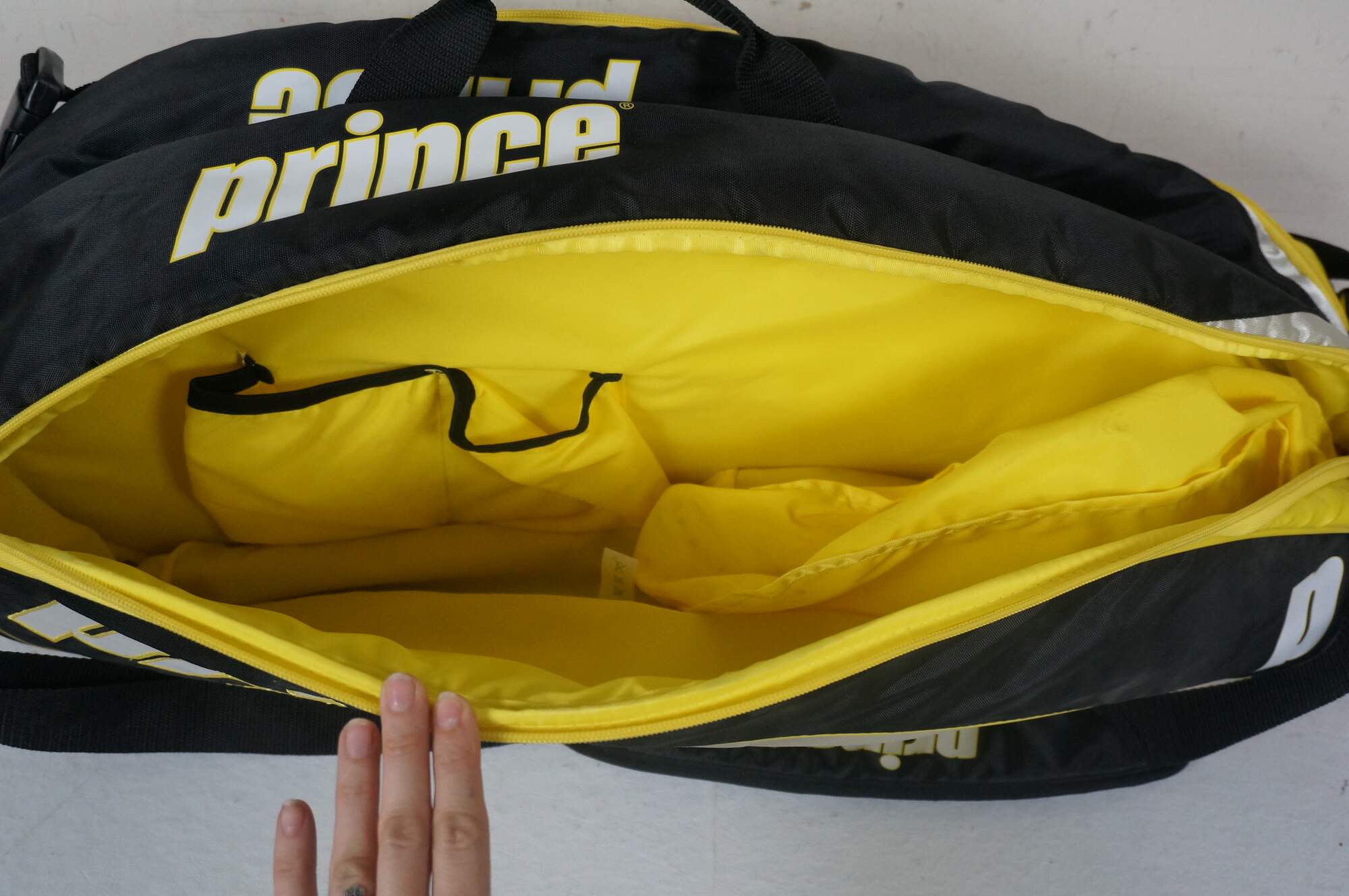 Prince Rebel 12 Pack Racquet Bag and Three EXO3 Rebel 98 TX274A FR2 racquets Size 2 - 4 1/4. Bag features: two double zippered main compartments with capacity for multiple racquets, zippered exterior pocket, three mesh and two plain interior slip pockets, zippered shoe pocket, handles at top and side, two adjustable shoulder straps. 80% Polyester, 20% Nylon. Made in China.
