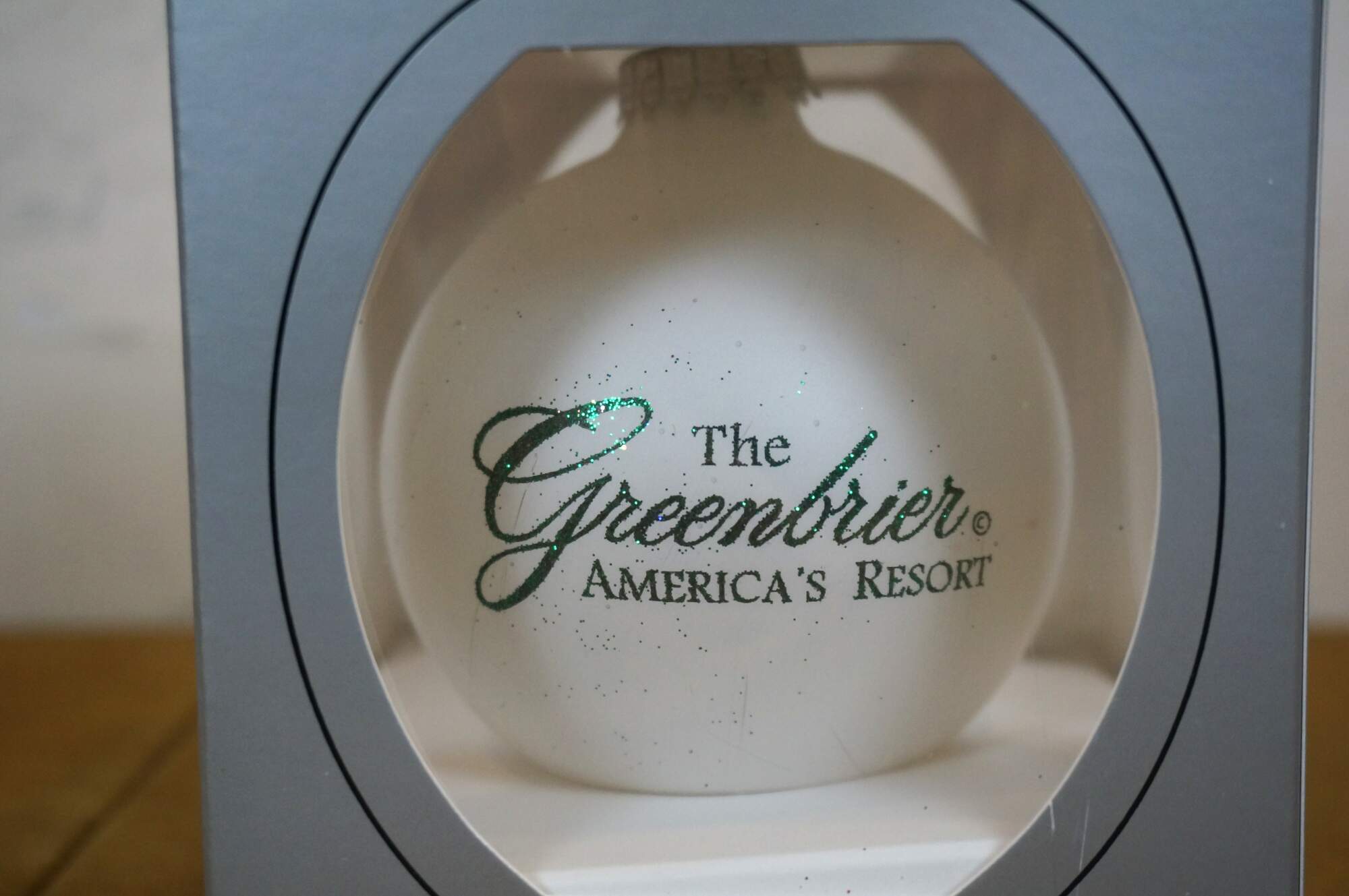 Set of four Greenbrier Hotel & Resort blown glass bauble Christmas ornaments. Set includes: HSN 2012 Ornament Collection - Pink, green and silver glitter ball designed by Carlton Varney. Sealed 2014 and 2015 Carleton Varney Holiday Ornaments. 2018 Heart Gifts by Teresa, Inc - white ball with glitter heart and Swarovski crystals.