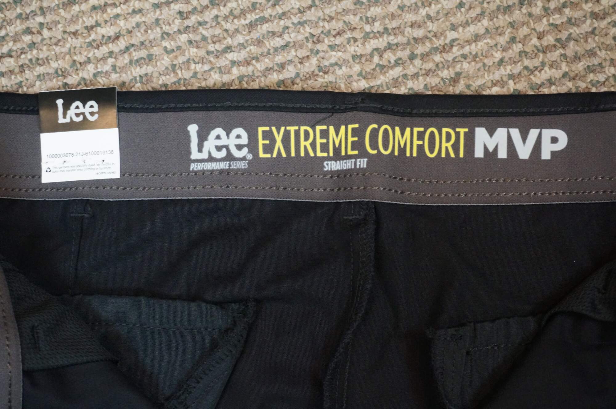 Two pairs Lee Performance Series Extreme Comfort MVP men's pants. Black. Straight Fit, Straight Leg - TruTemp Thermal Regulation - Extreme Flex Waistband - Performance Stretch - Moisture Wicking - Wrinkle Resistant - Stain Release. 60% Cotton / 38% Polyester / 2% Spandex. Made in Bangladesh.