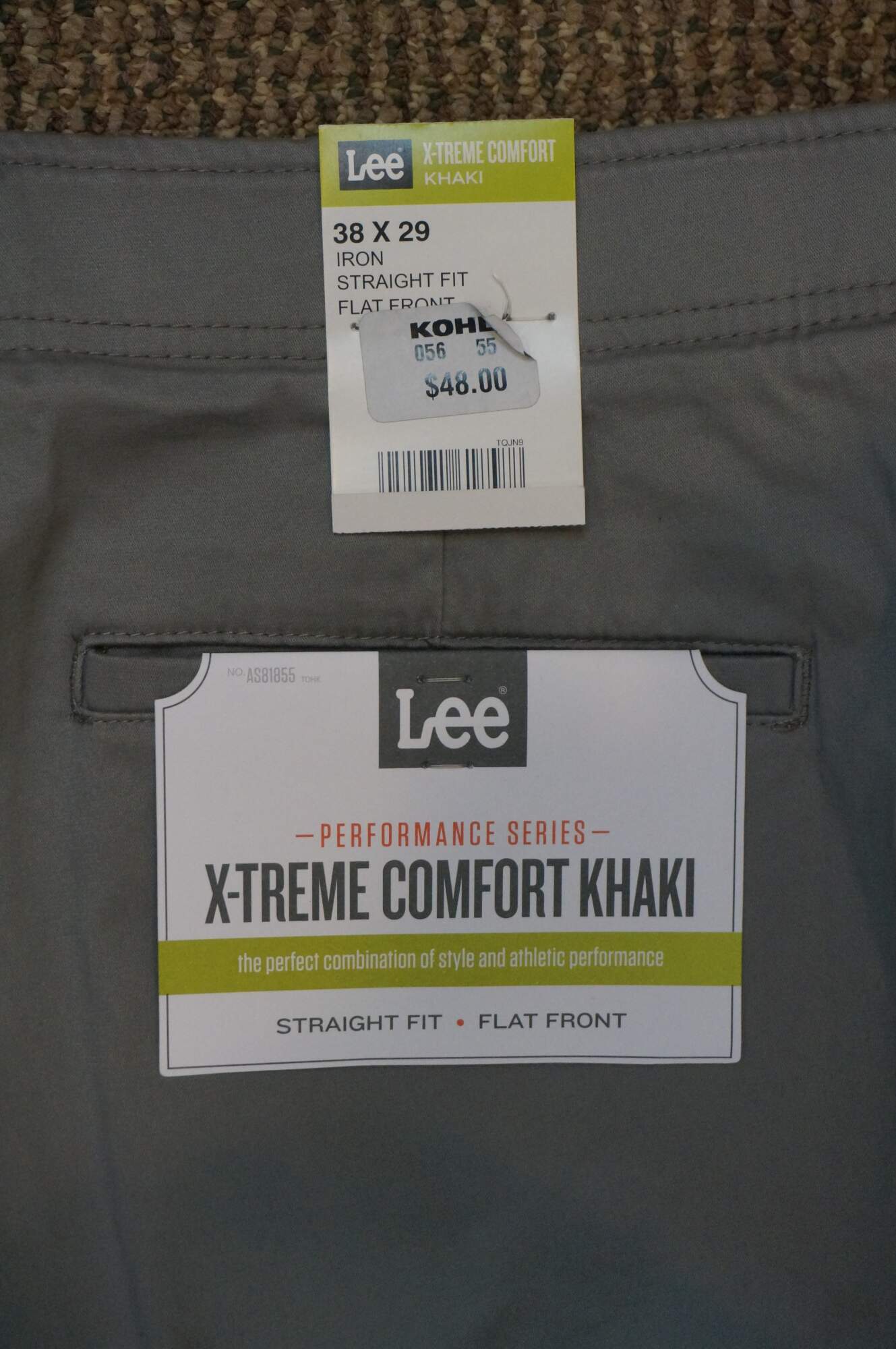 Lee Performance Series X-Treme Comfort Khaki man's pants. Iron. Straight Fit - Flat Front - Work to Play Versatility - Active Comfort Fabric. 98% Cotton / 2% Spandex. Made in Bangladesh.