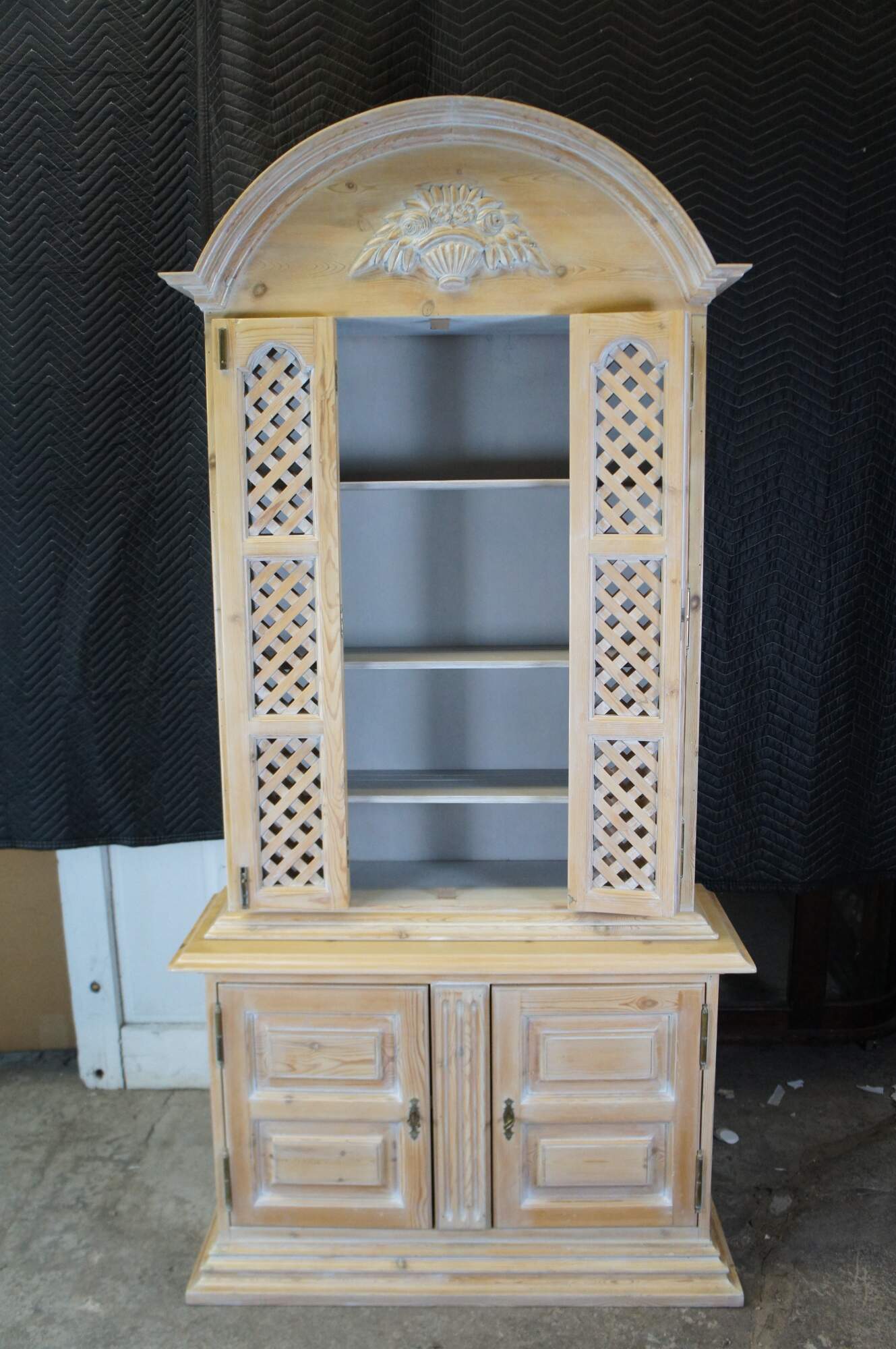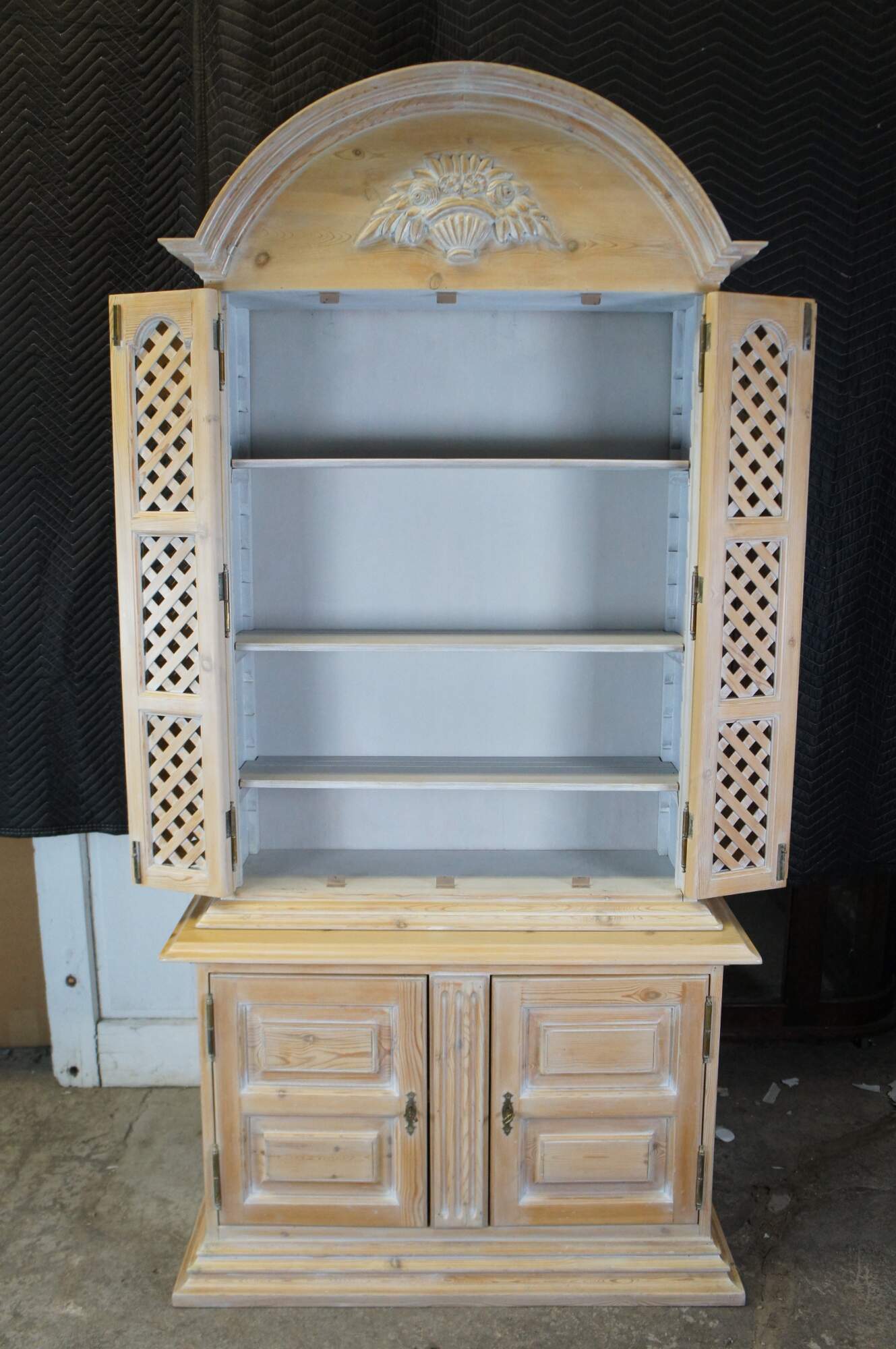 Vintage pine china hutch / vaisselier / bookcase by Chapman, circa 1980s. Features a French Country or buffet deux design with lattice doors, an arched top with floral carving and plenty of shelving for storage. Includes working keys.
