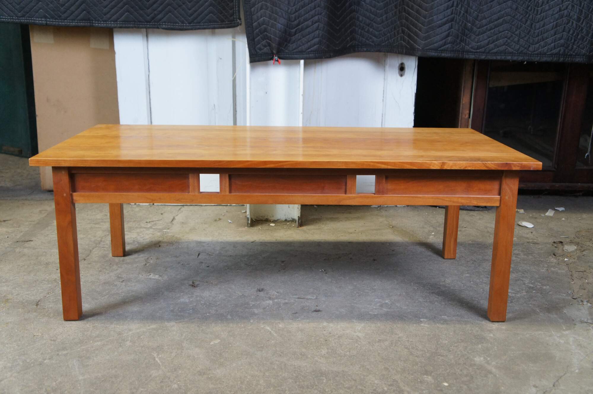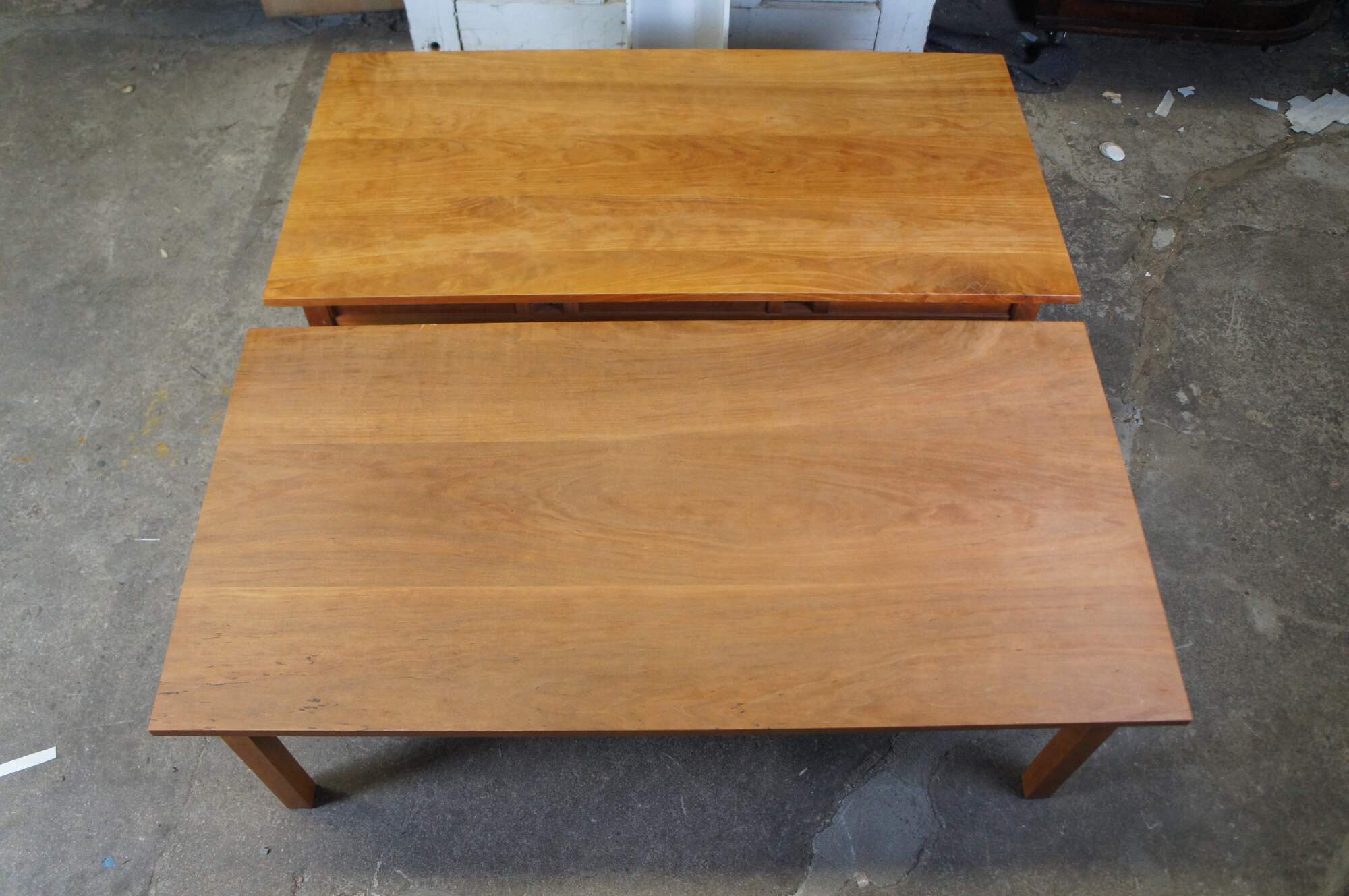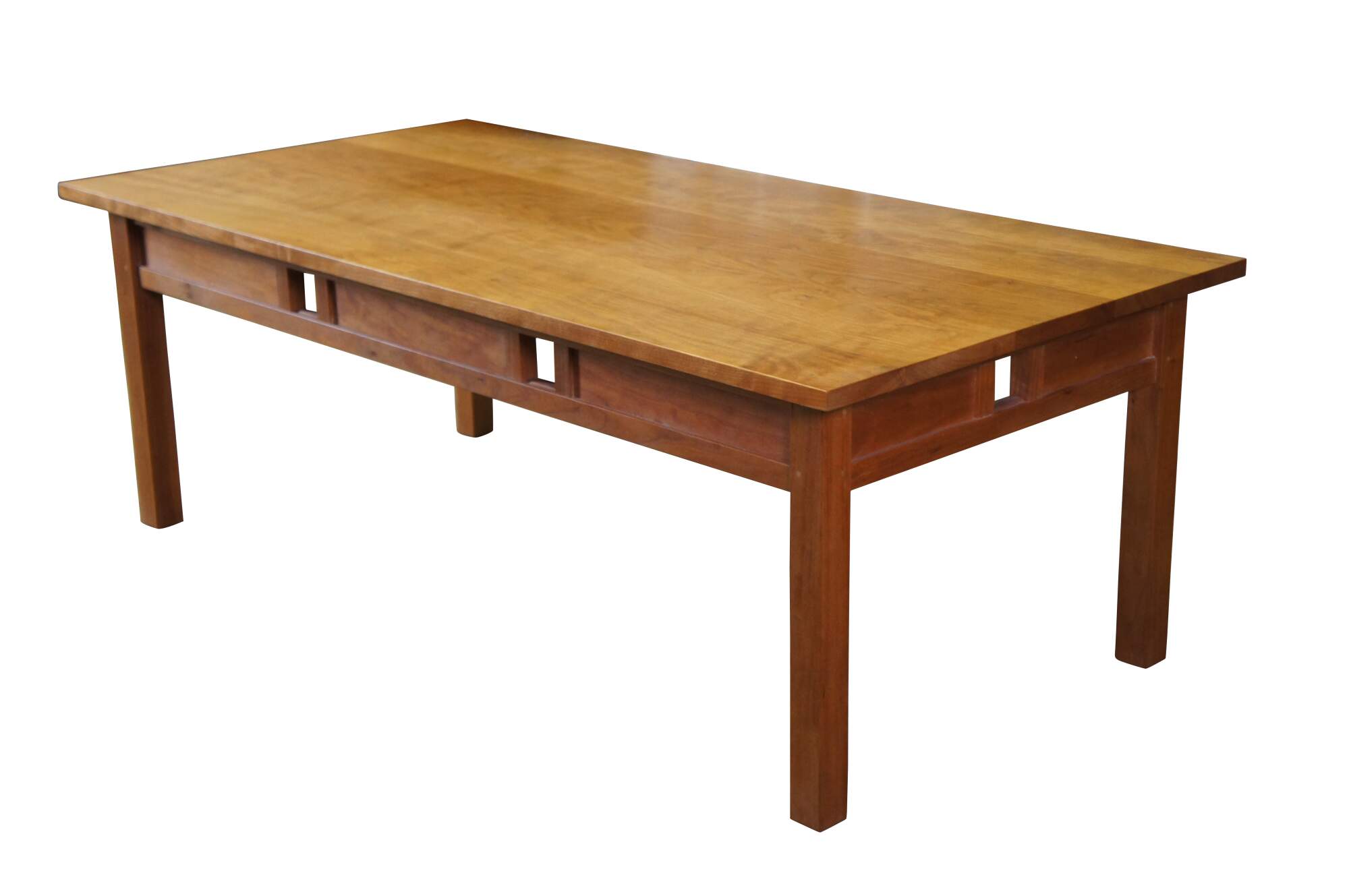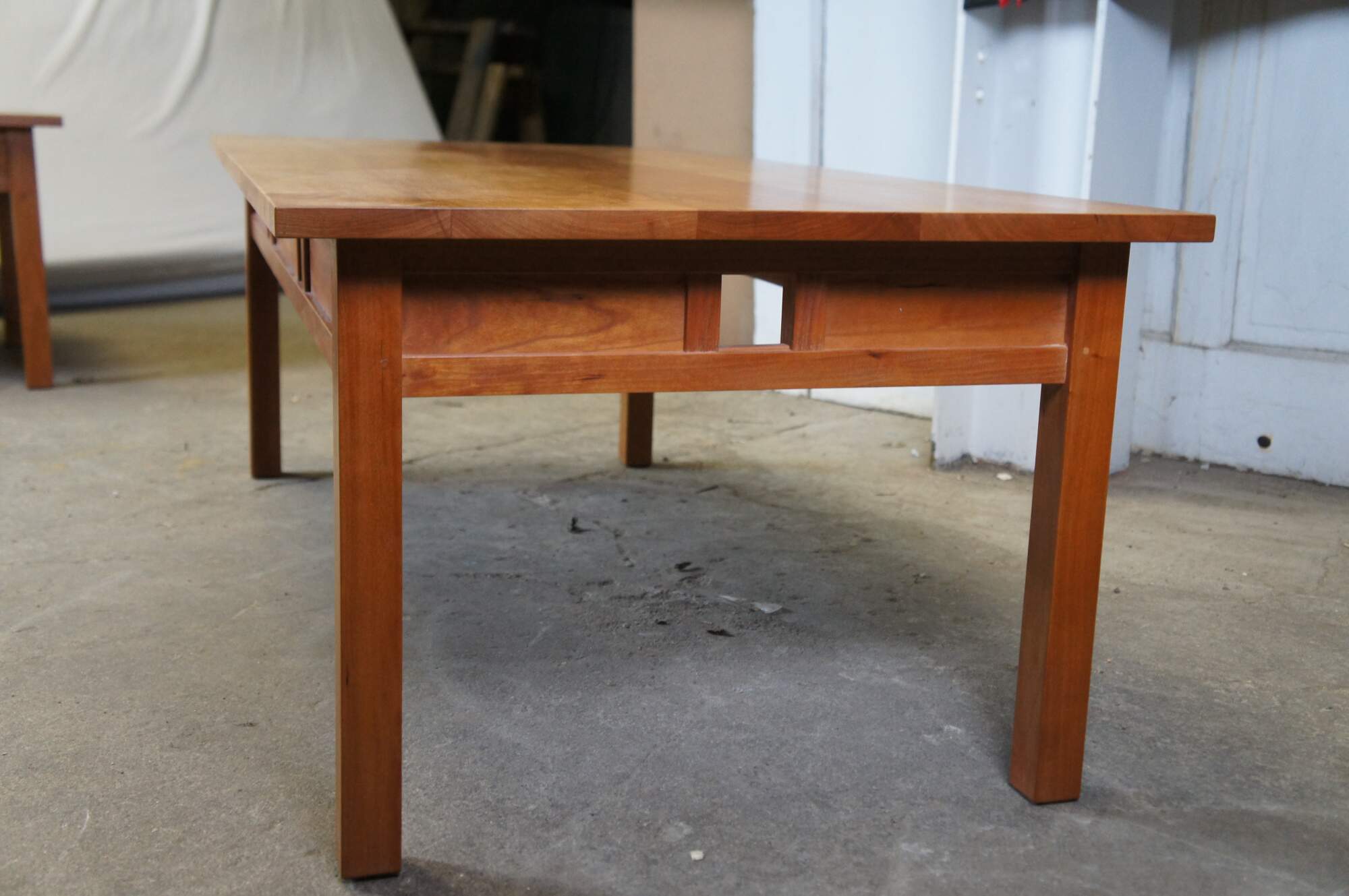 Quantity 2. Vintage Thos Moser Windward coffee or cocktail table. Made of cherry featuring mission styling with rectangular form and geometric cut-outs. Inspired by the resource-conscious practices of traditional Asian craftsmen, the Windward coffee table optimizes the use of small sections of wood, while leveraging abundant – and precise – joinery to create a strikingly linear aesthetic. The impact of both structure and space is a vital design consideration – and its application is vividly represented in the geometric shapes of the Windward coffee table. Circa 2007. Made by Robert Collins. Thomas Moser Cabinetmakers Auburn, Maine.