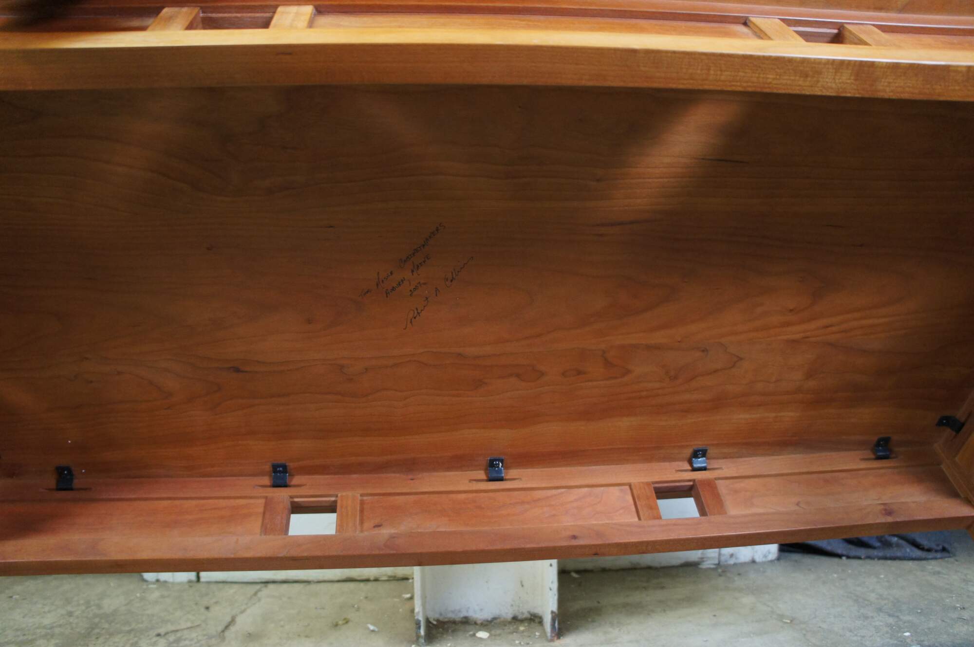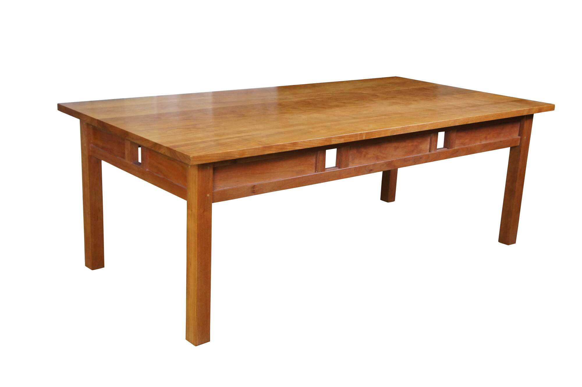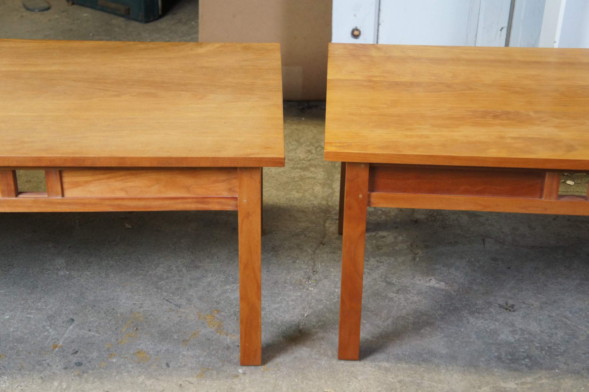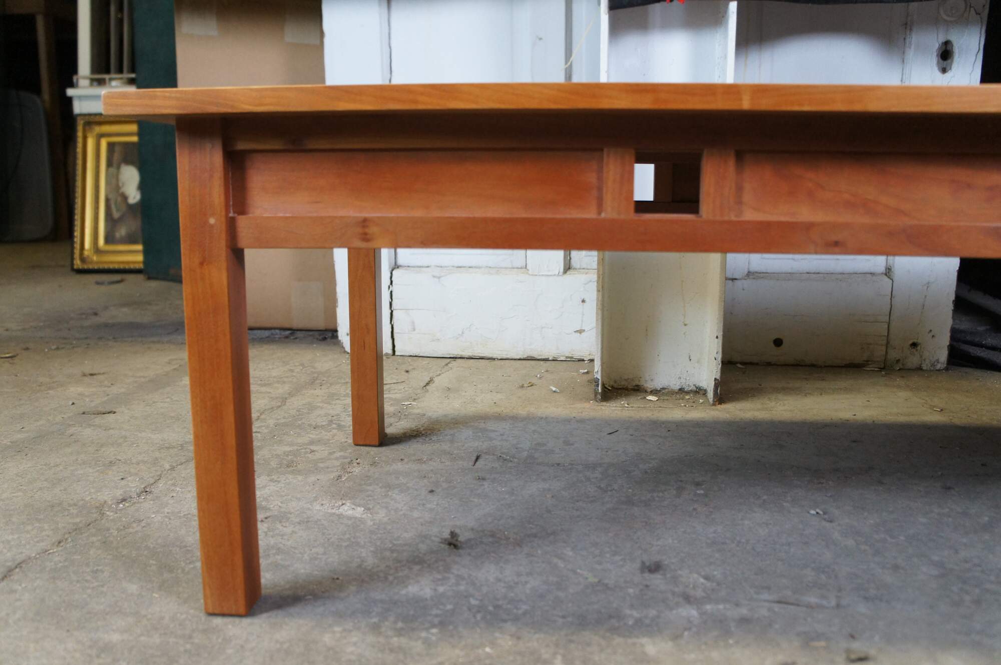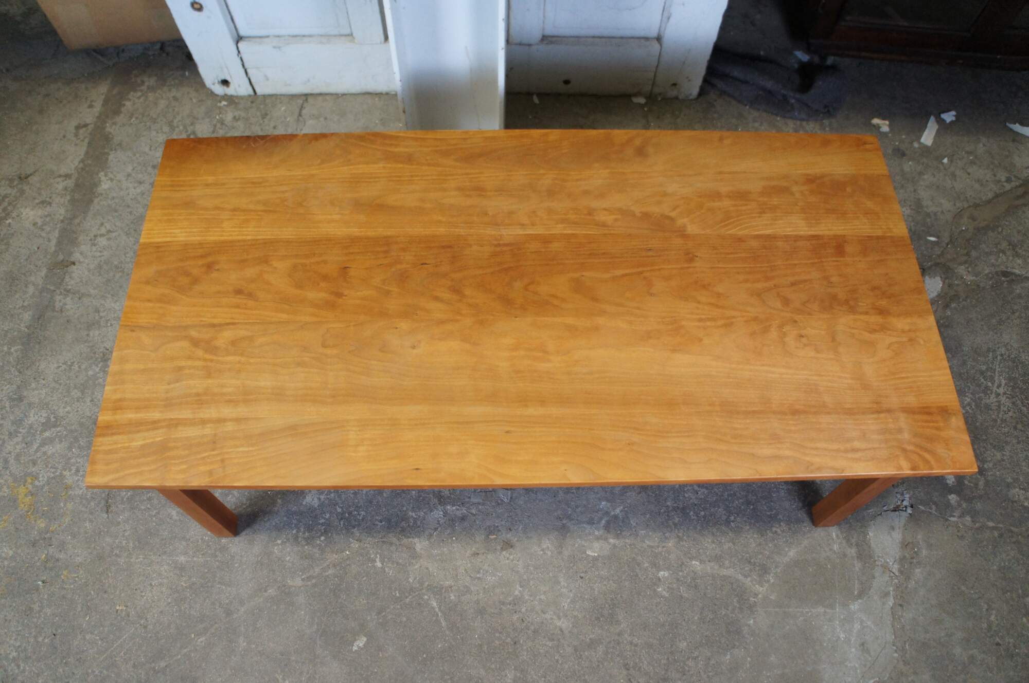 Quantity 2. Vintage Thos Moser Windward coffee or cocktail table. Made of cherry featuring mission styling with rectangular form and geometric cut-outs. Inspired by the resource-conscious practices of traditional Asian craftsmen, the Windward coffee table optimizes the use of small sections of wood, while leveraging abundant – and precise – joinery to create a strikingly linear aesthetic. The impact of both structure and space is a vital design consideration – and its application is vividly represented in the geometric shapes of the Windward coffee table. Circa 2007. Made by Robert Collins. Thomas Moser Cabinetmakers Auburn, Maine.