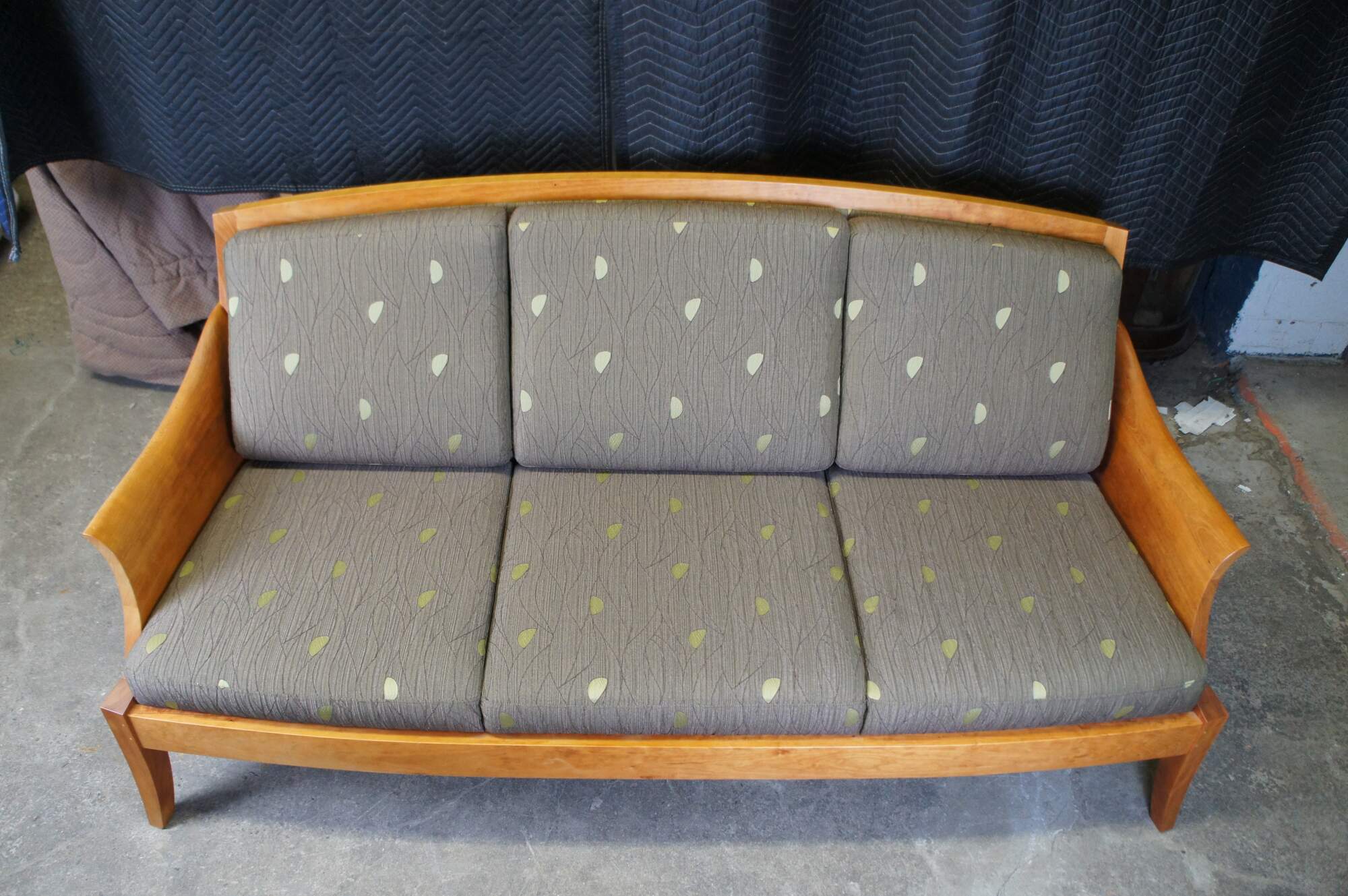 Vintage Thos Moser cherry Three Place Wing Sofa. With curved arms sculpted from grain matched solid wood, the Wing Three Place Sofa marries our handcraft and hallmark aesthetics with true comfort. Tracing its lineage back to an 18th-century Queen Anne chair, the sofa brings new relevance to old forms, coaxing solid cherry into freestanding art. The Wing Three Place Sofa is the satisfying result of artfully integrating both wood and upholstery to create a piece that both complements and defines the space it occupies. Made by Jasper Brann circa 2007. Thomas Moser Cabinetmakers Auburn, Maine.