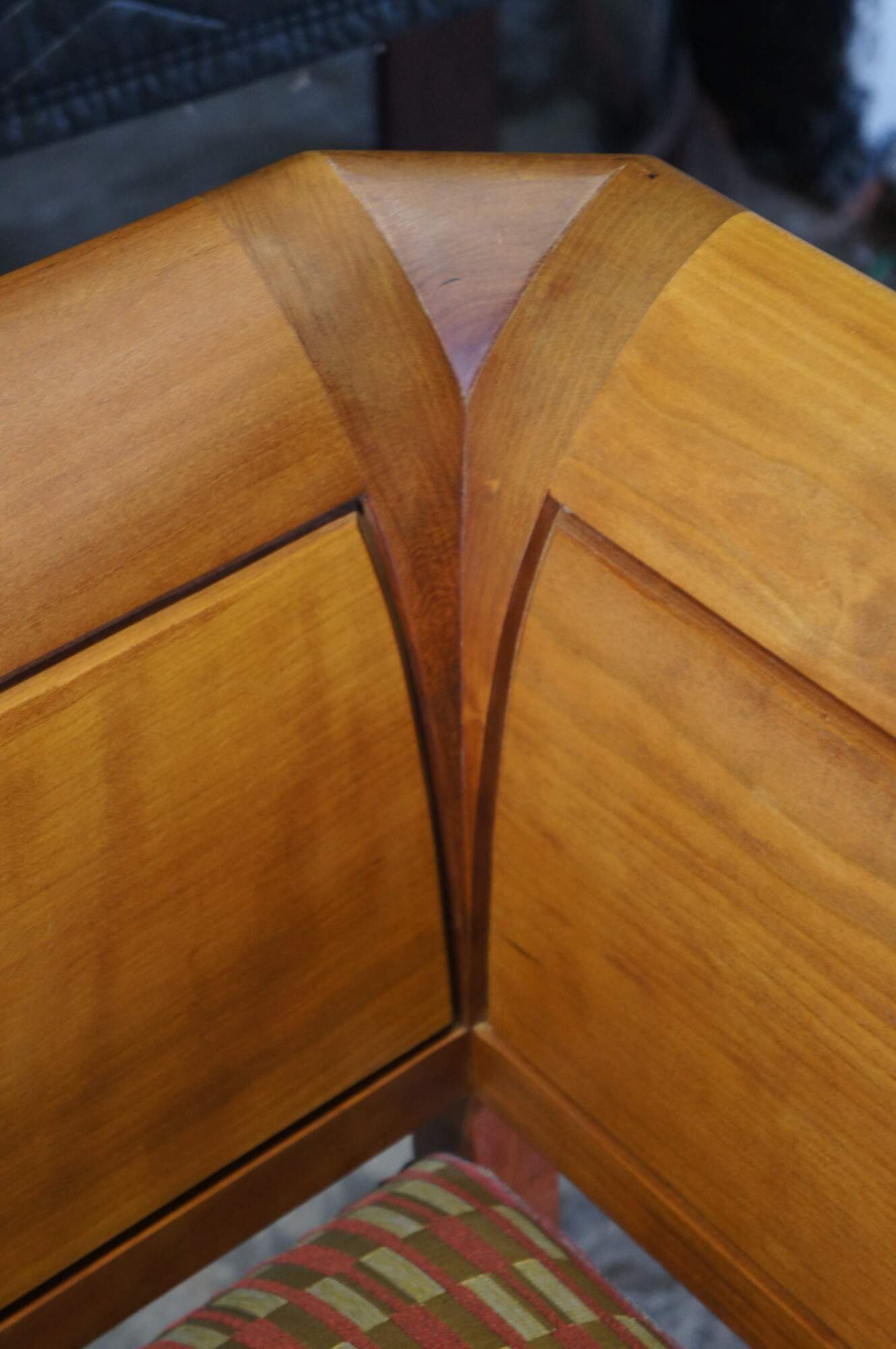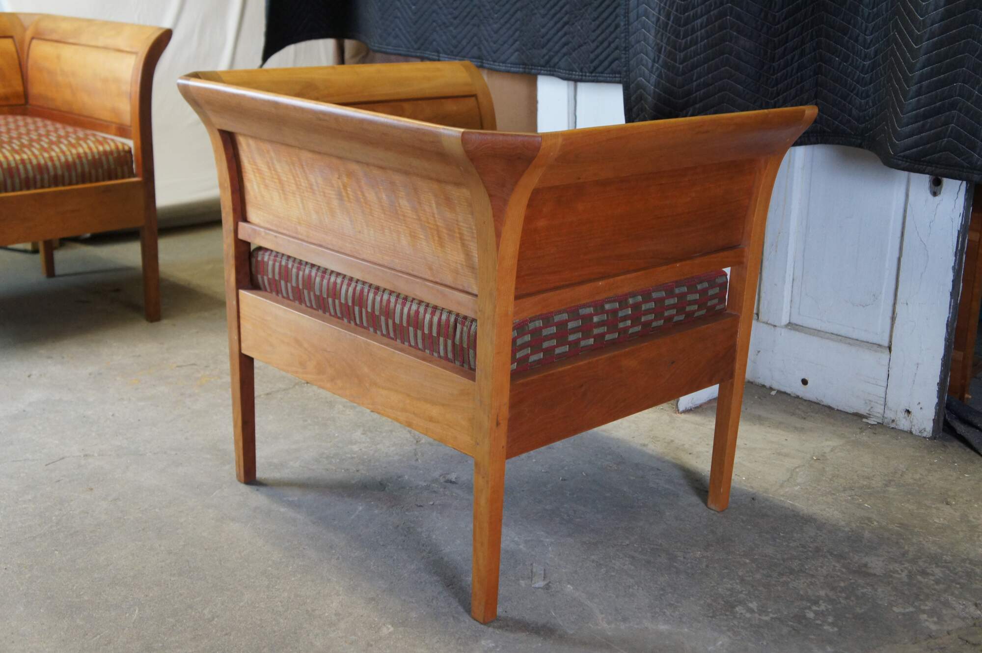 Two vintage large Thos Moser Sofia office / lounge armchairs. Made of cherry featuring modern styling with square and flared form, and paneled accents. Perhaps no other piece we've designed better celebrates the natural glory of cherry and our desire to create objects of timeless grace than the Sofia chair. One's eye is drawn along the swirling cherry patterns of its side panels to the darker, delicately tapered corner joint framed between. The long cherry panels and wine-glass-shaped corner joints remind us of the graceful lines of an old wooden boat transom. Circa 2007. Signed on base. Thomas Moser Cabinetmakers Auburn, Maine.
