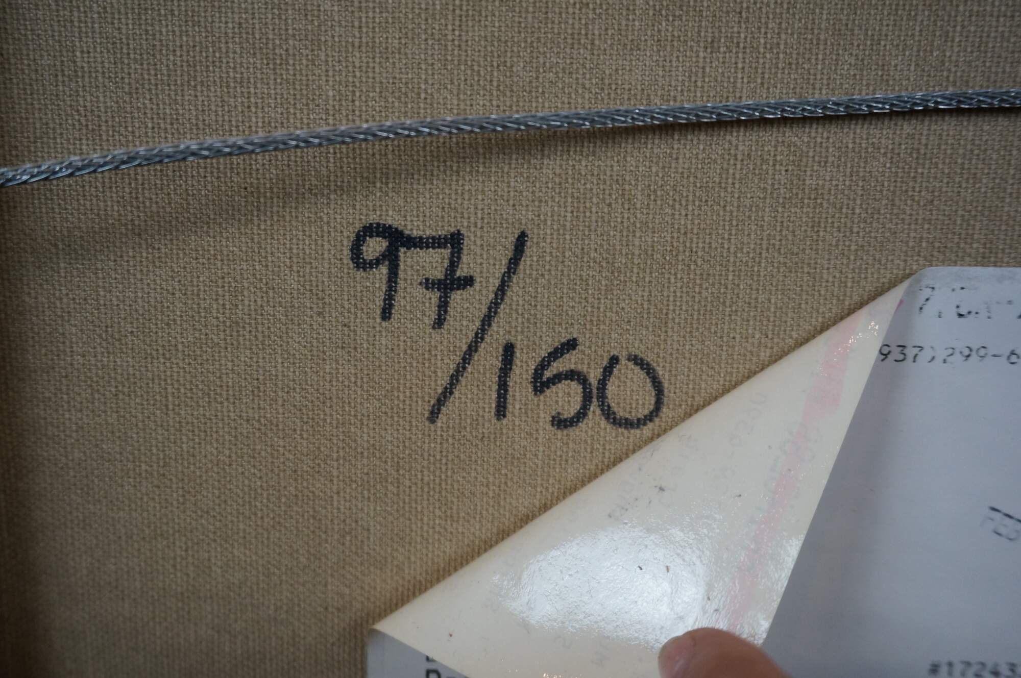 Embellished serigraph print on canvas titled "Our Serenade" by David Schluss. Signed in lower left. Numbered 97/150 on reverse. Textured giltwood frame; white linen mat; includes artwork picture light.