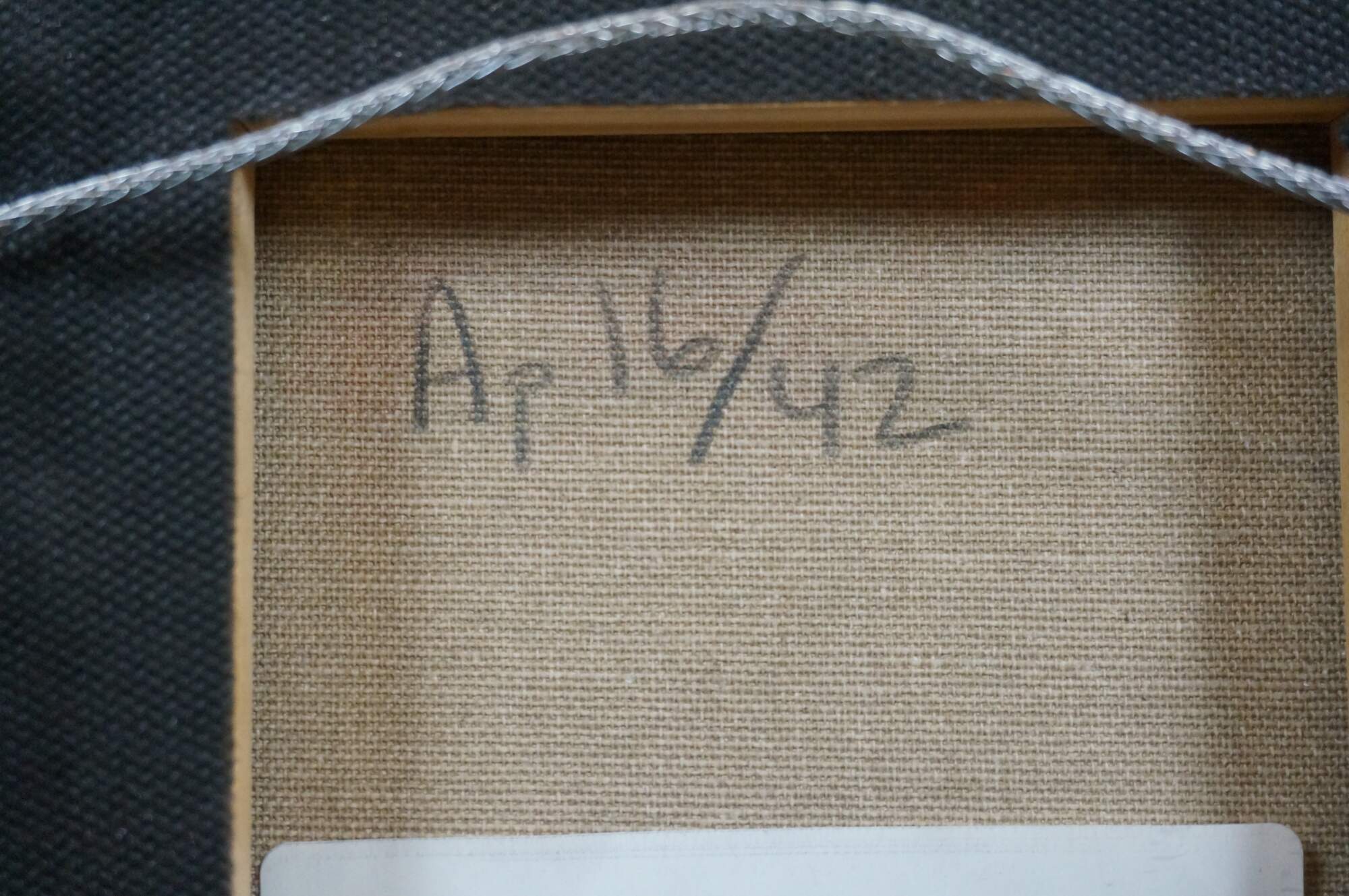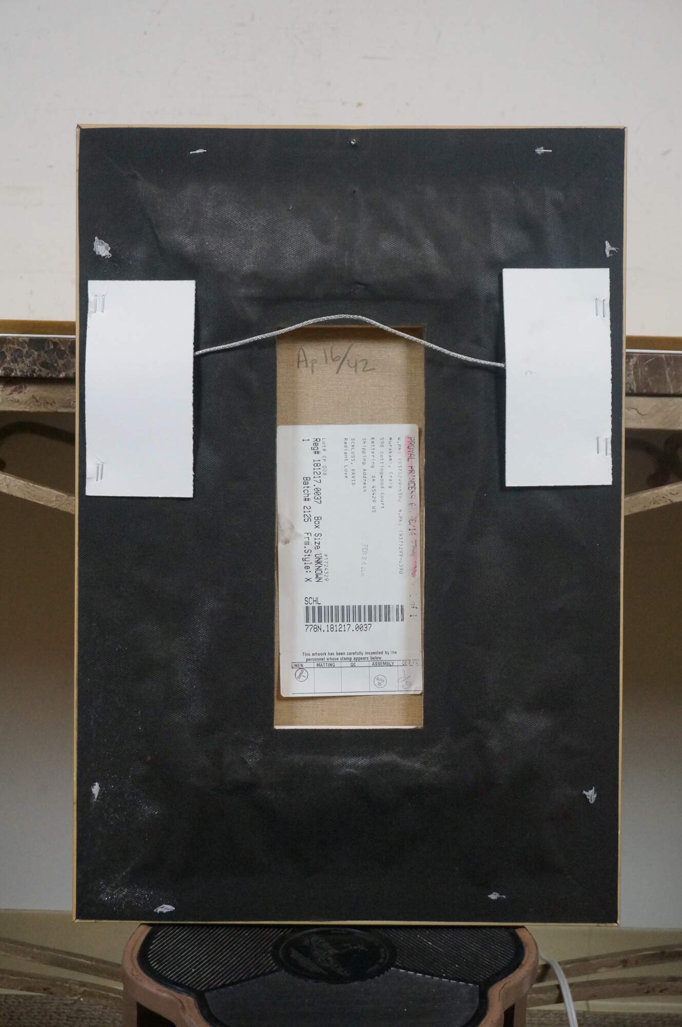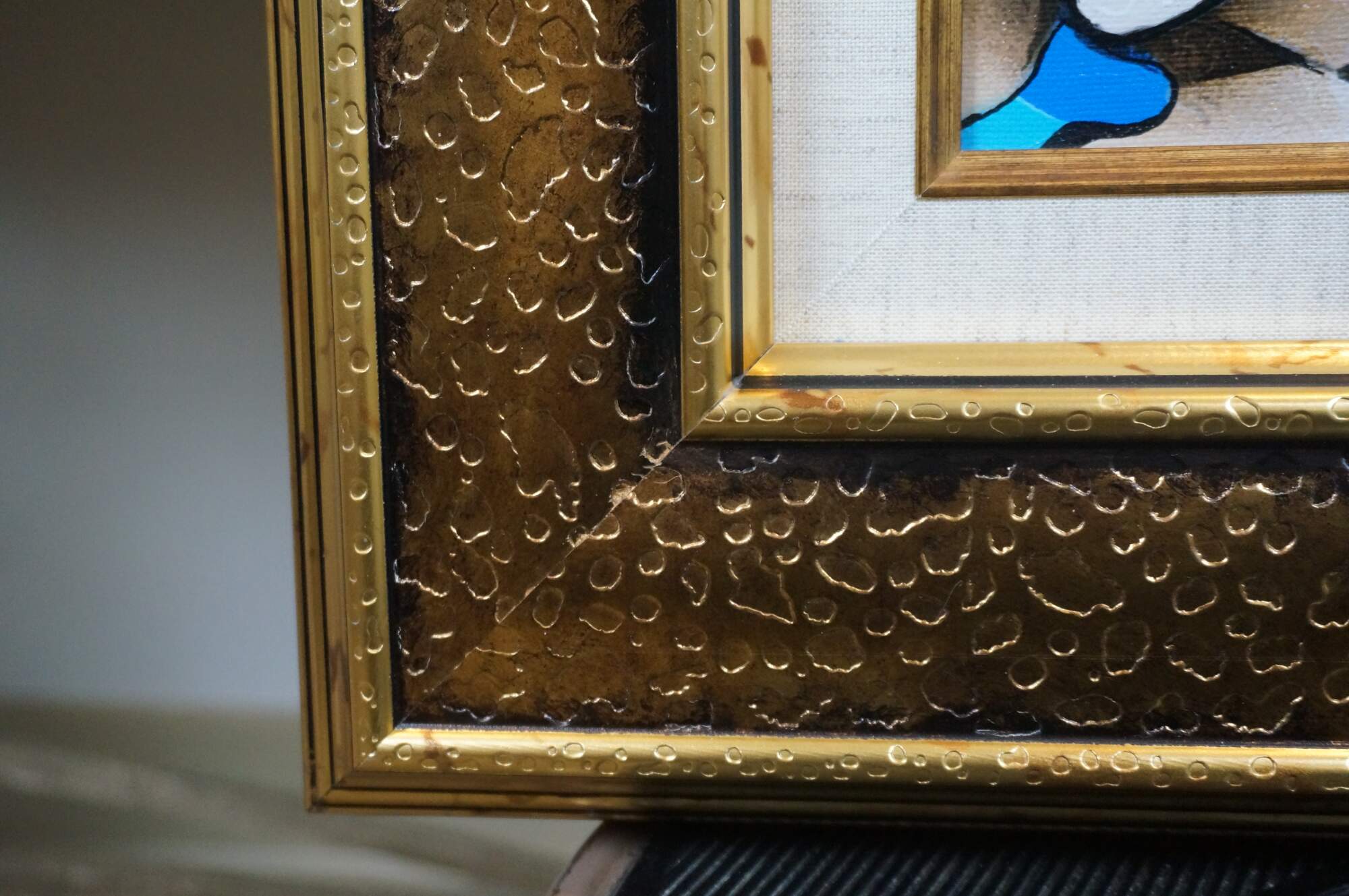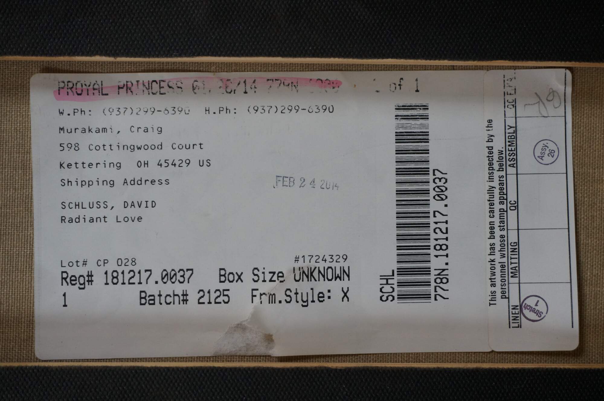 2014 artist's proof embellished serigraph print on canvas titled "Radiant Love" by David Schluss. Signed in lower right. Numbered AP 16/42 on reverse. Textured giltwood frame; white linen mat.