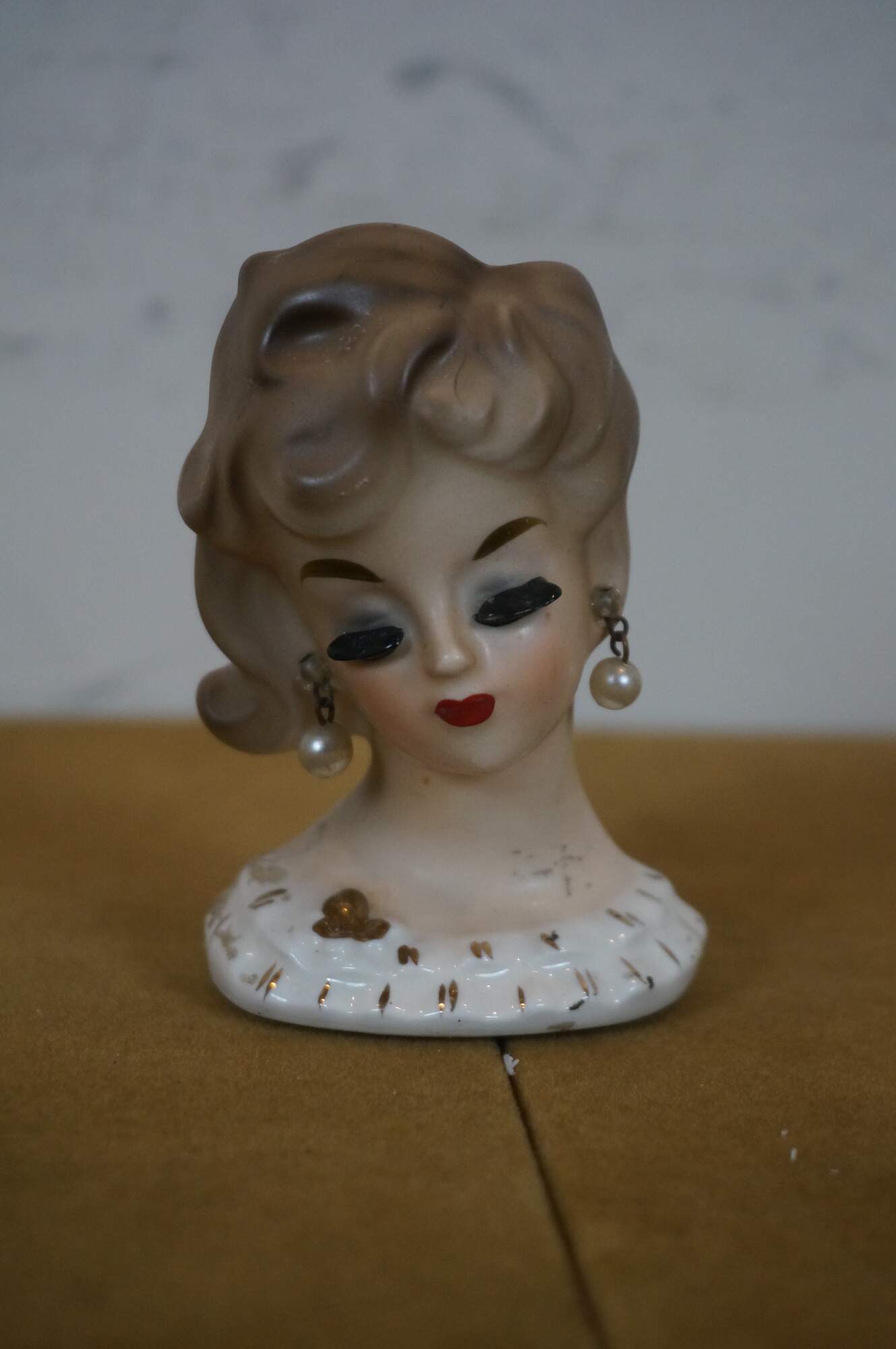Set of three 1950s-1960s porcelain head vases attributed to Napco / National Potteries Company of Cleveland, Ohio, depicting three different stylish ladies, one with closed eyes and pearl earrings, one with closed eyes, raised glove and hat, and one with 60s eyeliner and ascot. Smallest explicitly marked with the Napco name and sticker. One marked 4071 and one with Japan sticker.