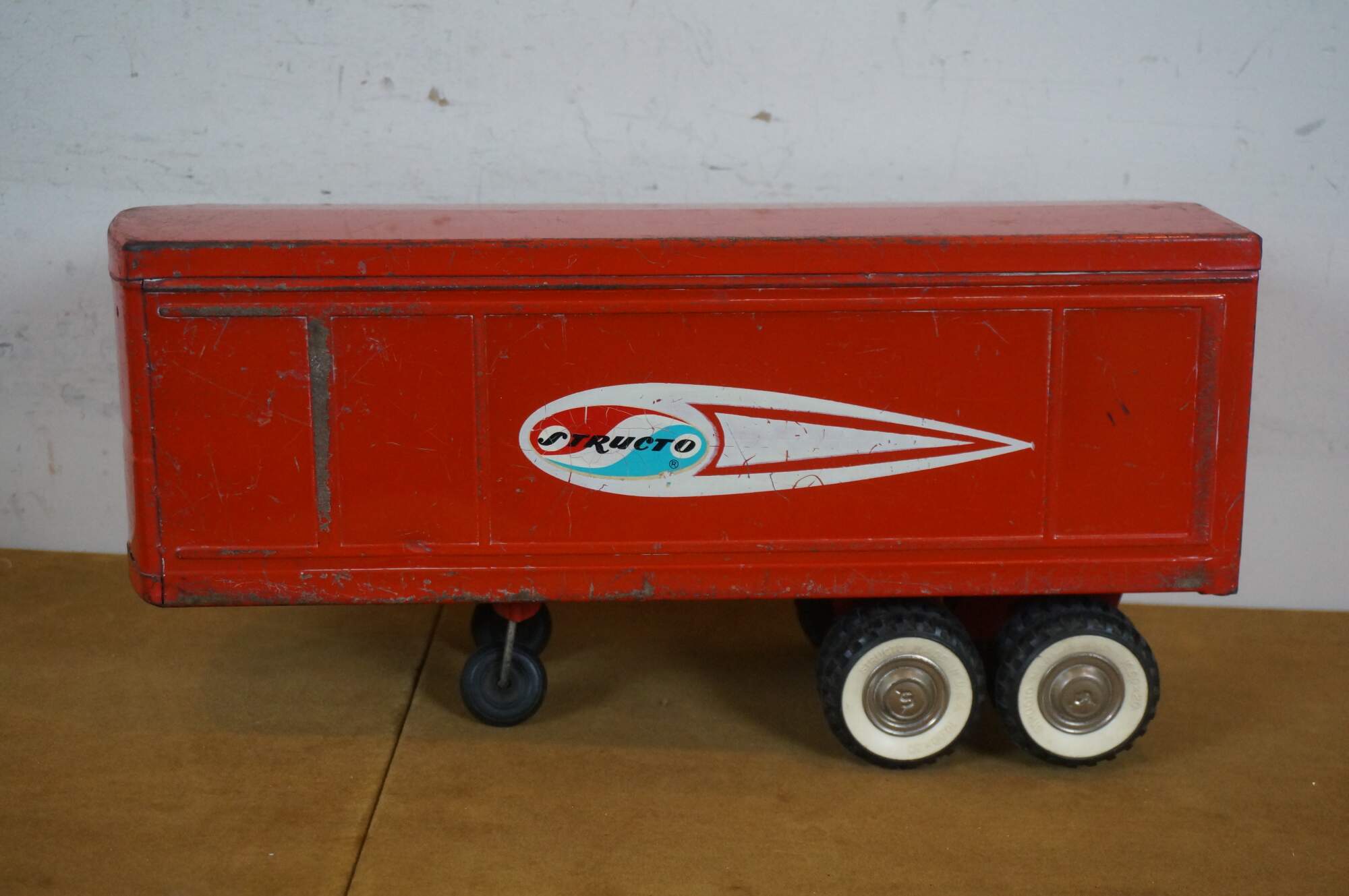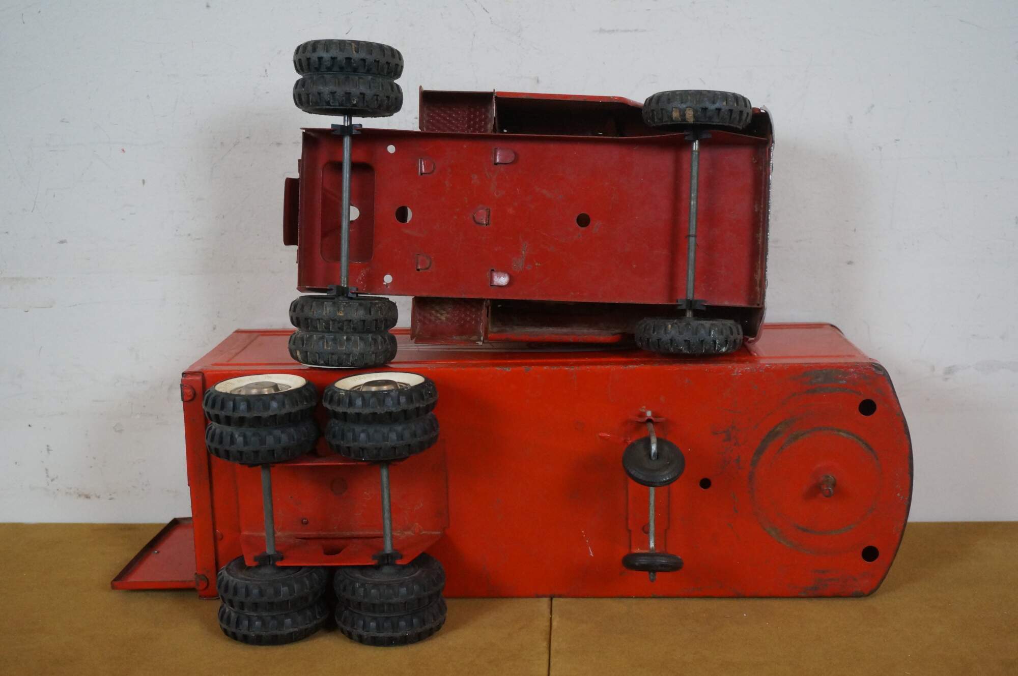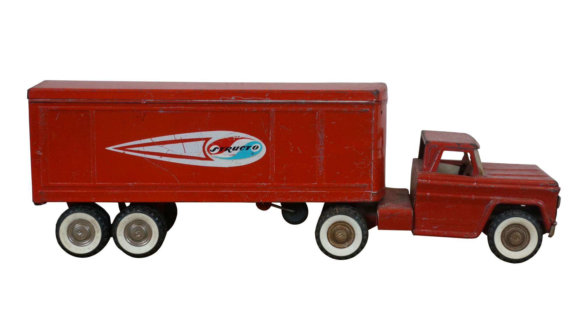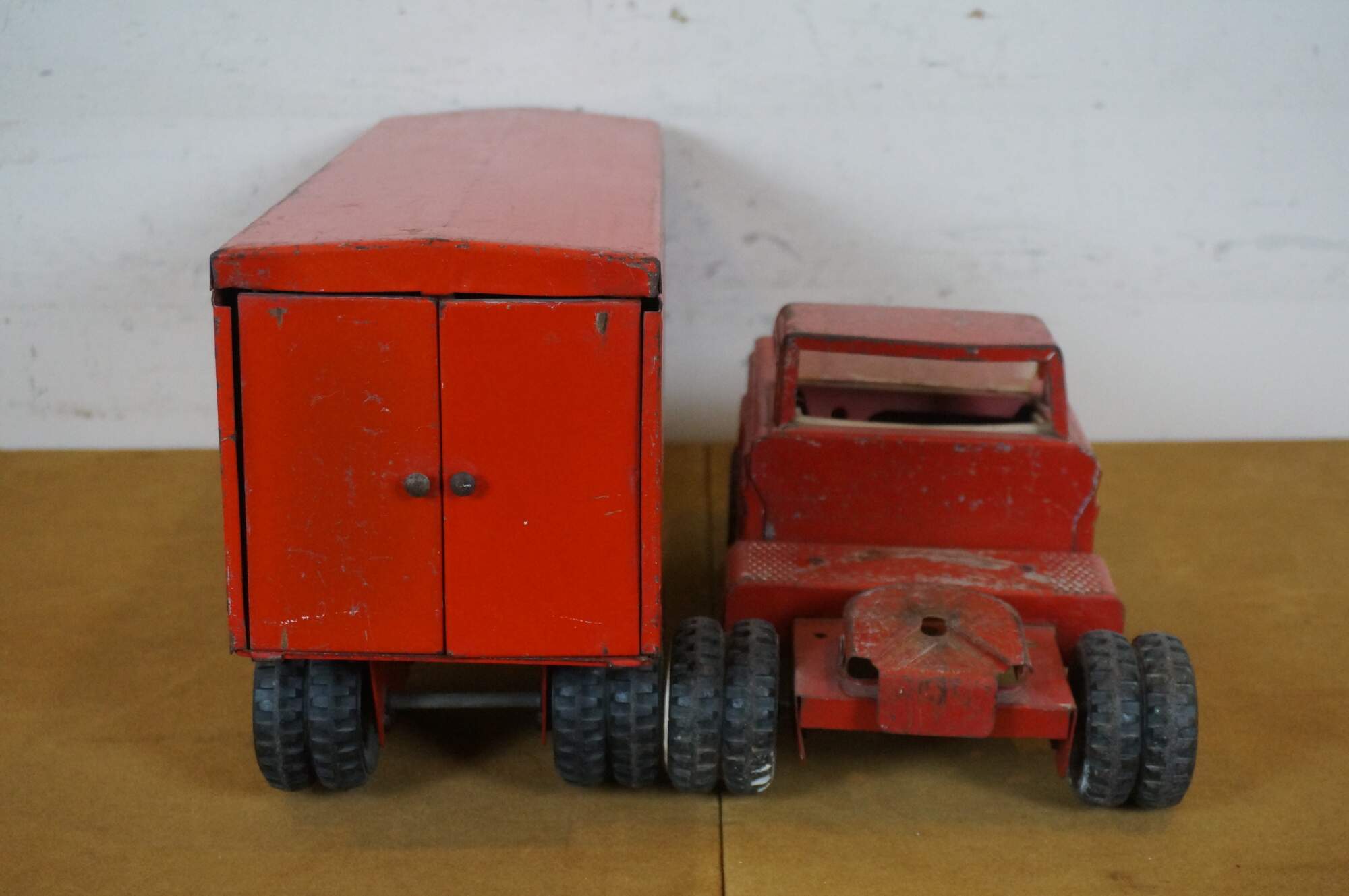 Mid century Structo red pressed steel semi truck / tractor trailer with solid rubber tires.