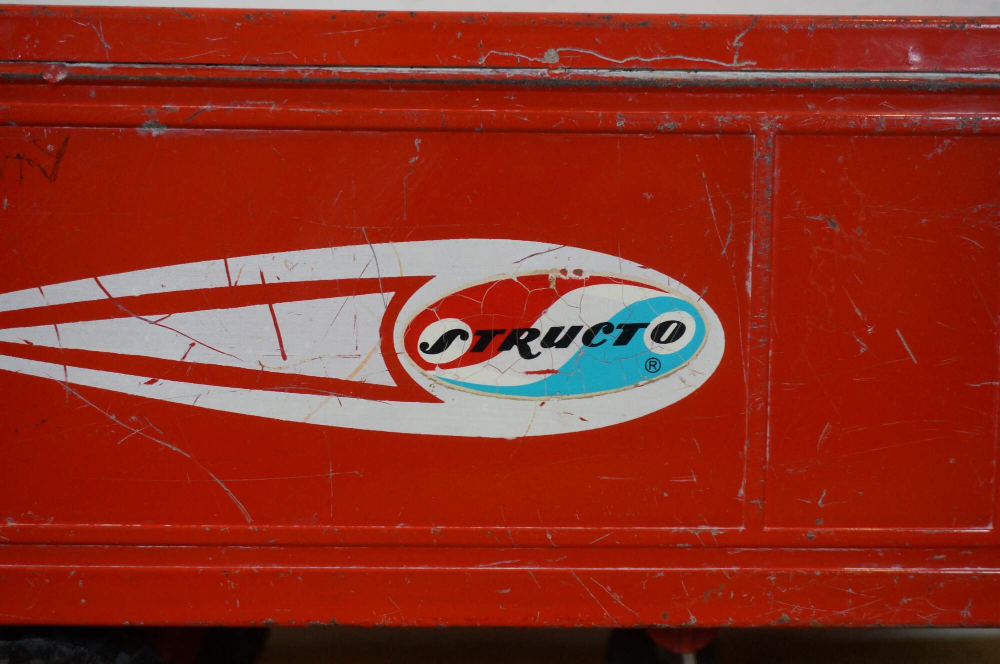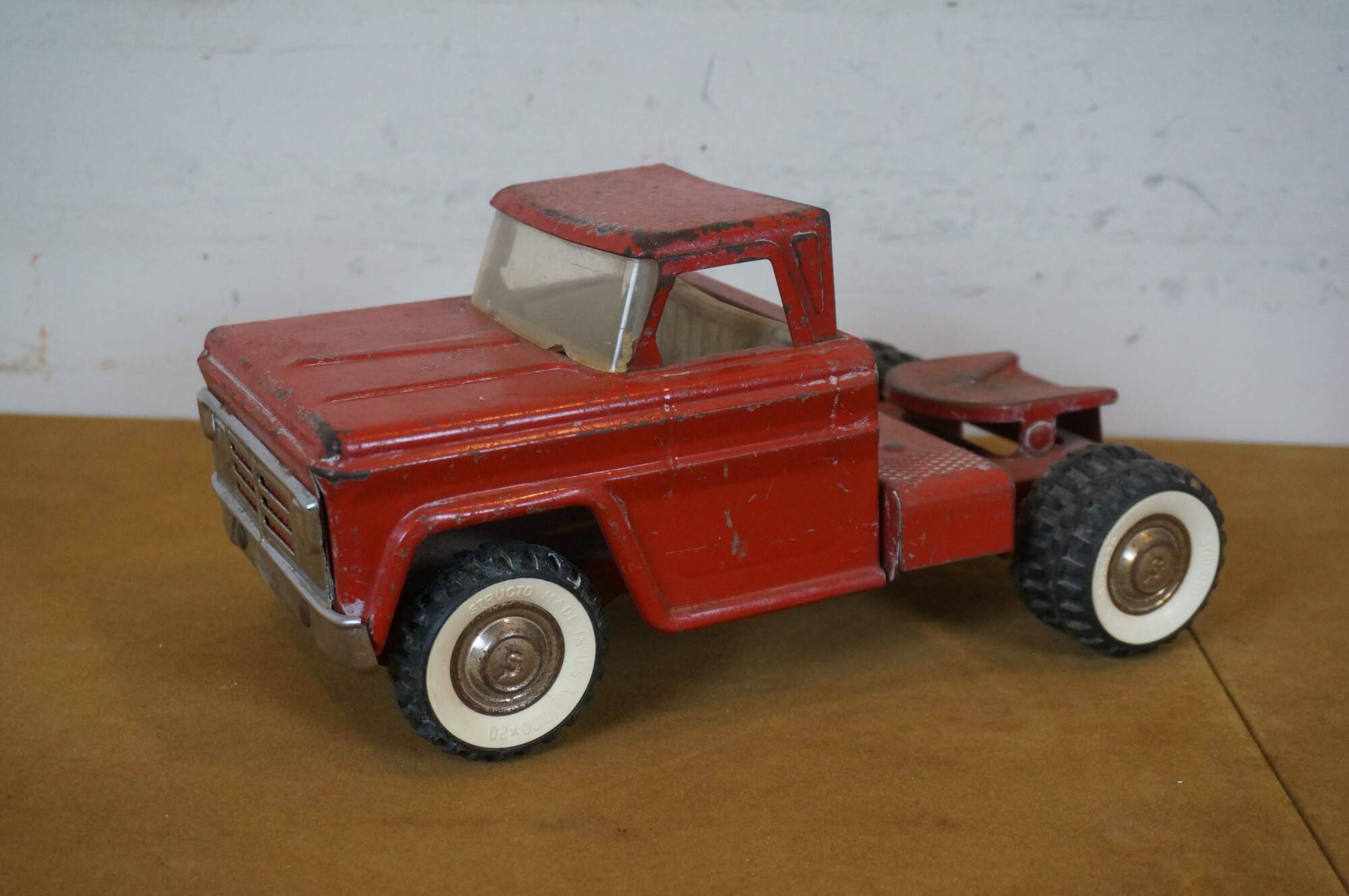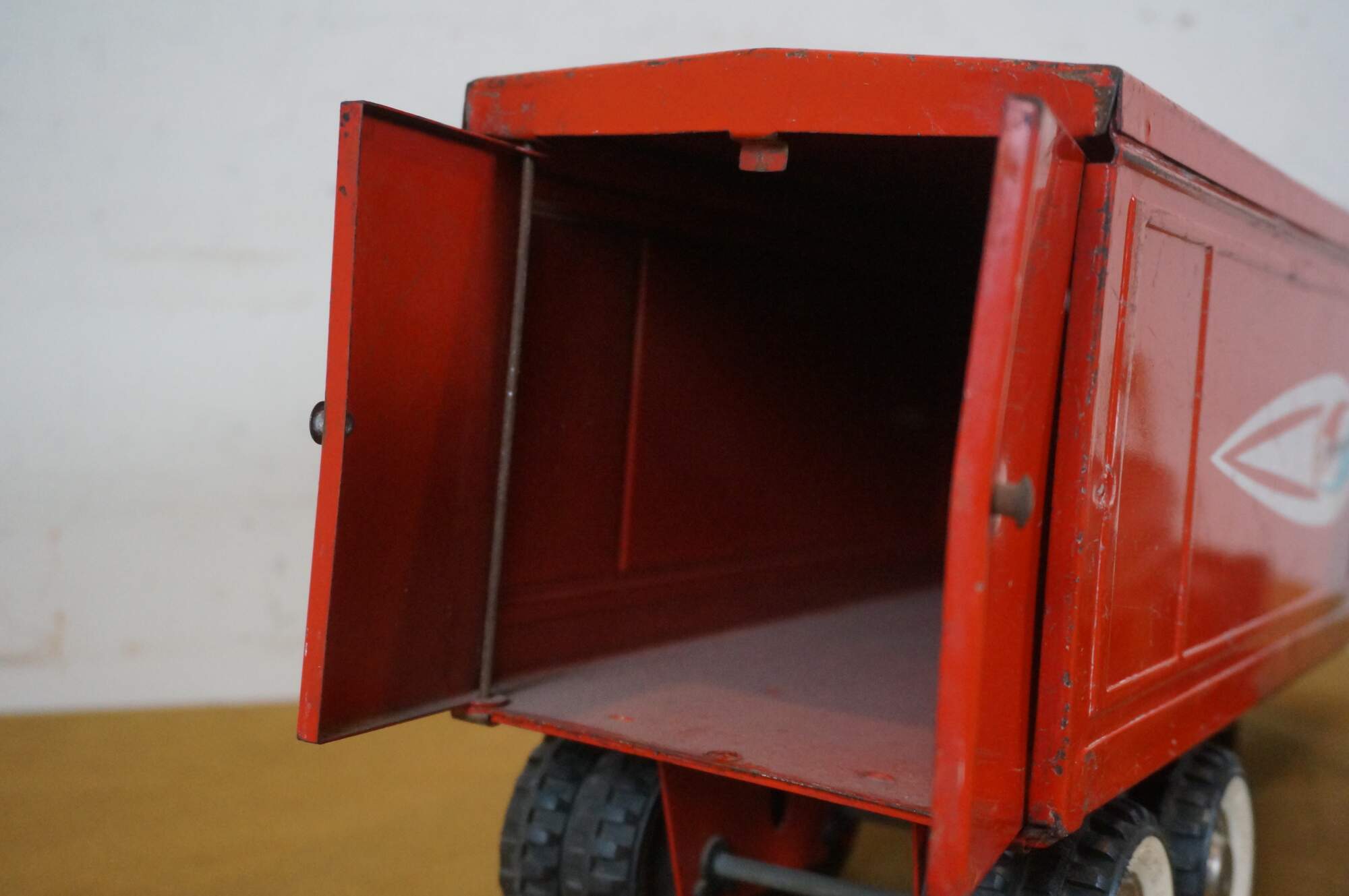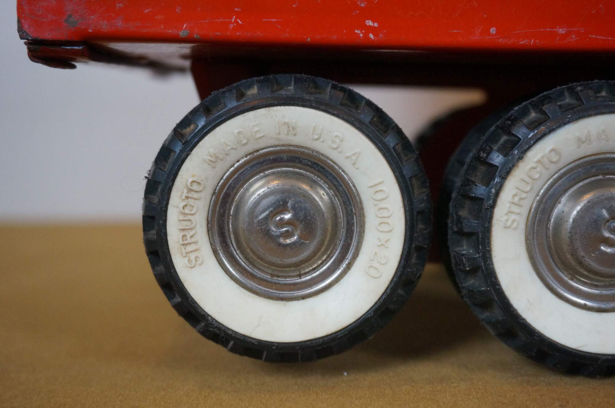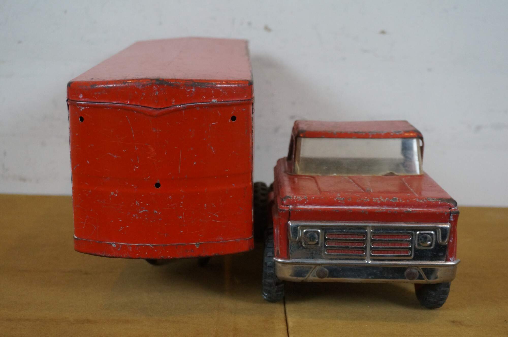 Mid century Structo red pressed steel semi truck / tractor trailer with solid rubber tires.