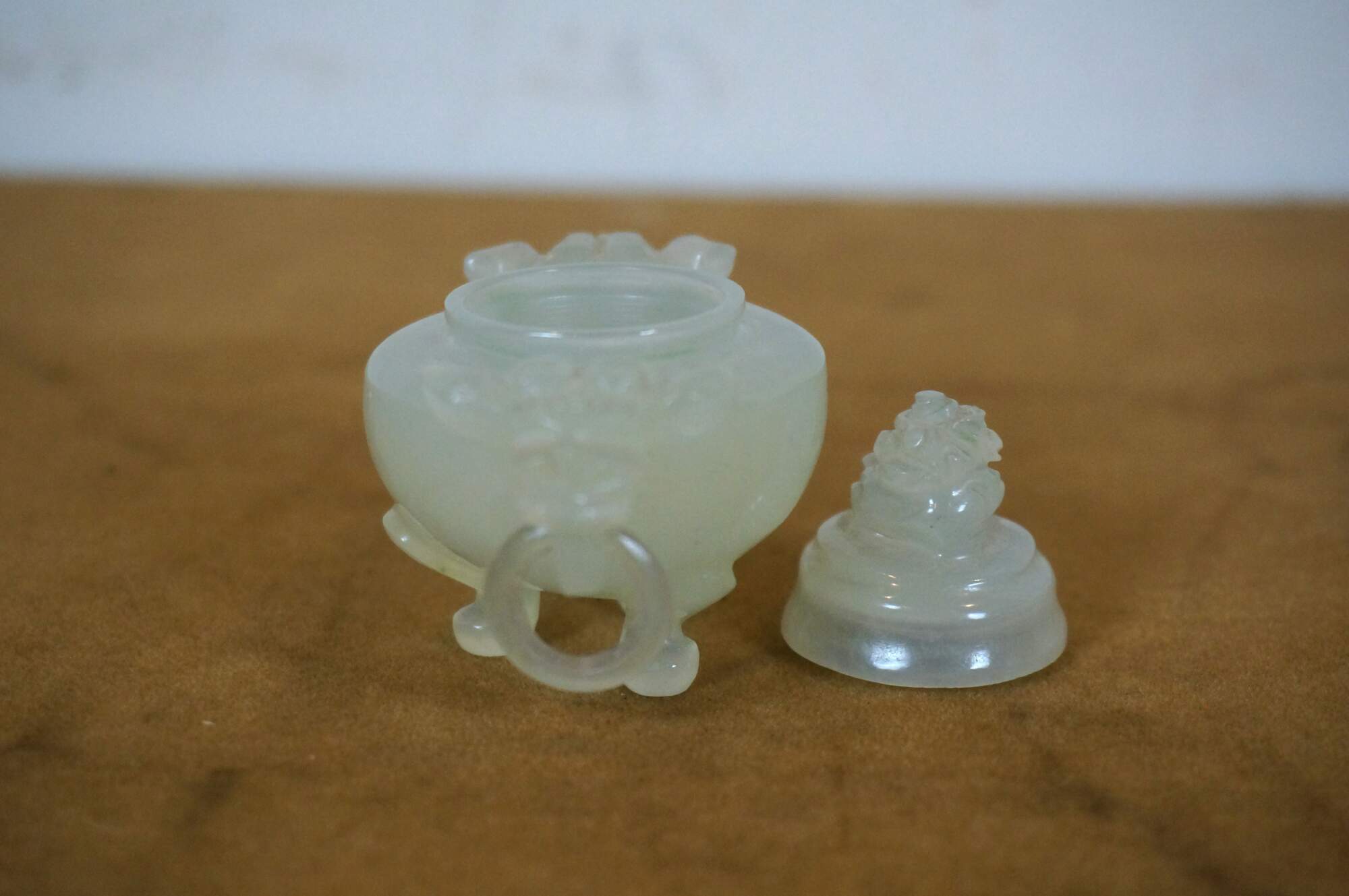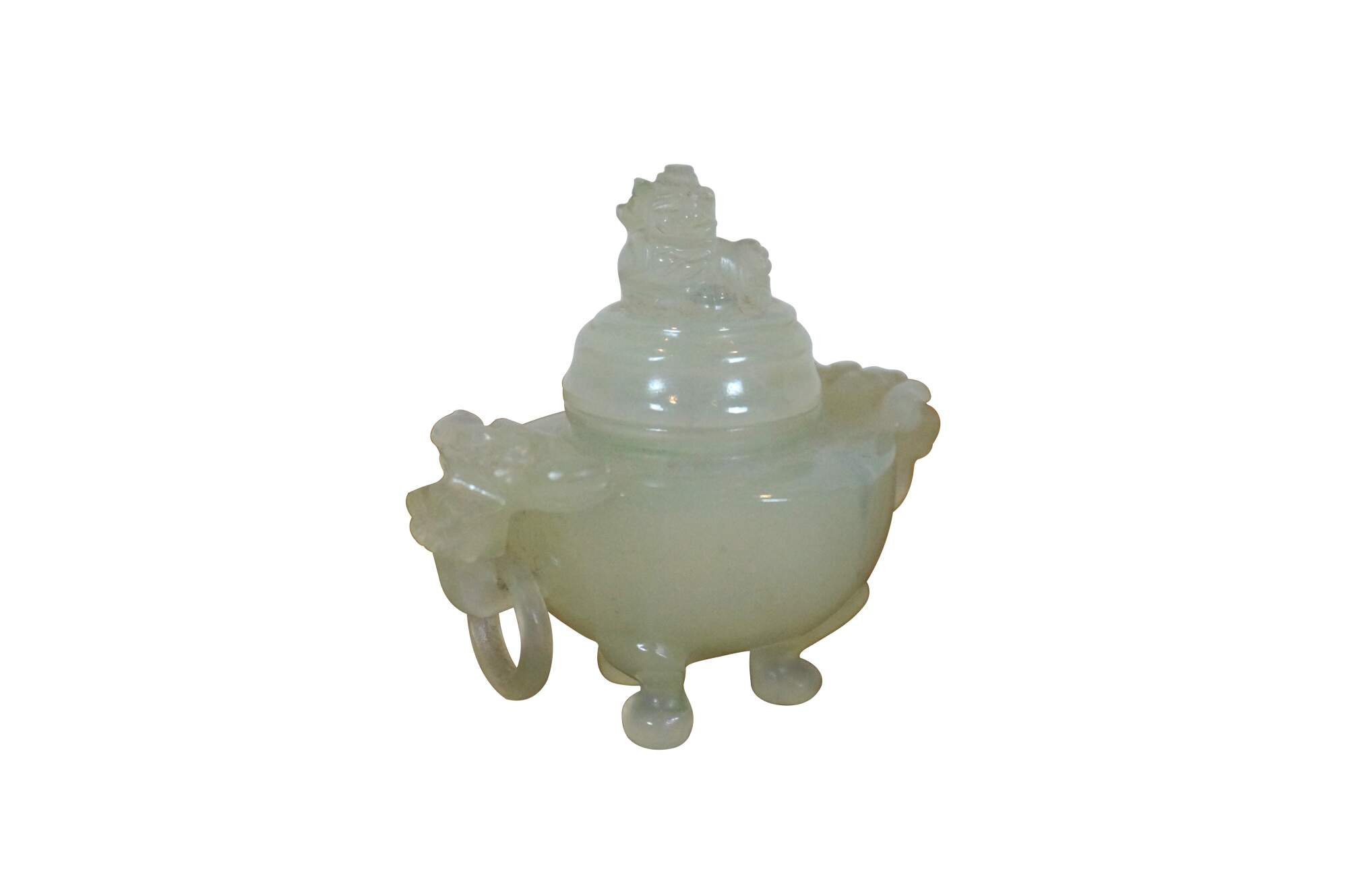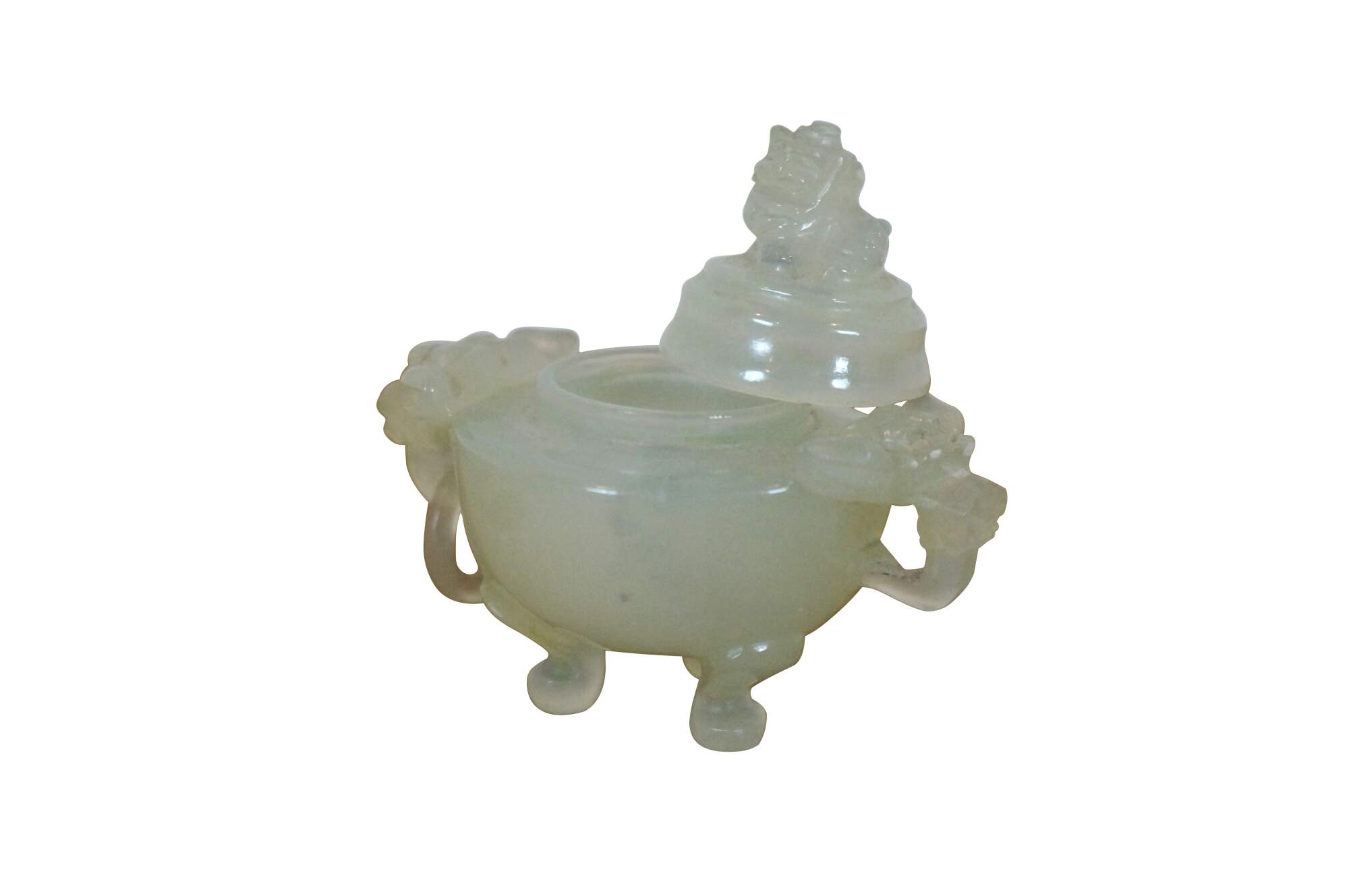 Vintage 20th century Chinese carved white jade censer / small lidded incense jar. Round form with three pad feet, dragon's head handles (one with a ring in its mouth) and a fu / foo dog / guardian lion finial on the lid. Includes padded box.