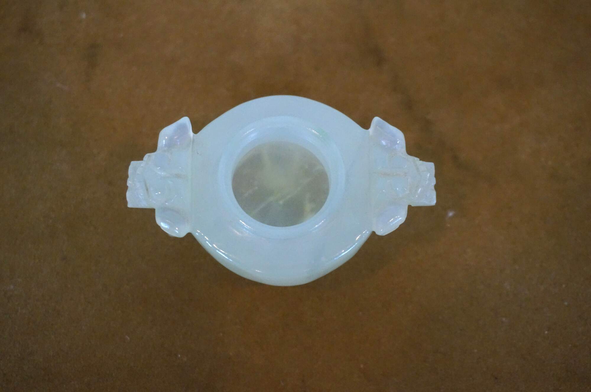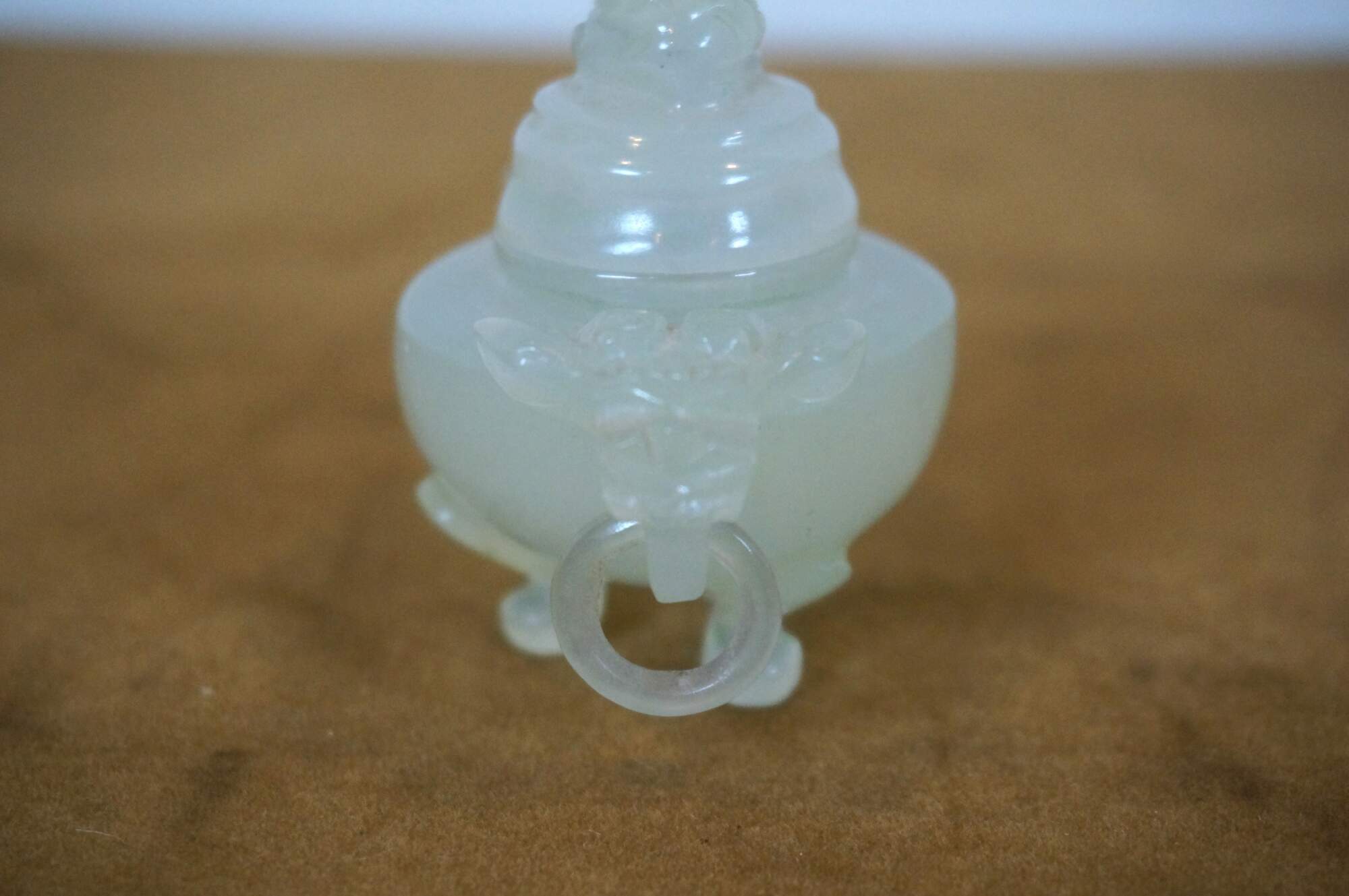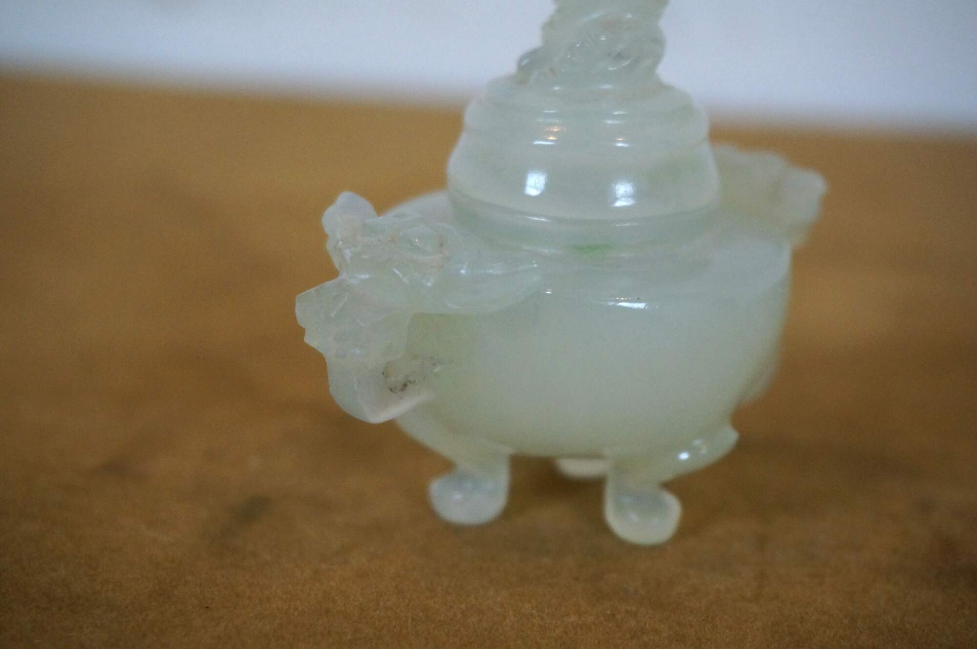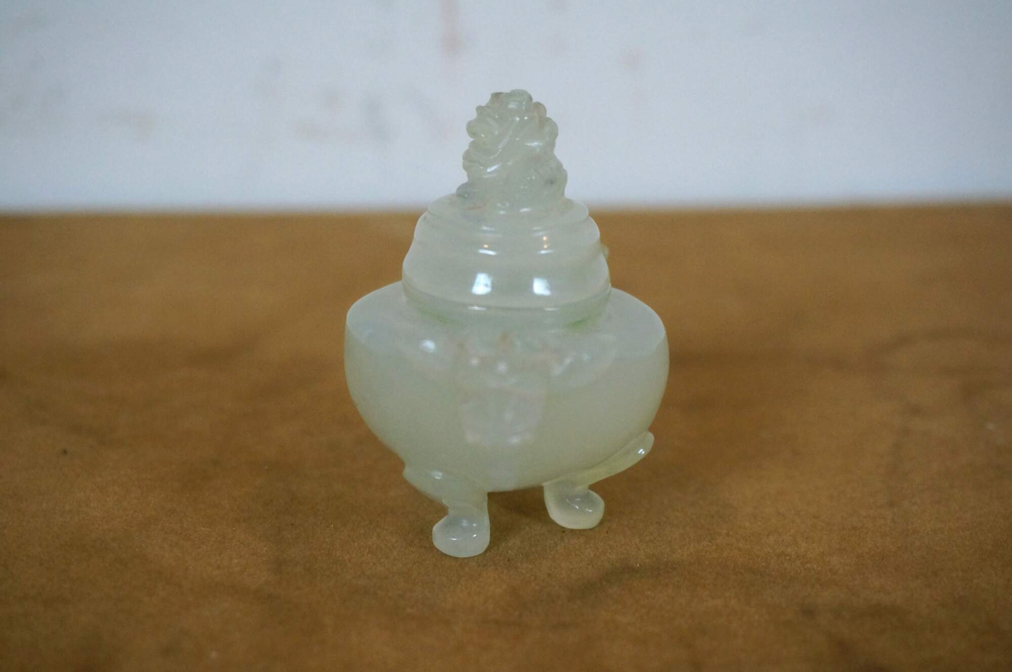 Vintage 20th century Chinese carved white jade censer / small lidded incense jar. Round form with three pad feet, dragon's head handles (one with a ring in its mouth) and a fu / foo dog / guardian lion finial on the lid. Includes padded box.