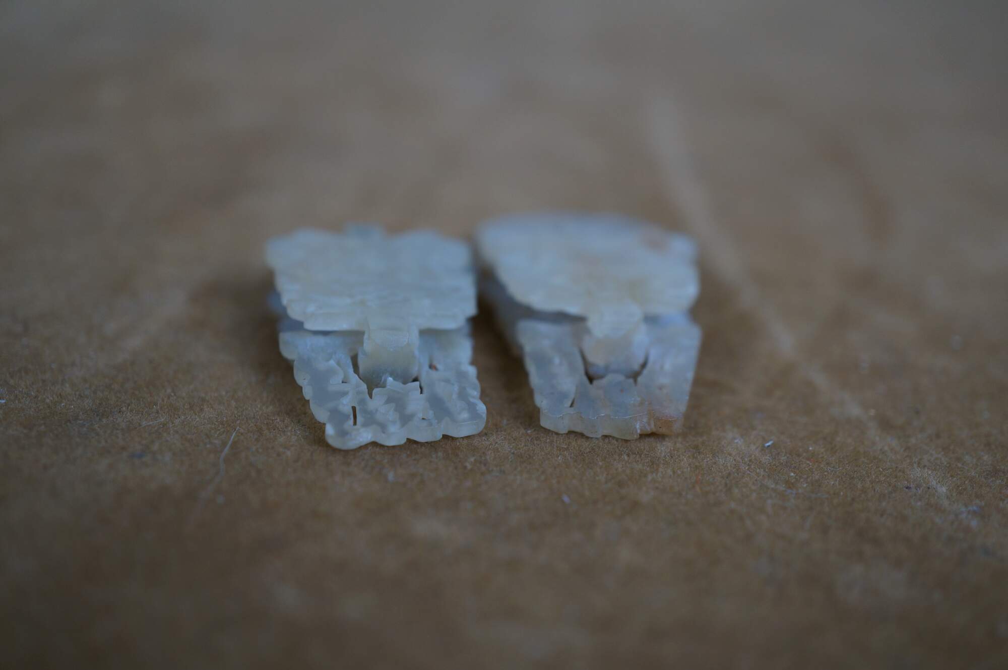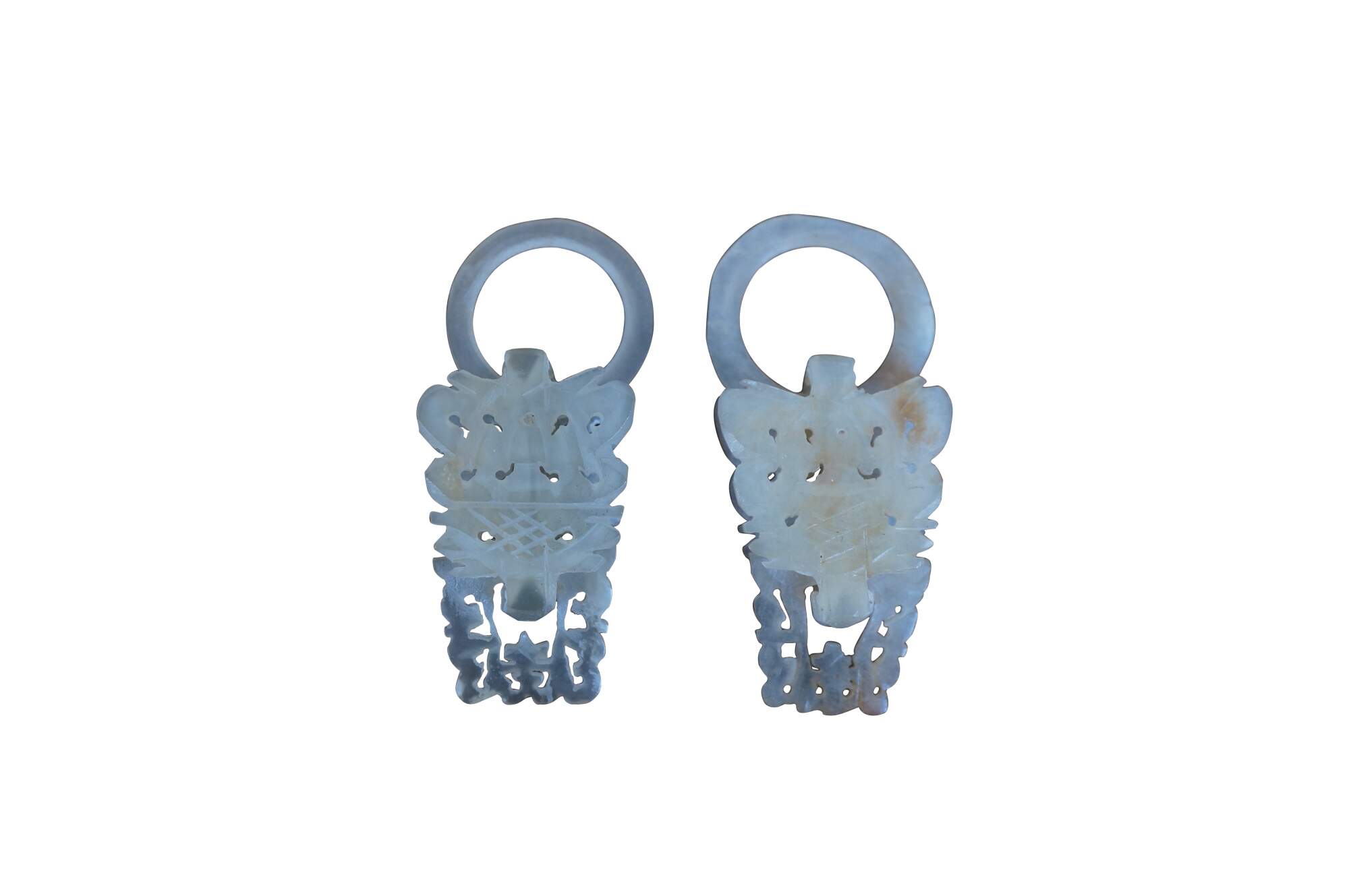 Pair of delicately carved Chinese white jade devil's work filigree pendant charms, ready to be made into a necklace or earrings. Includes yellow silk pouch.