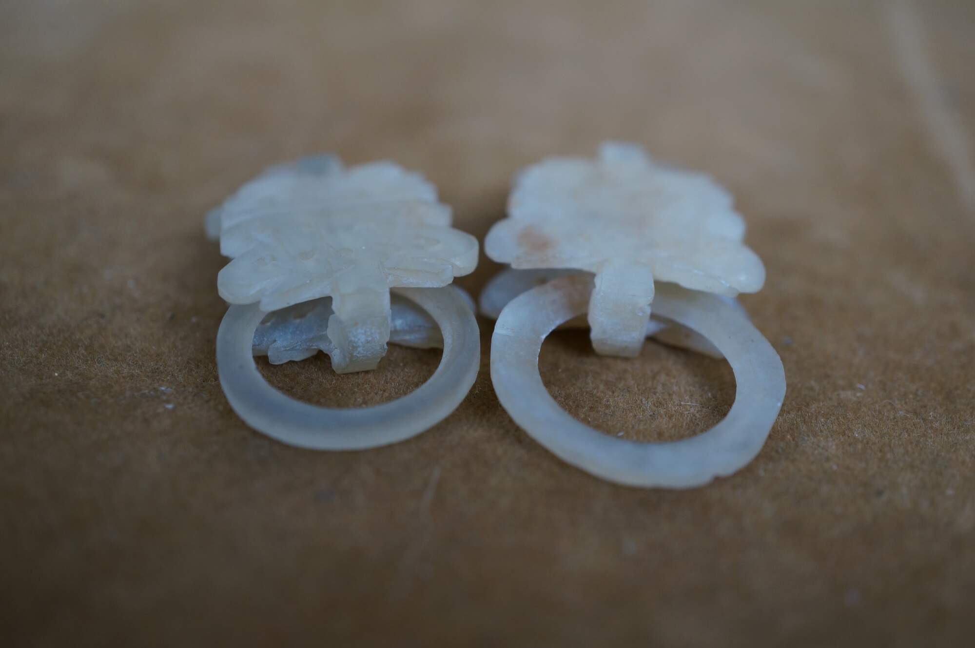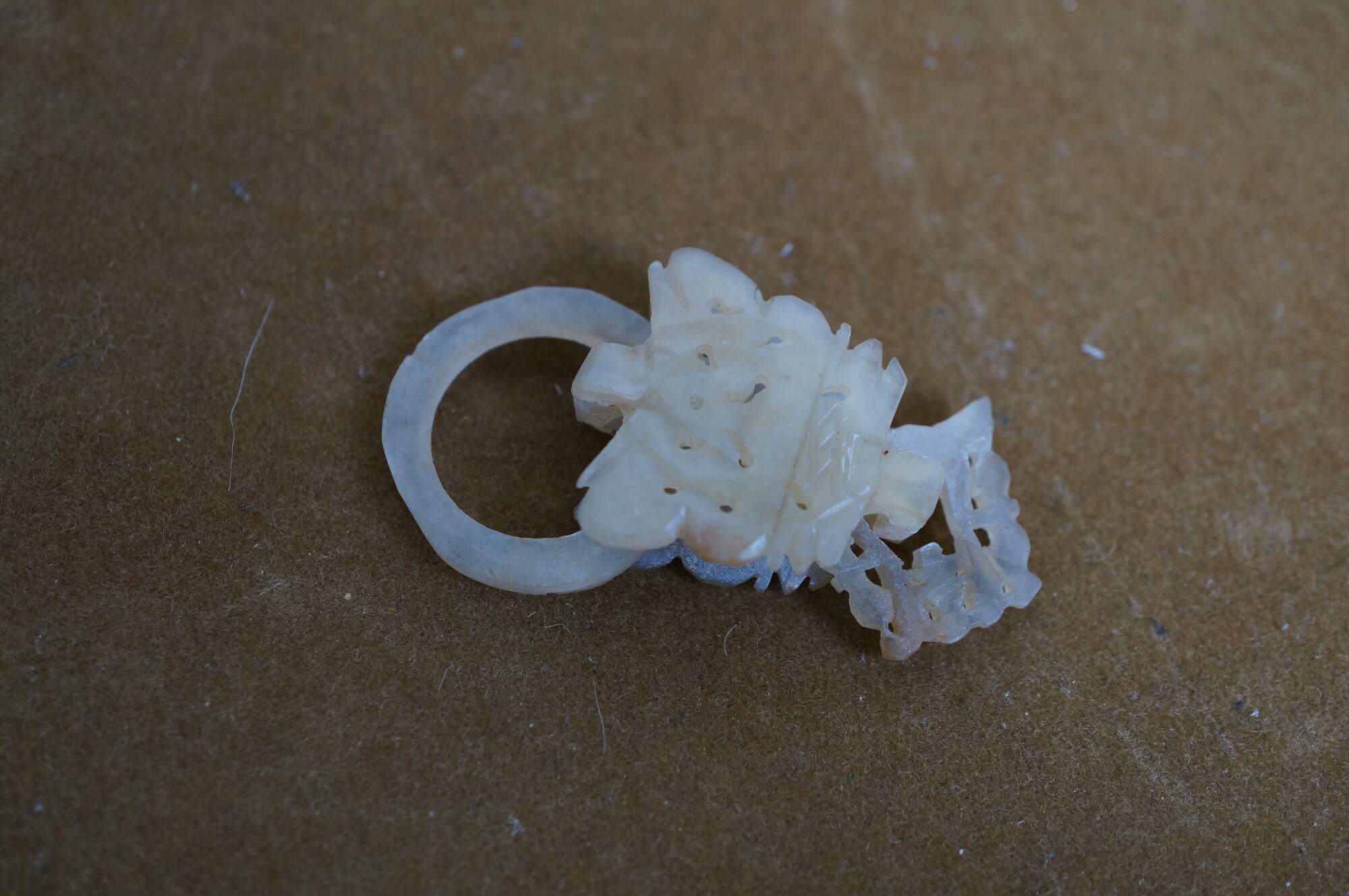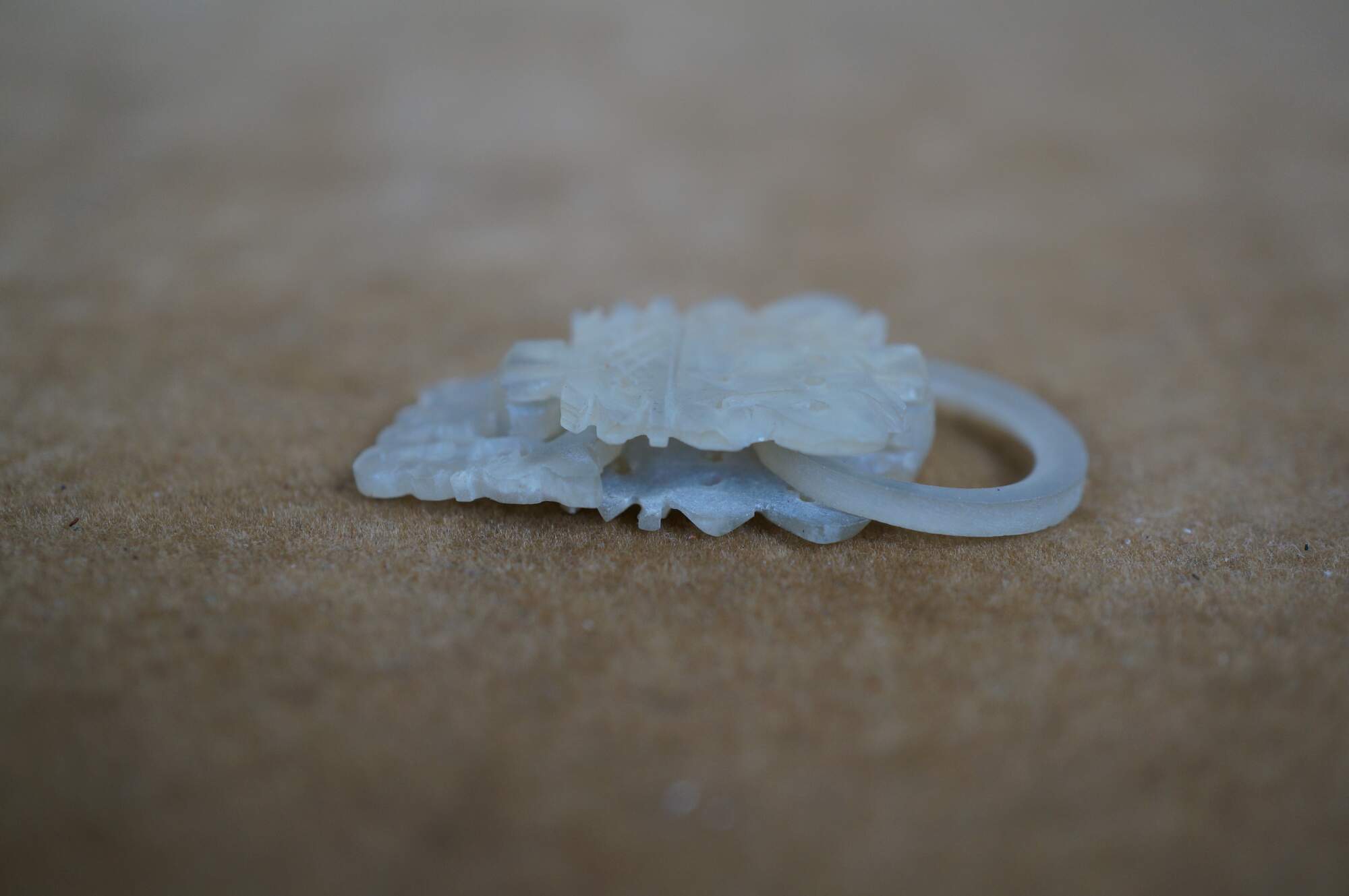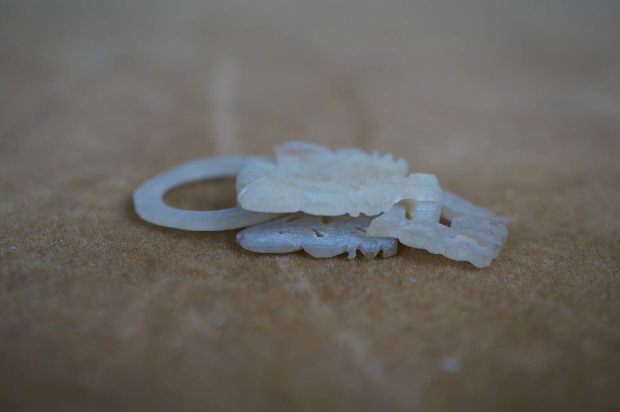 The term "devil's work" refers to a Chinese technique in which jade jewelry is meticulously hand carved, often featuring seamless interlocking rings or lace-like cutouts that resemble filigree. The time consuming process requires great skill, and was therefore named "devil's work," as though human hands were incapable of producing such intricate work.