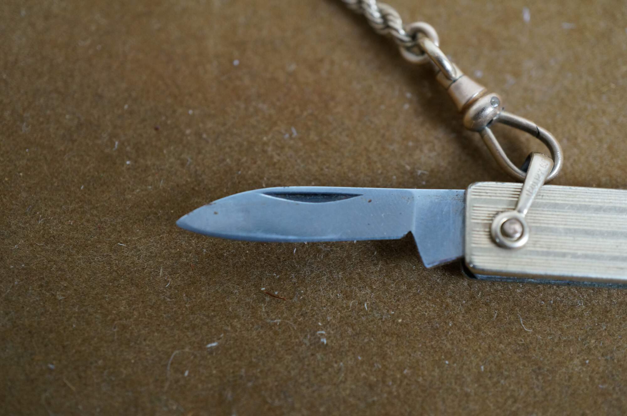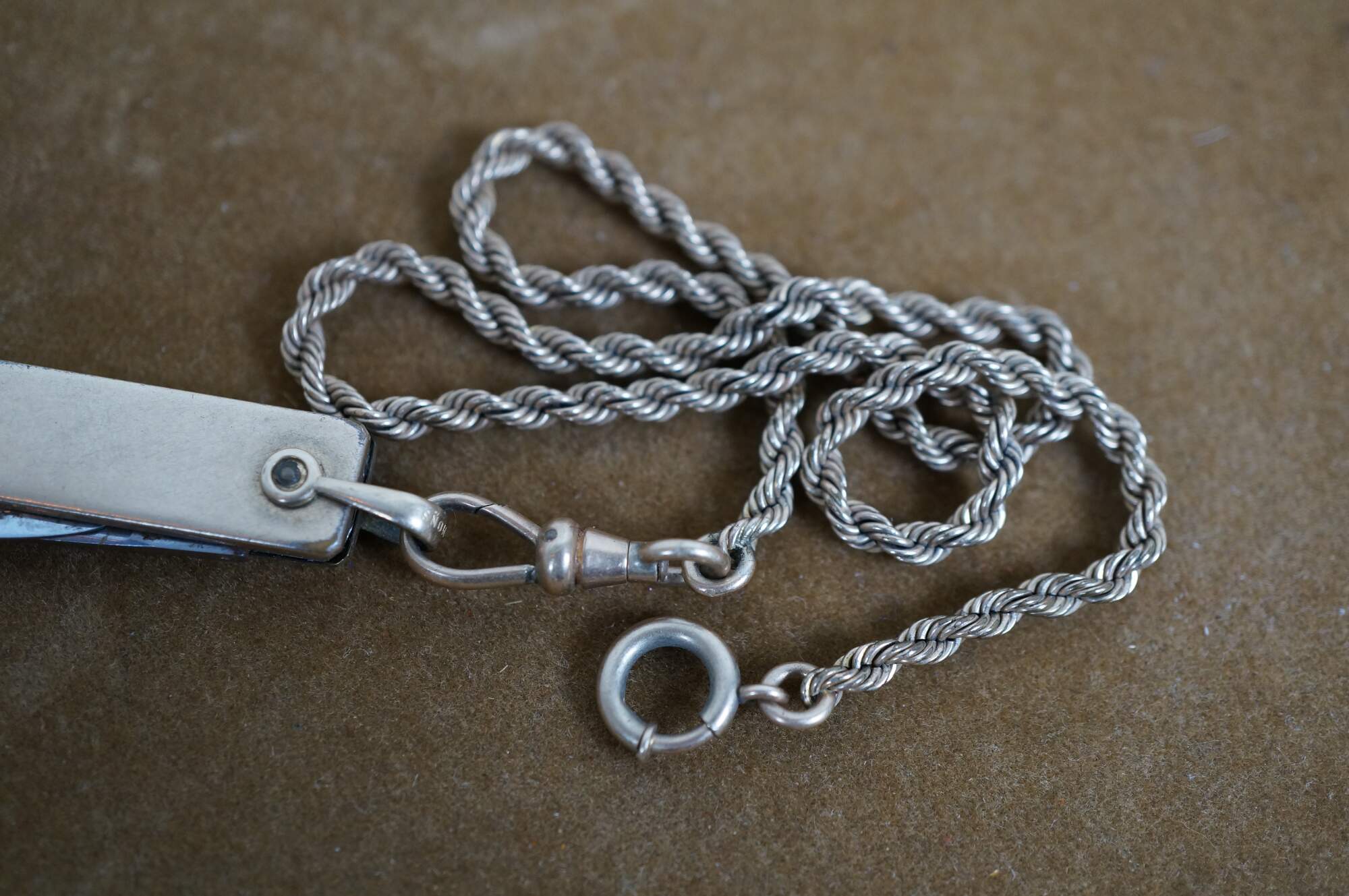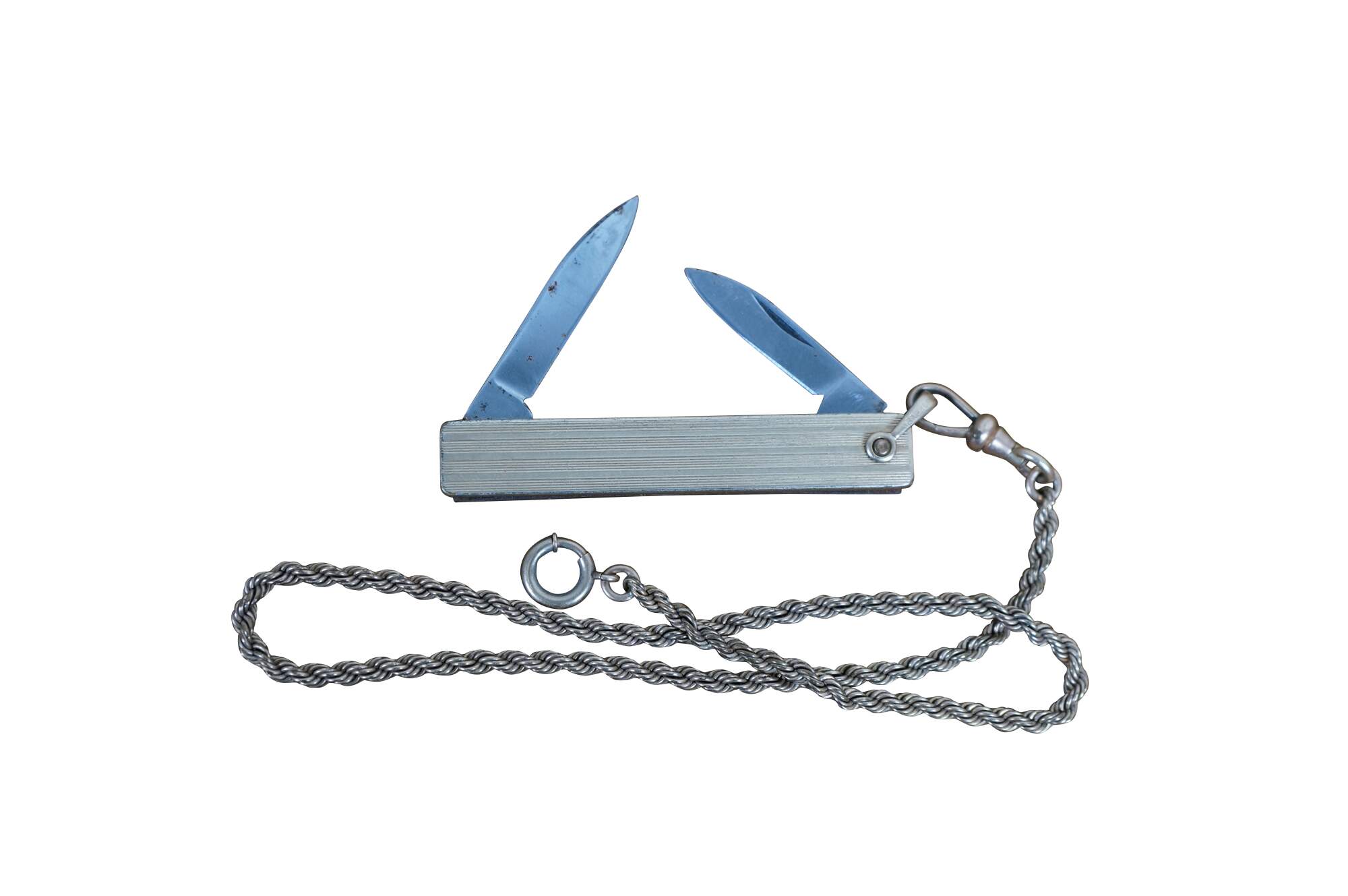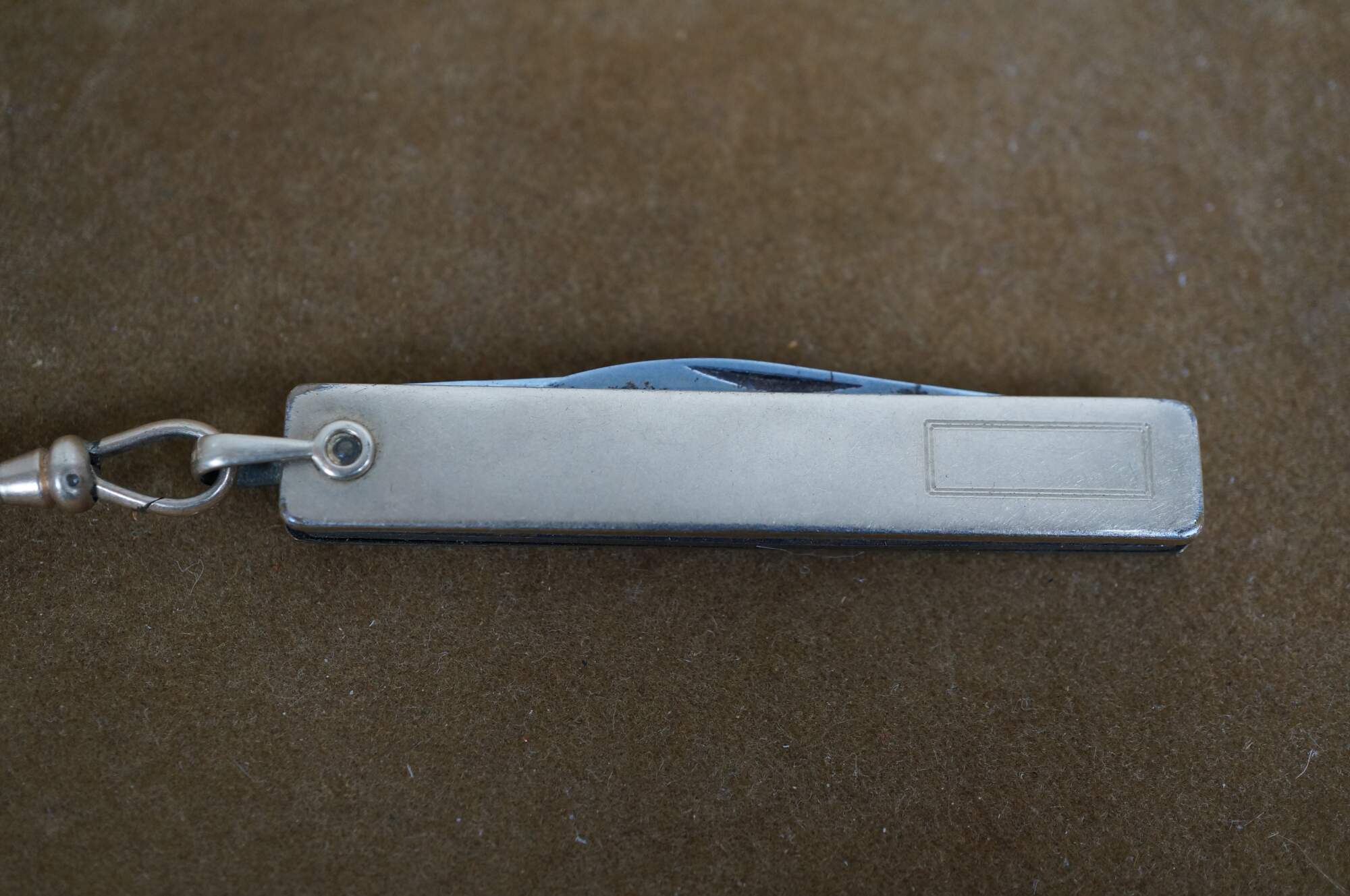 Circa mid to late 20th century Simmons 1/20 12K gold filled rope twist watch chain and pen knife fob. Knife features two Latama Italy stainless steel blades. Rectangular shape, one side etched with stripes, the other with an empty section for engraving a monogram.