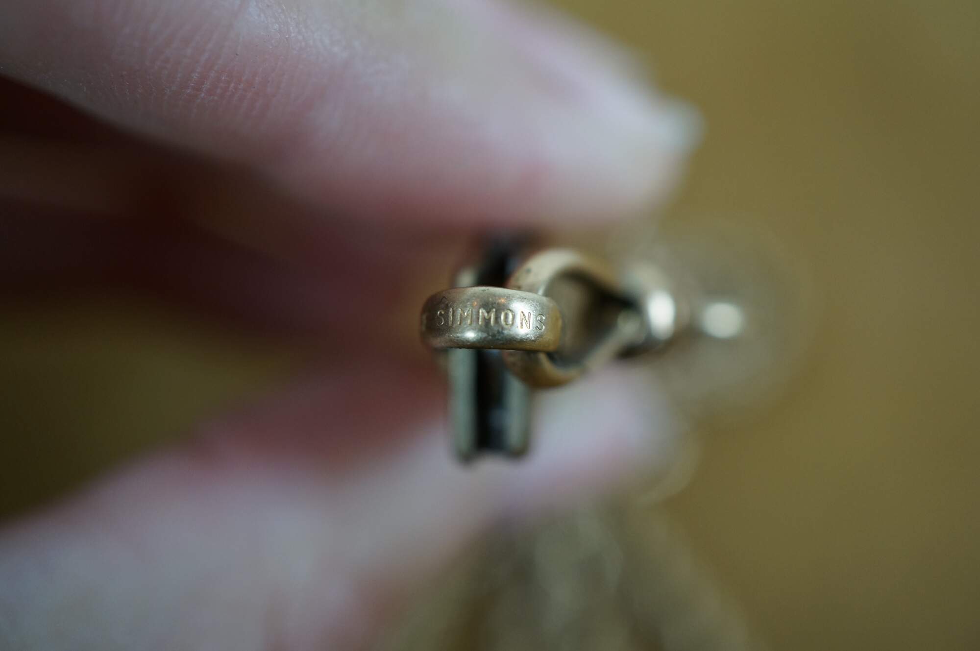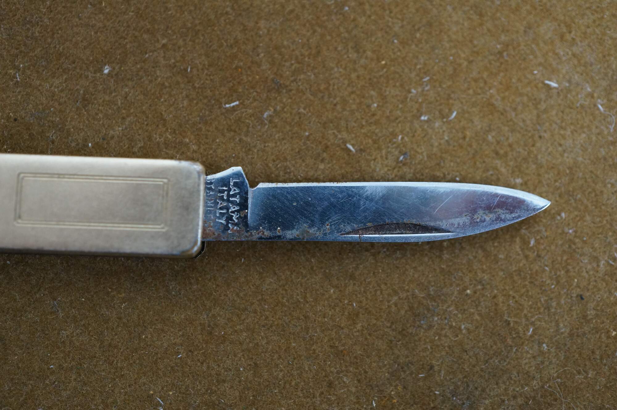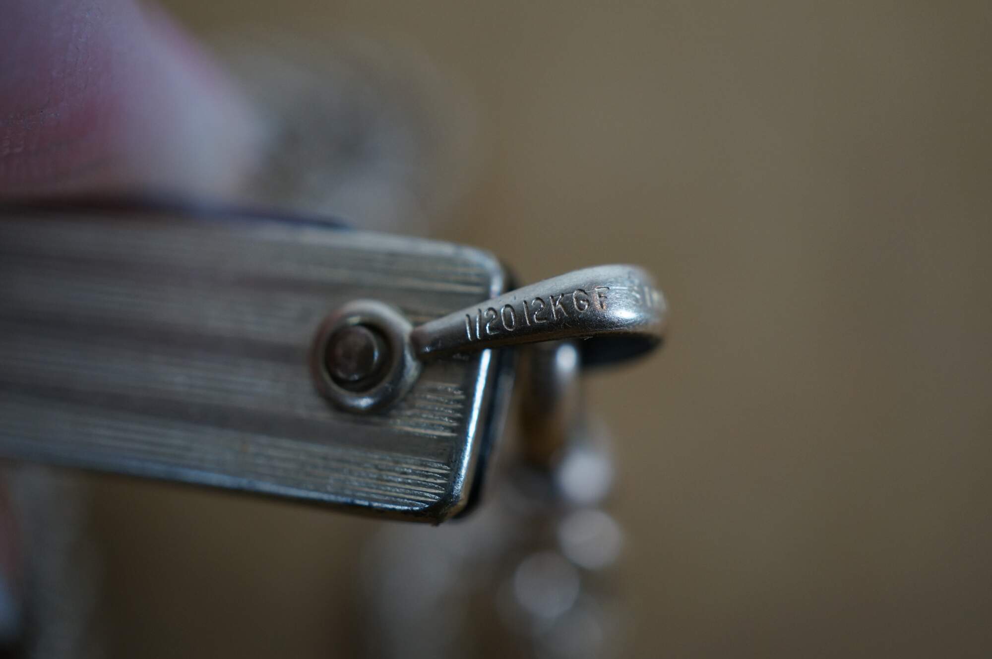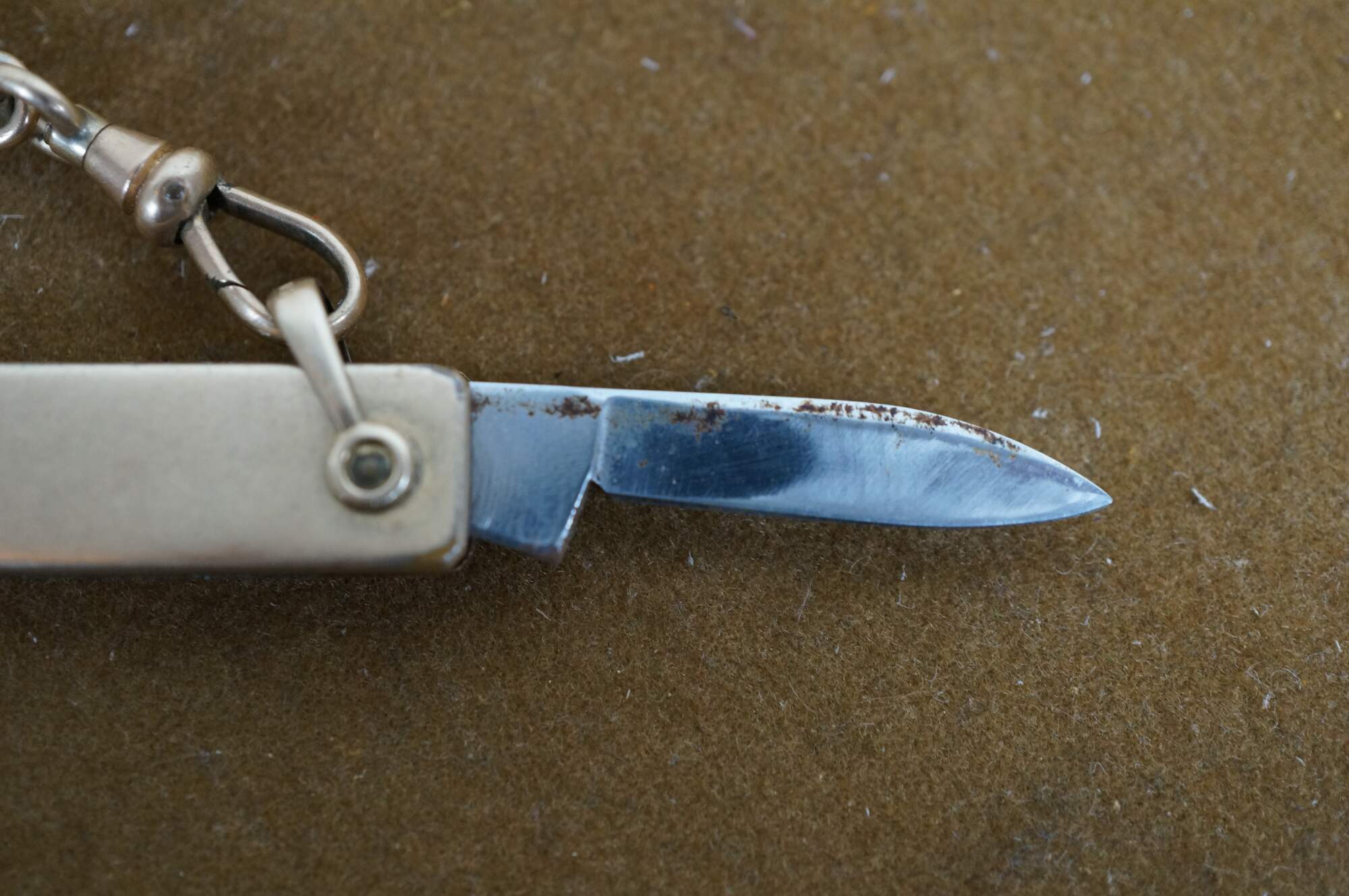 Circa mid to late 20th century Simmons 1/20 12K gold filled rope twist watch chain and pen knife fob. Knife features two Latama Italy stainless steel blades. Rectangular shape, one side etched with stripes, the other with an empty section for engraving a monogram.