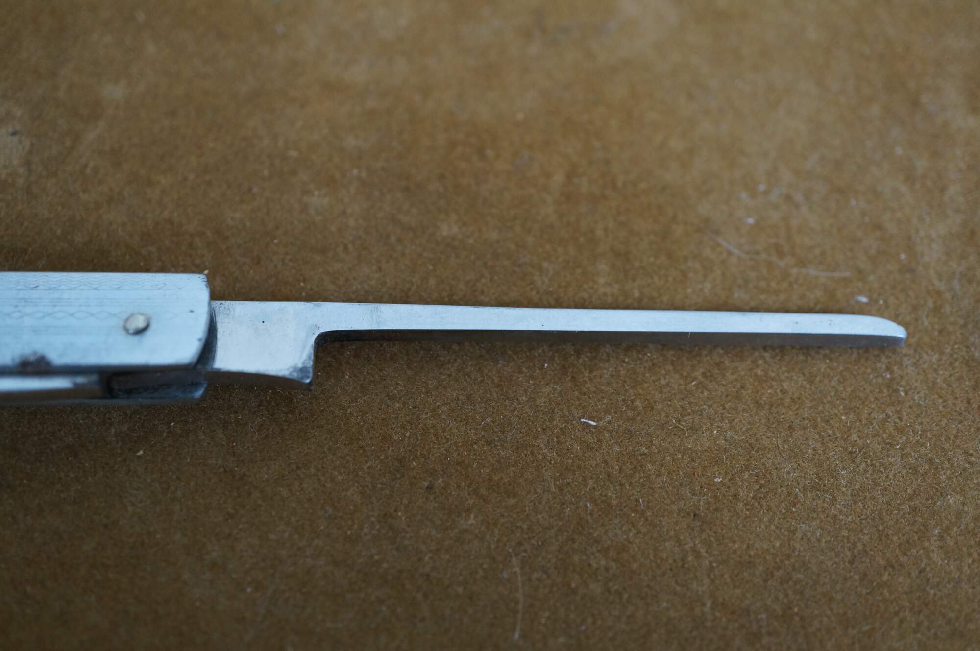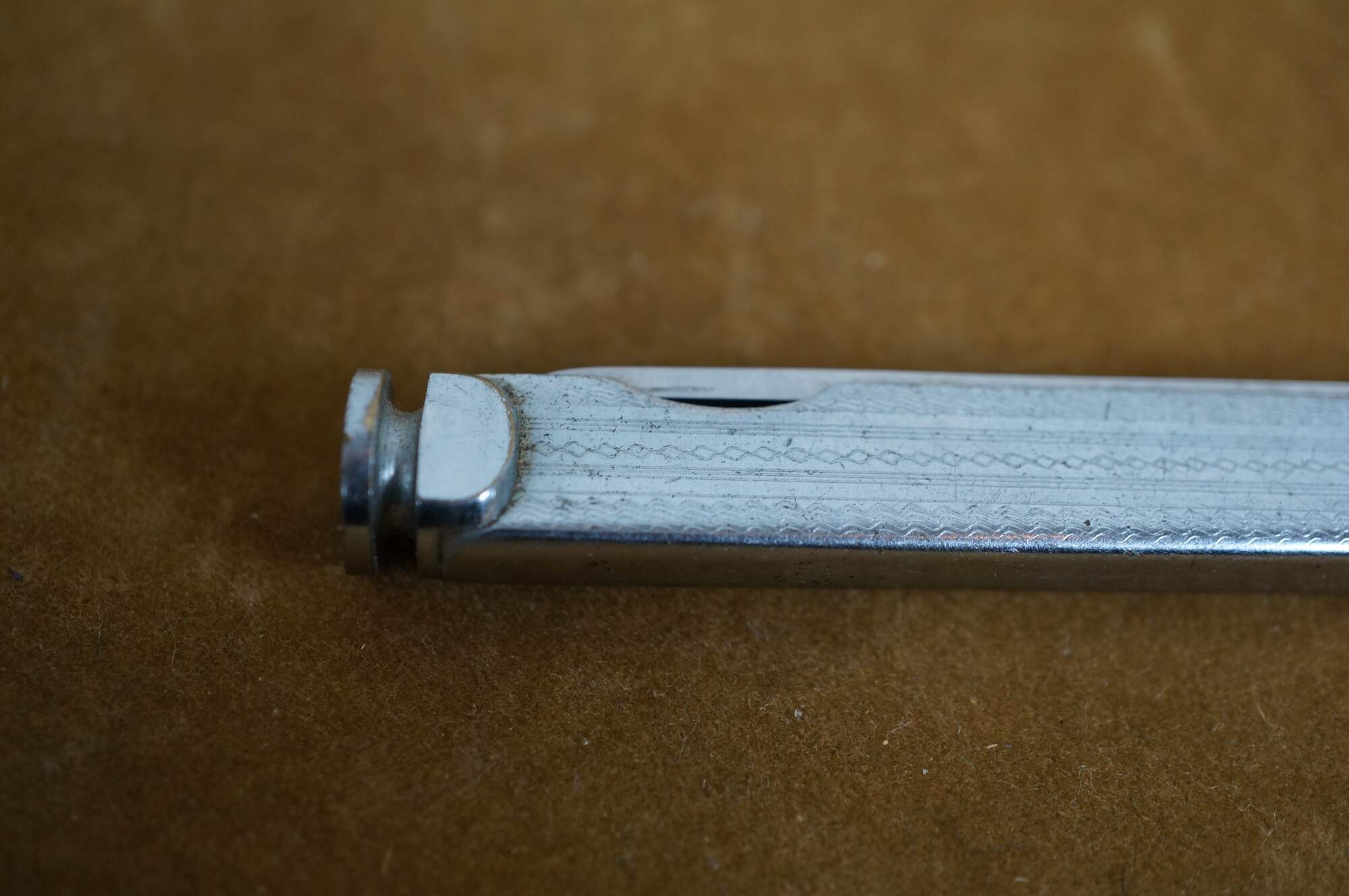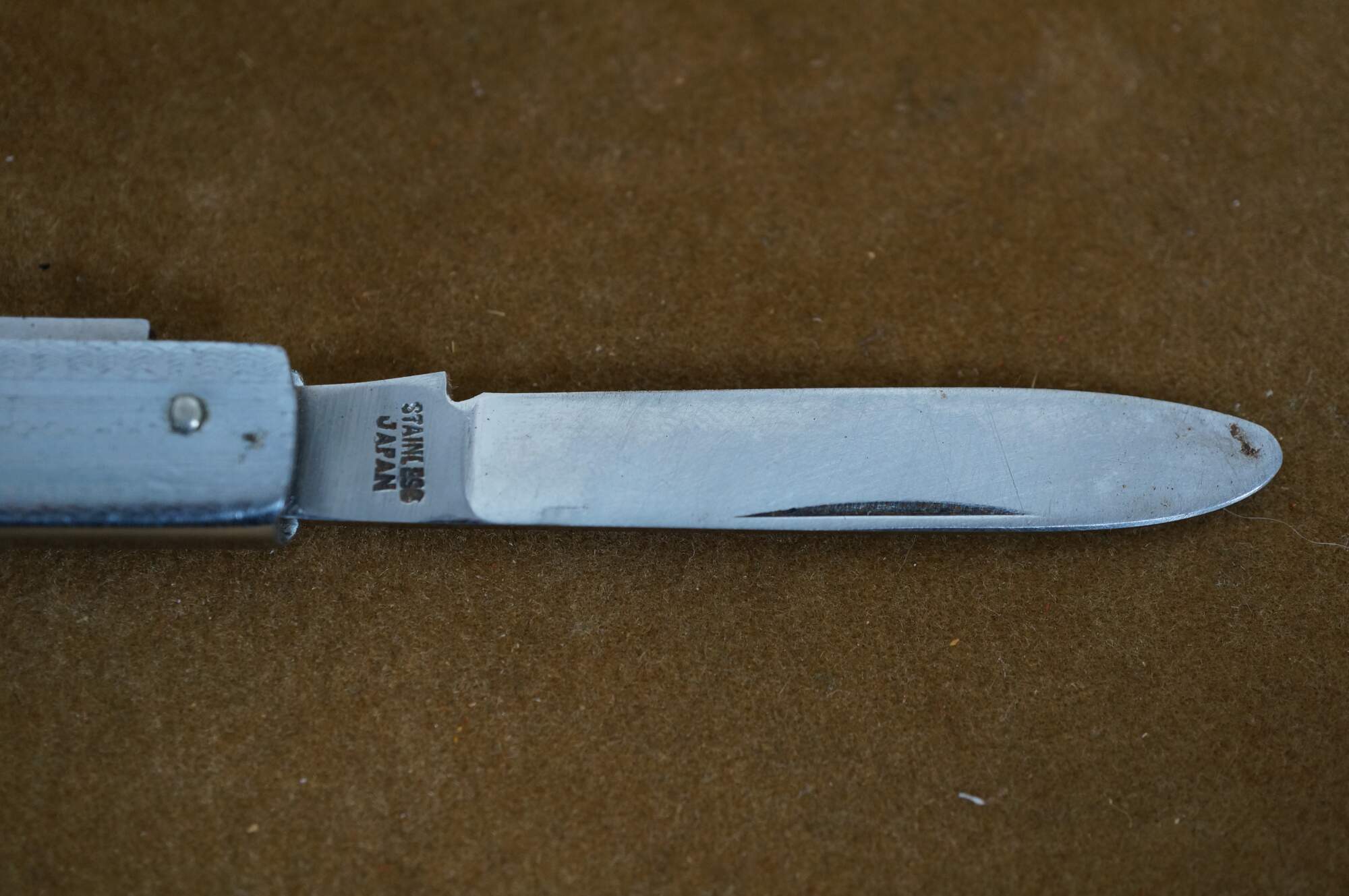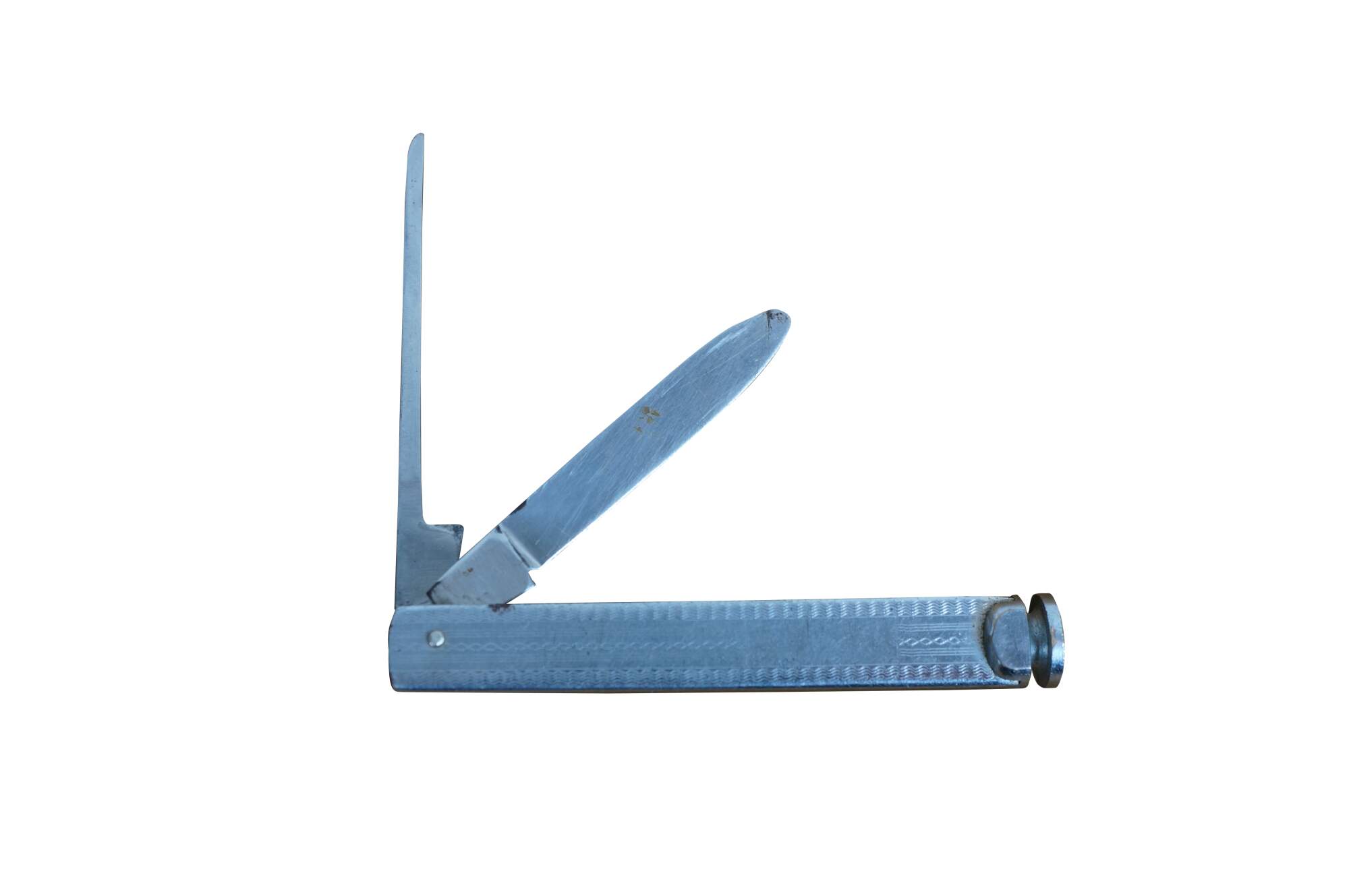 Mid to late 20th century stainless steel pipe tool pocket knife. Rectangular case with etched design and blank space for engraving a monogram. Made in Japan.