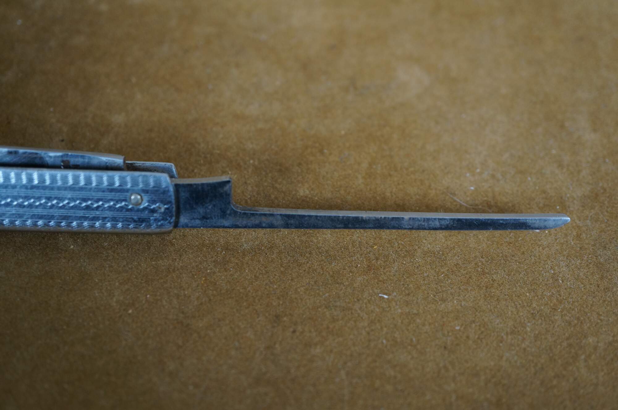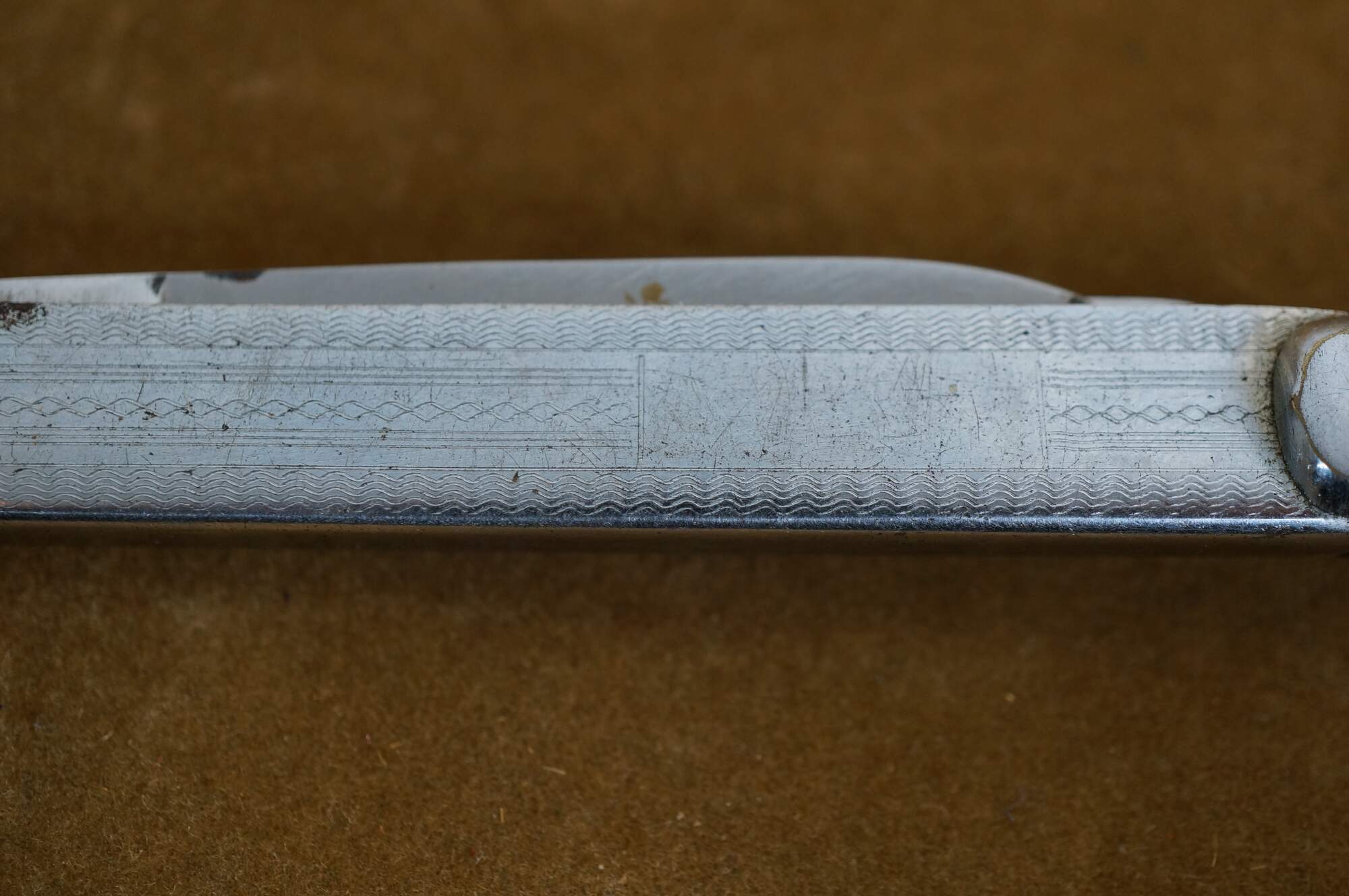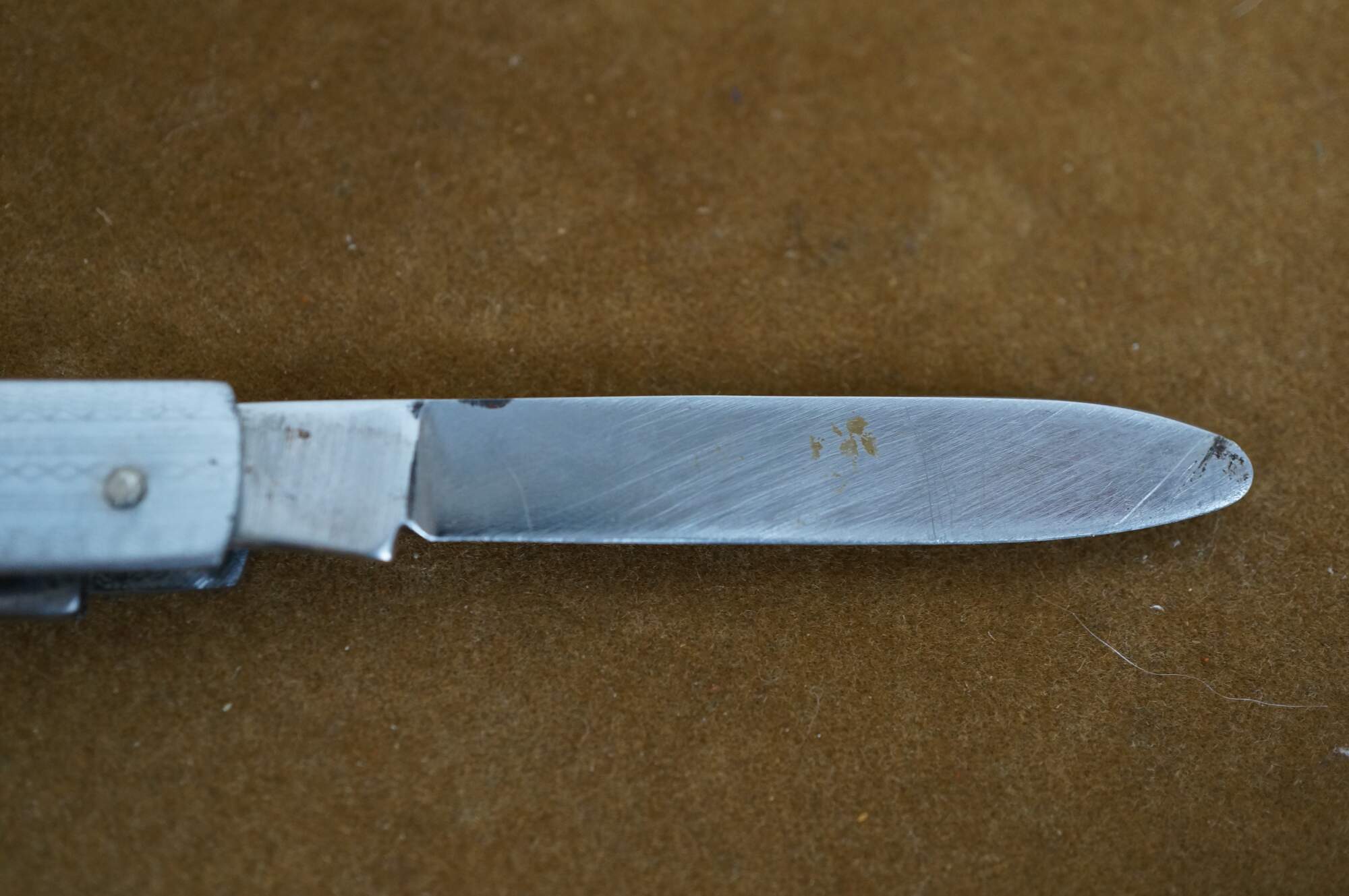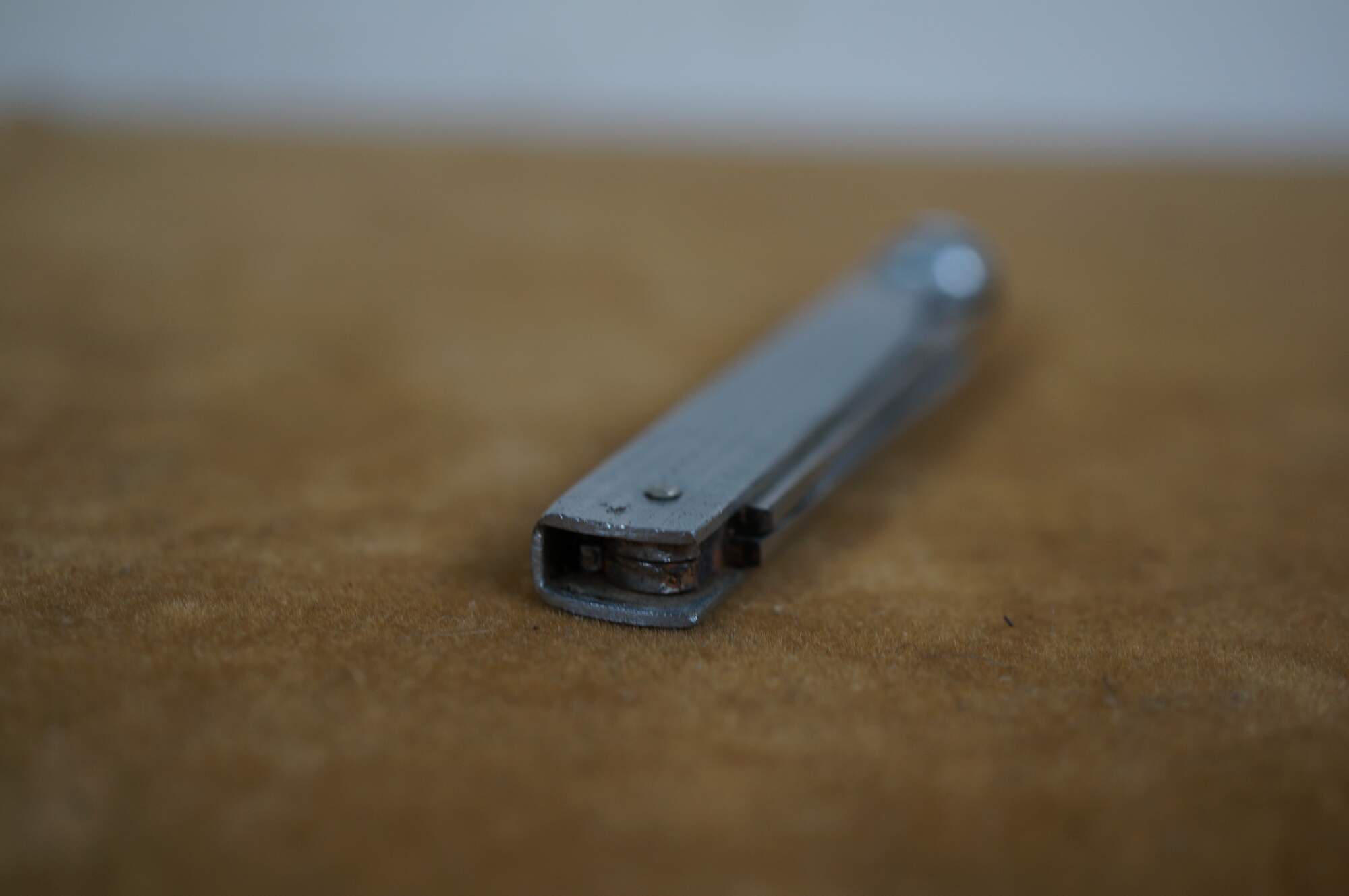 Mid to late 20th century stainless steel pipe tool pocket knife. Rectangular case with etched design and blank space for engraving a monogram. Made in Japan.