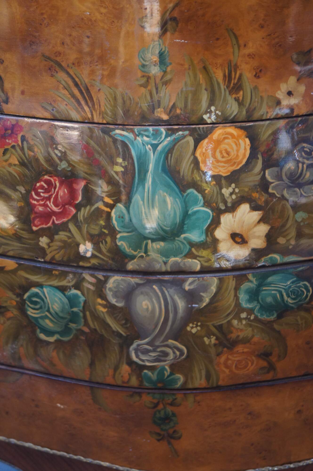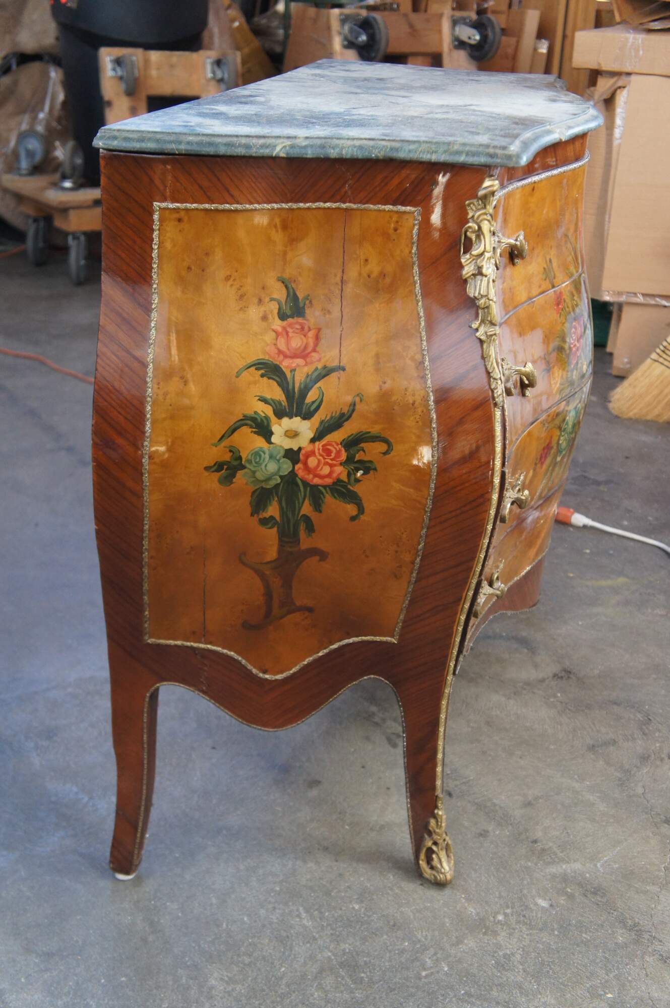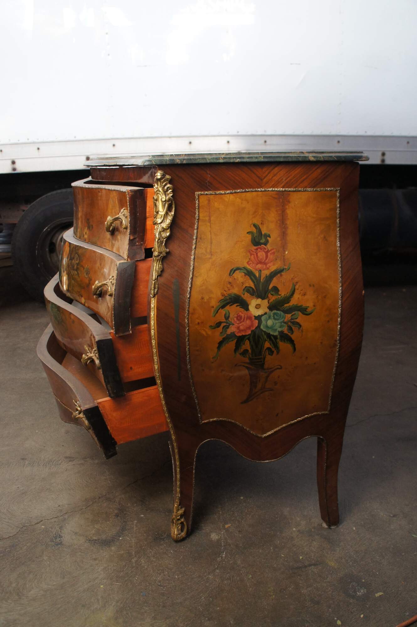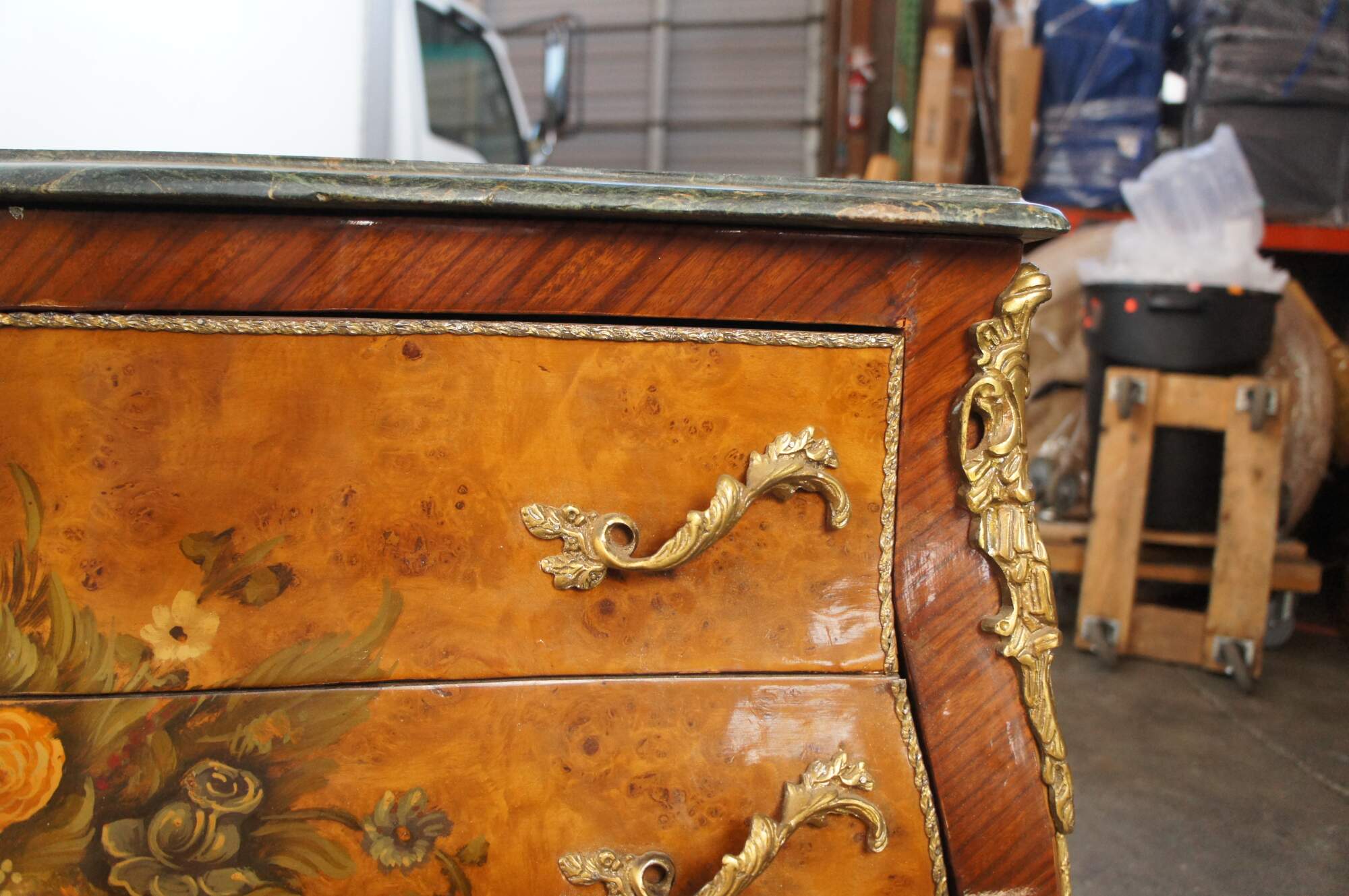20th century French Louis XV-style serpentine marble commode / Chest of Drawers / Dresser. Made from mahogany with birdseye maple and hand-painted floral details. Features four dovetailed drawers and brass ormolu trim throughout.