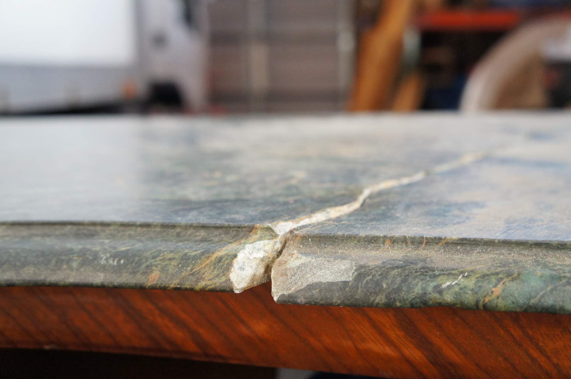 Fair; Marble top was broken in the past and is in two piece. The marble could be repaired and filled by a stonesmith. Settling crack along left side of case as well as a stain on the right side.
