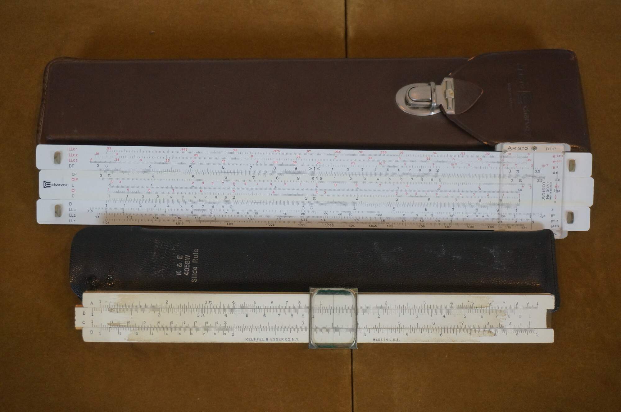 Lot of 16 vintage engineering rulers and slide rules. Includes: Charvoz Aristo Multilog Nr. 0970 with brown leather case; Keuffel & Esser Co 4058W Beginner's Slide Rule and case; Lawrence Engineering Service, Peru, Indiana / The Ideal Electric & Manufacturing Co, Mansfield, Ohio; Concrete Volume computer 1968 Gerson Co, Mattapan, Mass / Compliments of Master Builders / Pozzolith; Pickett Model N4-ES Vector-Type Log Log Dual-Base Spped Rule; Pickett Microline 140; Art Brown, New York. One Russian. Engineering rulers - two wooden Keuffel & Esser and one plastic. Displayed in Kimax No 14005 4000ml glass beaker.