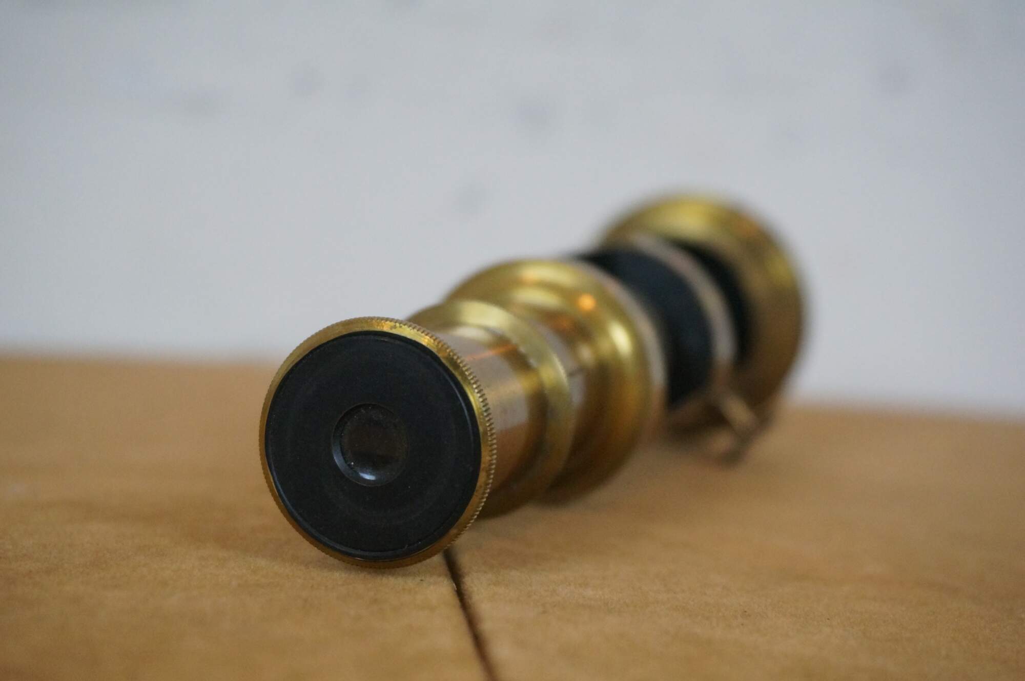 Early to mid 20th century compound monocular microscope. Made of brass in a compact size ideal for field work. Includes wooden case, spare lens, and brass tweezers.