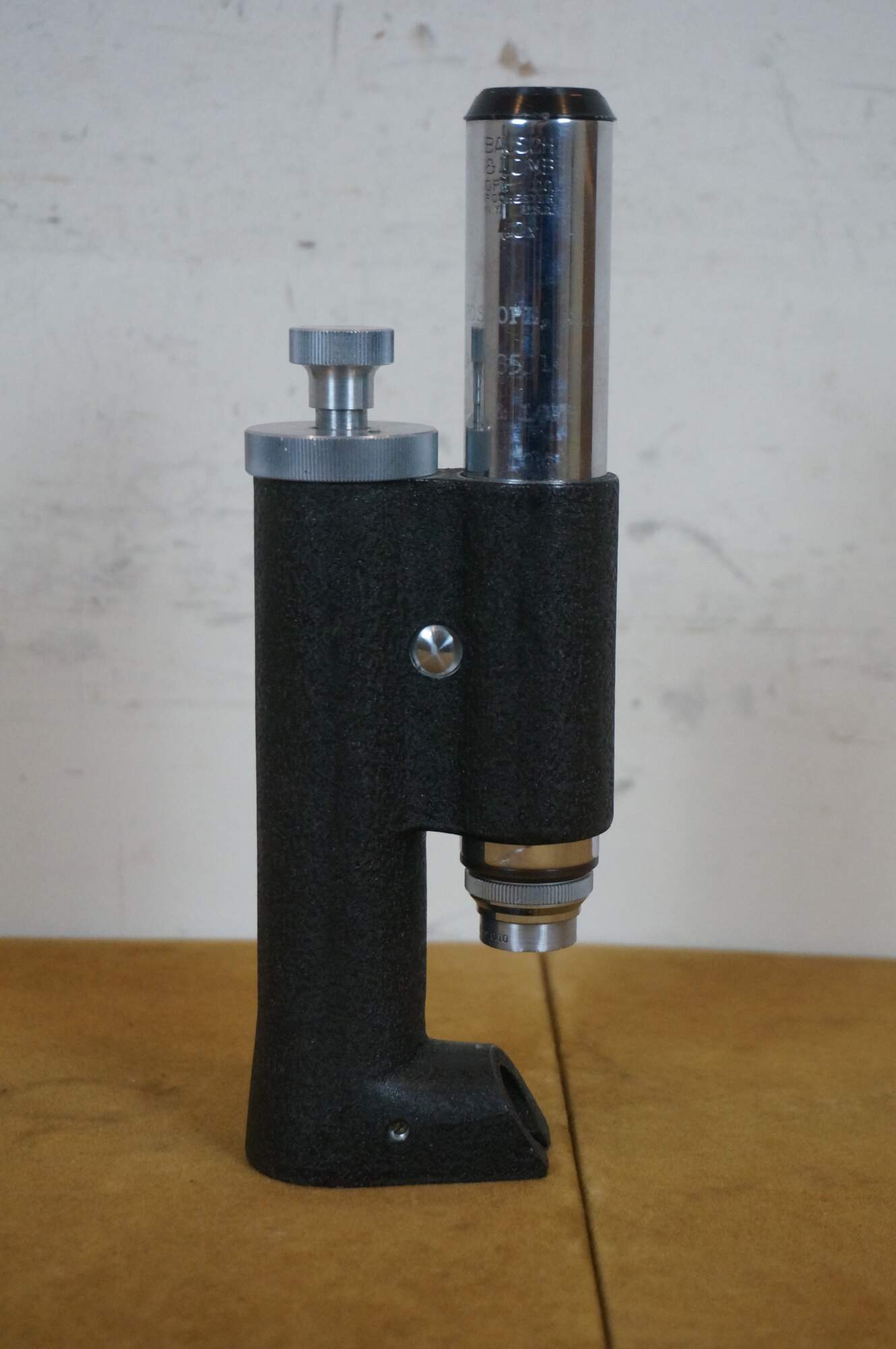Vintage mid 20th century Shop Microscope produced by the Bausch & Lomb Optical Company of Rochester, NY. 7CAD-543551 / Mfg Oct 1957 / AF33(604)16853. 40x magnification. 32mm 0.10 lower lens.Includes black leatherette case - lid marked MET USWB - United States Weather Bureau?