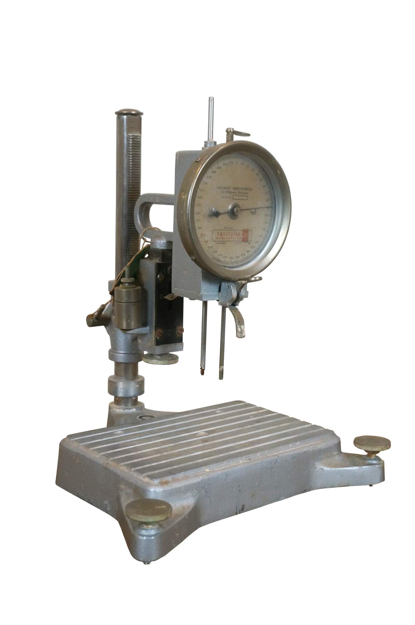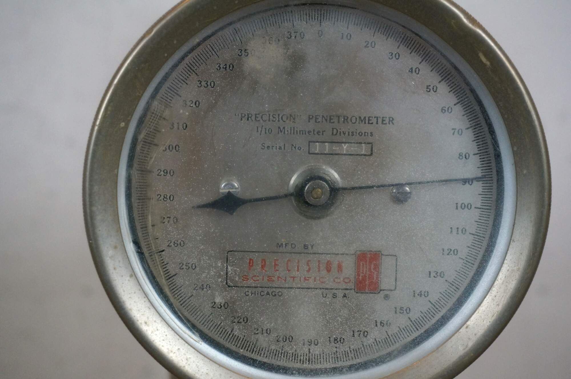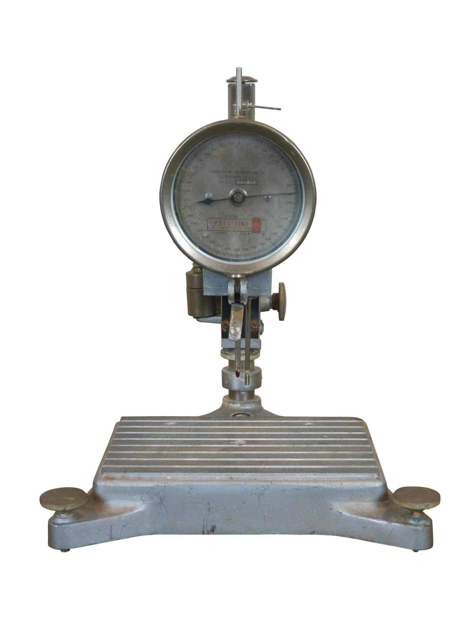 Vintage "Precision" Penetrometer with 1/10 Millimeter divisions produced by the Precision Scientific Company of Chicago, IL. Serial No. 11-Y-1. Base stamped 521417. Top stamped 521375. A penetrometer is a device that tests the strength of a material.