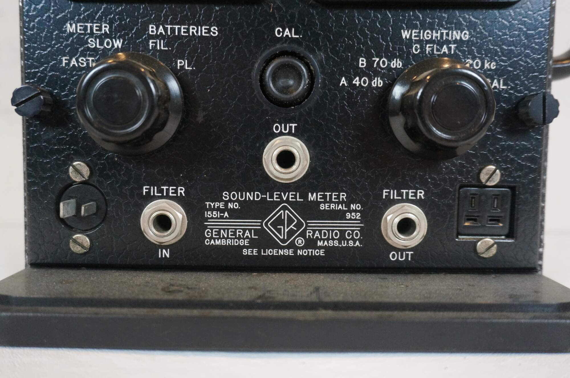 Vintage 1950's Sound Level Meter produced by the General Radio Company of Cambridge, Mass. Type No. 1551-A. Serial No. 952. Features non-directional crystal microphone by Shure Brothers of Chicago, IL / Model 9898 / Serial Number D4877 / Made in USA. Licensed under patents of the American Telephone and Telegraph Company. Calibrated 8/27/1970 by the Baynton Electronics Corporation of Philadelphia, PA.