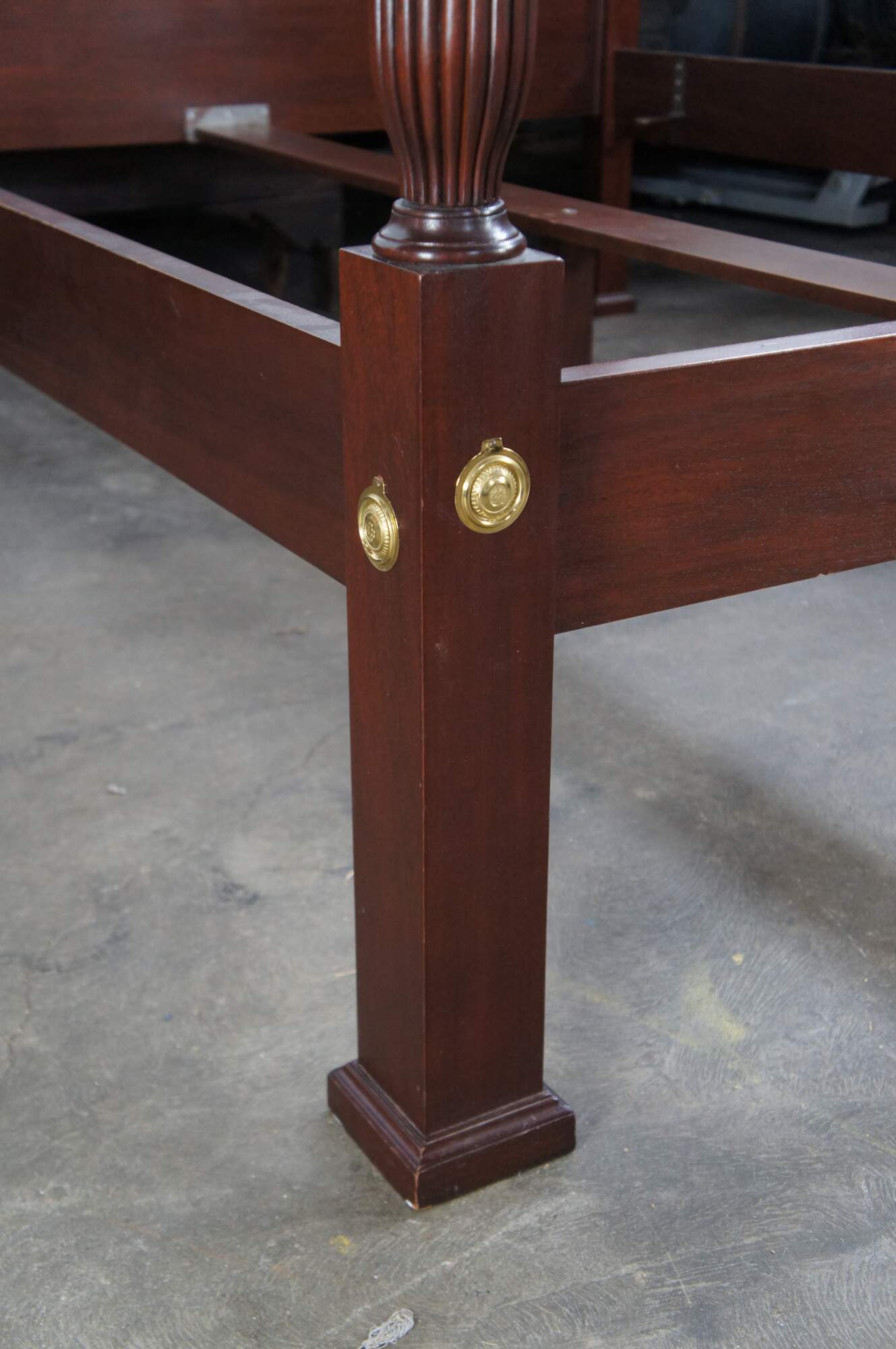 A stately Colonial Williamsburg Four Poster Bed by Baker Furniture, Circa 1980s. Features a solid mahogany frame with reeded posts, Canopy with trophy finials and square footed legs with brass accents. Marked along the backside with the Colonial Williamsburg Paper tag as well as Baker's Brass Tag.