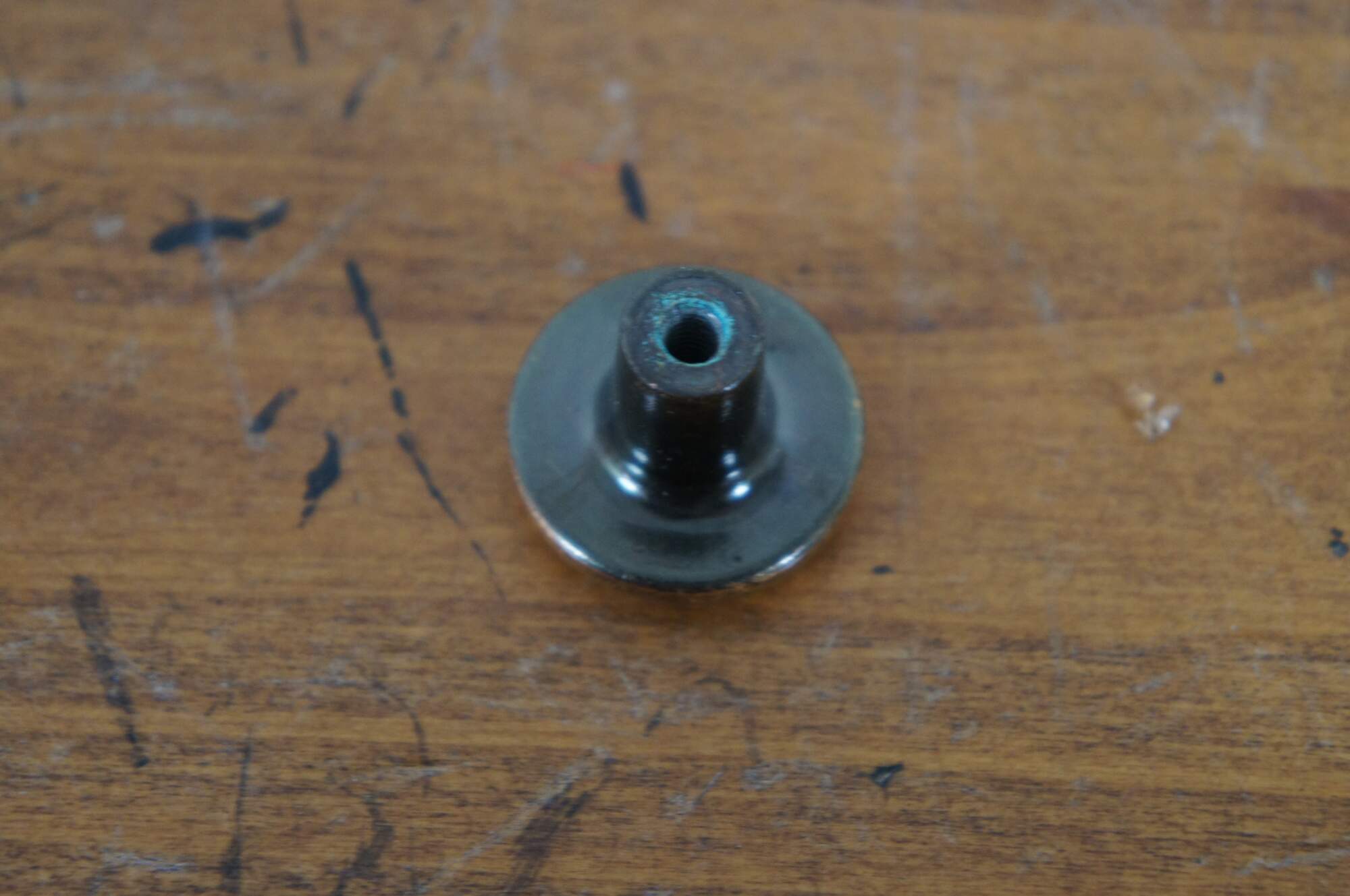 15 Available - Mid to late 20th century old-stock drawer / cabinet pulls. National Lock Company - Medalist. Antique bronze / old copper finish knob. Mid century modern styling. Round / circular shape with abstract rose / swirl rosette design.
