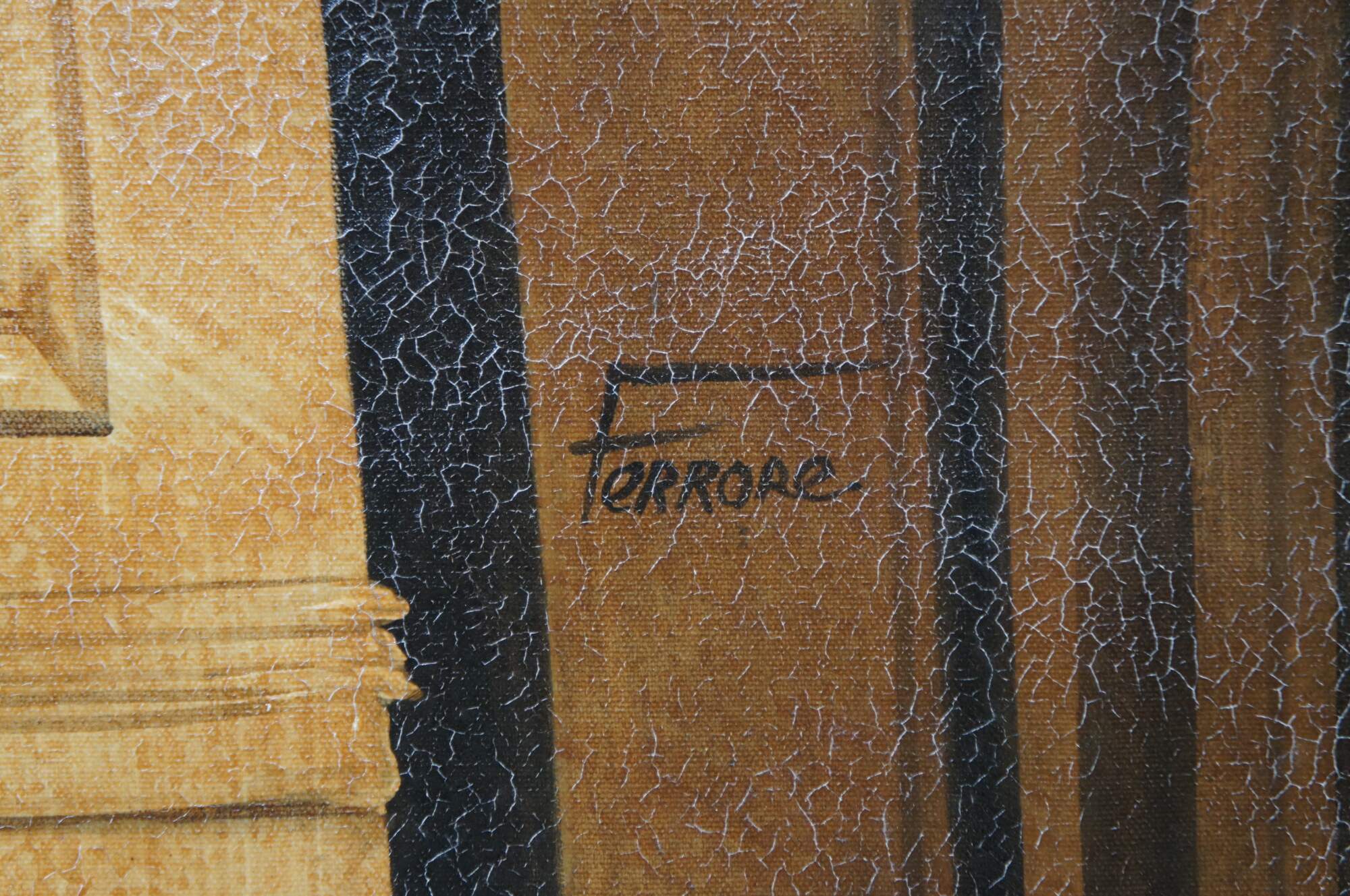 An Italian Renaissance painting after Michelangelo Buonarroti's famous carving at the Tomb of Giuliano de’ Medici. The tomb of Giuliano de' Medici is the companion to the tomb of Lorenzo, and stands on the opposite side of the altar which separates them. This illustration shows the entire work, the statue being in the niche above, and the sarcophagus standing below with two reclining figures on it. The painting is signed Ferrore.