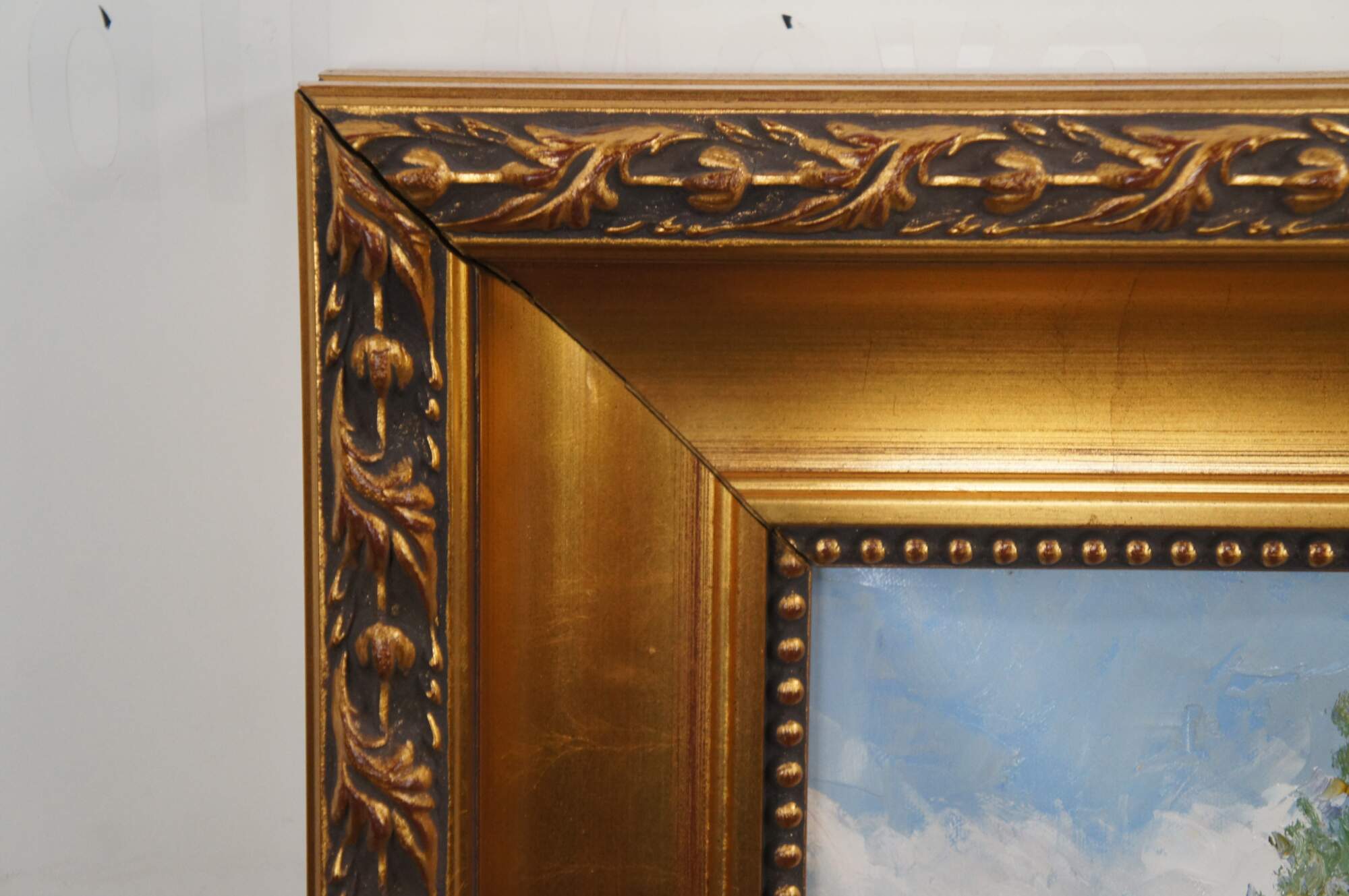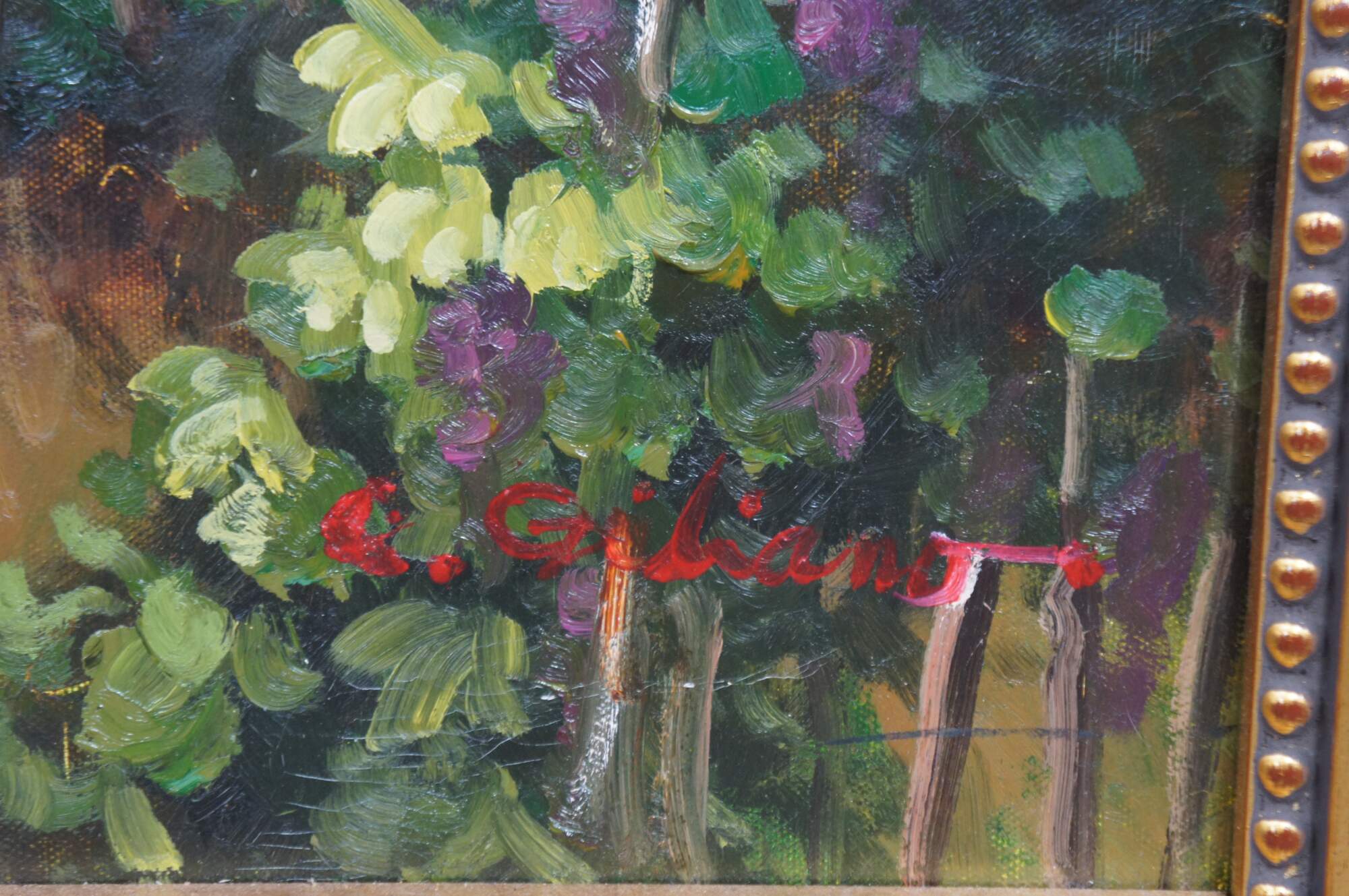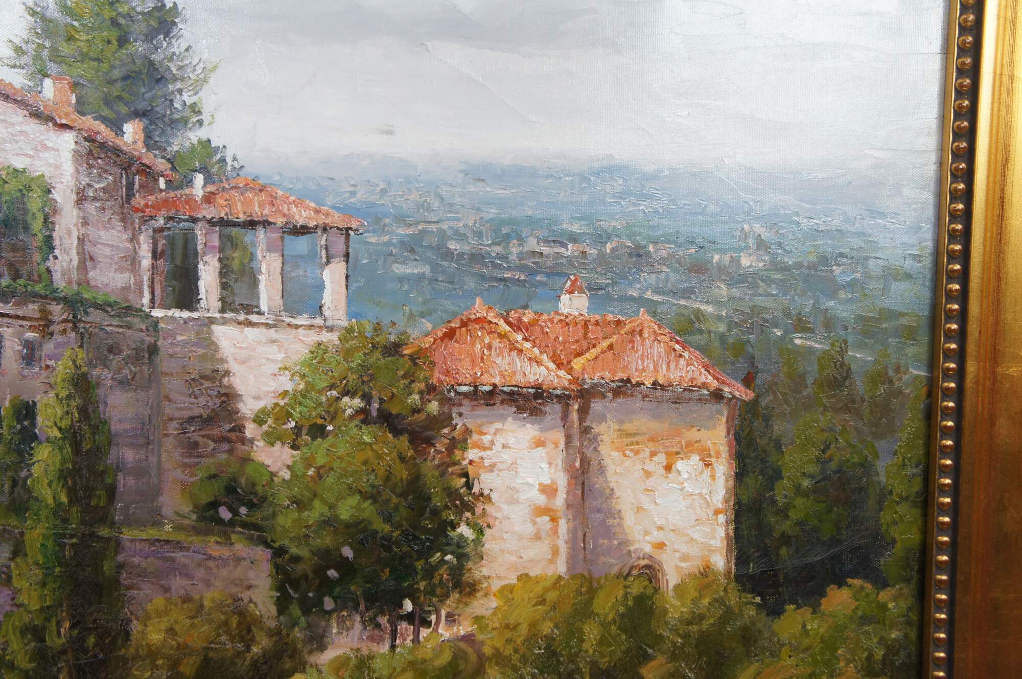 Late 20th century Tuscan Vineyard landscape painting by C. Giliano. A charming estate scene with mediterranean buildings on the hillside over looking over the rows grape vines. A town can be seen off the left in the background. The oil painting is on canvas and signed to the lower right. Framed in wood with a gold finish.