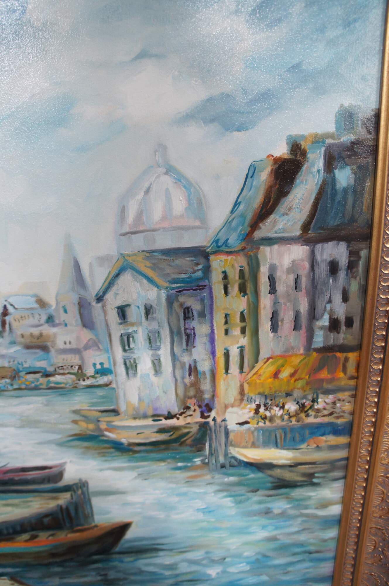 A large signed oil painting depicting a canal scene or view of Venice. Features buildings, boats, and figures on the waterway. The painting is vibrantly colored with beautiful detail. The canvas is signed along the lower edge and framed in a Neoclassical manner. A certificate of authenticity is mounted to the backside of the canvas.