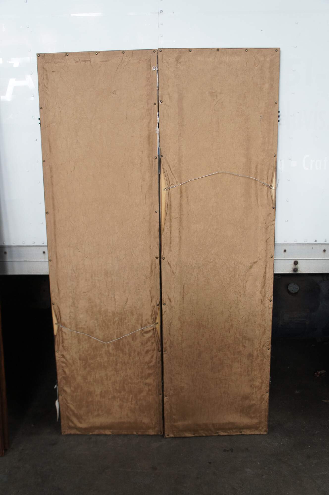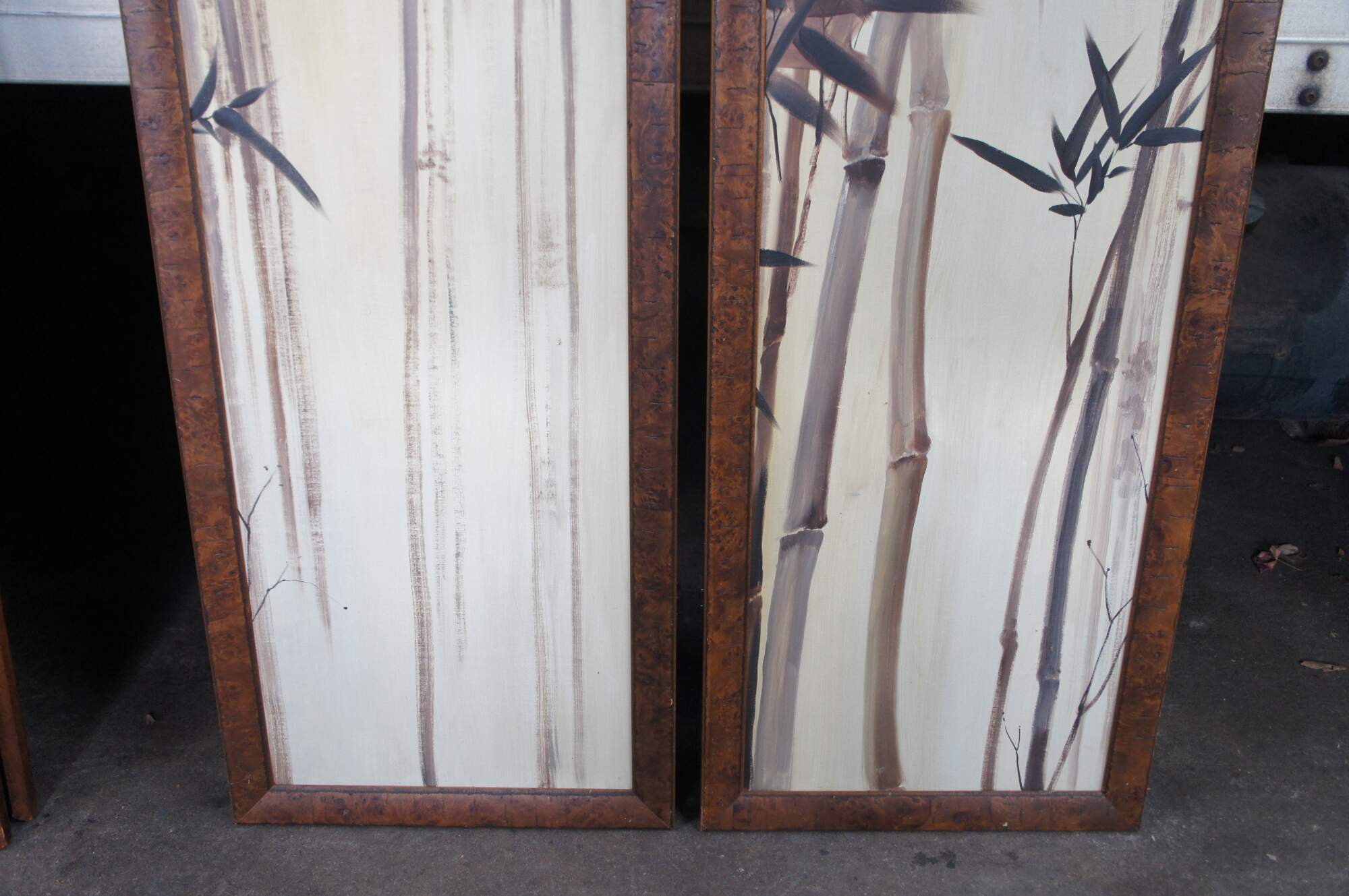 Pair of Bamboo canvas paintings. Each is framed in burlwood and can hang separately or combined to be used as a folding screen or room divider. Each frame has hinges on the outside allowing for them to be used as a traditional folding screen with the addition of a pin.