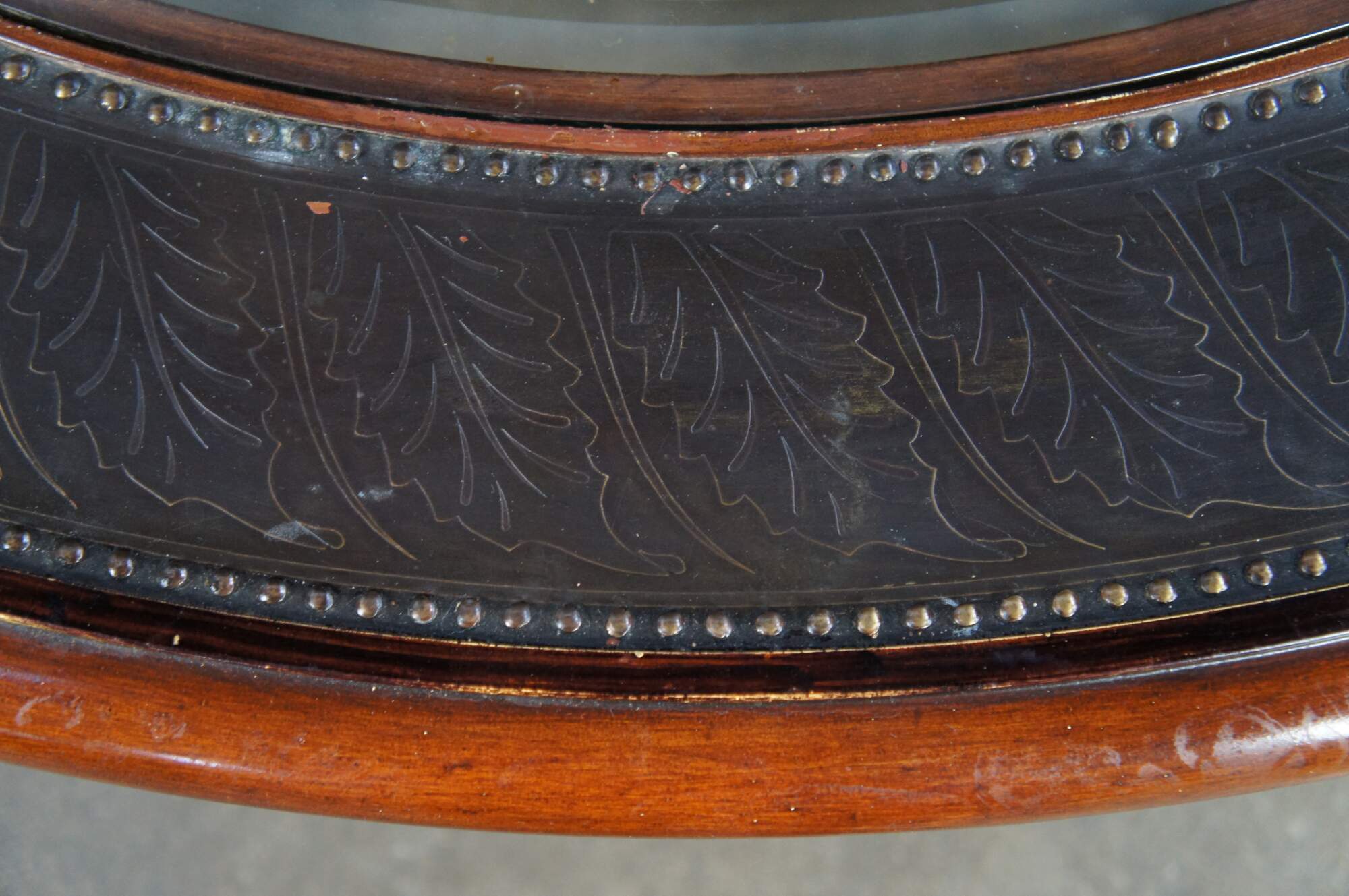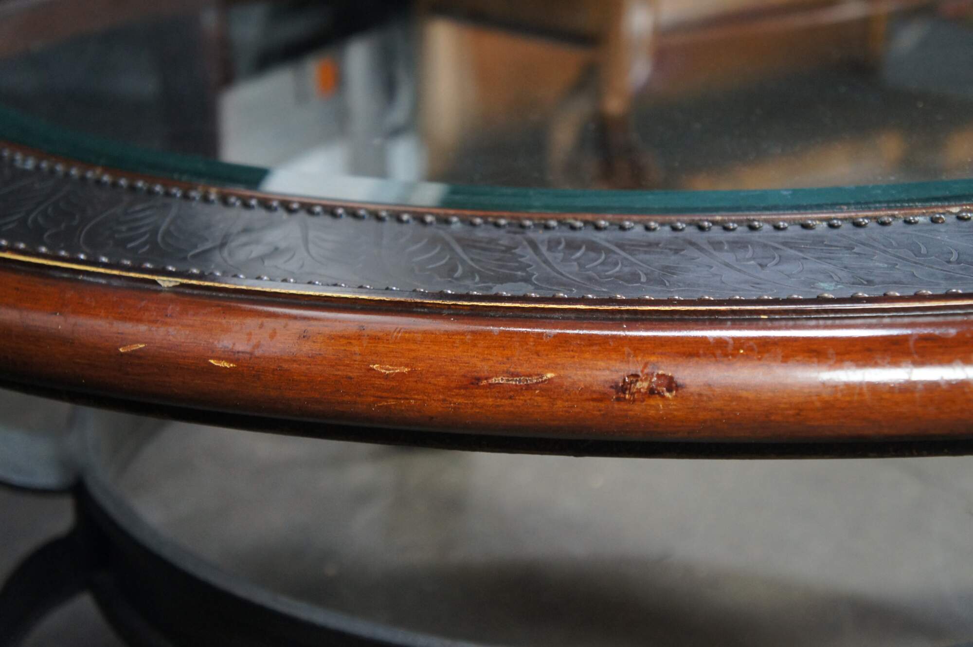 An exquisite early 21st-century Maitland Smith modern coffee table. Features a round top made from mahogany and engraved brass with a beveled glass center. The top is supported by a scrolled iron base. The table is accented by engraved brass along the top with a beautiful leaf motif centered between a riveted edge. This motif is also displayed along the round iron band of the base. An exceptional design lending a blend of rustic, modern, Spanish, and contemporary styling.