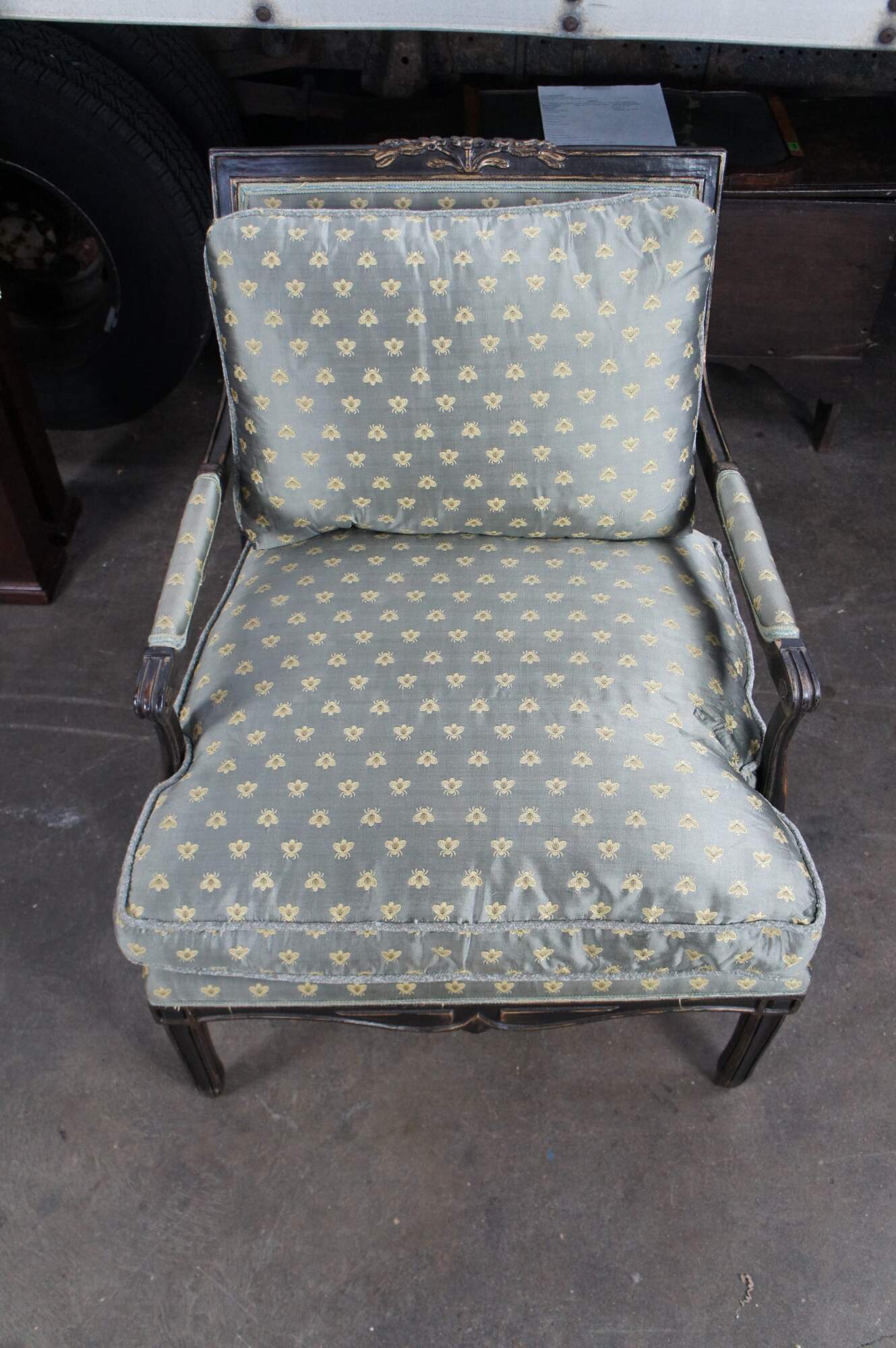 Early 21st Century Minton Spidell Cressant French Louis XVI Fauteuil Arm Chair. Features an ebonized frame with gold accents. The seat and cushions are upholstered in Scalamandre silk with a bee pattern.