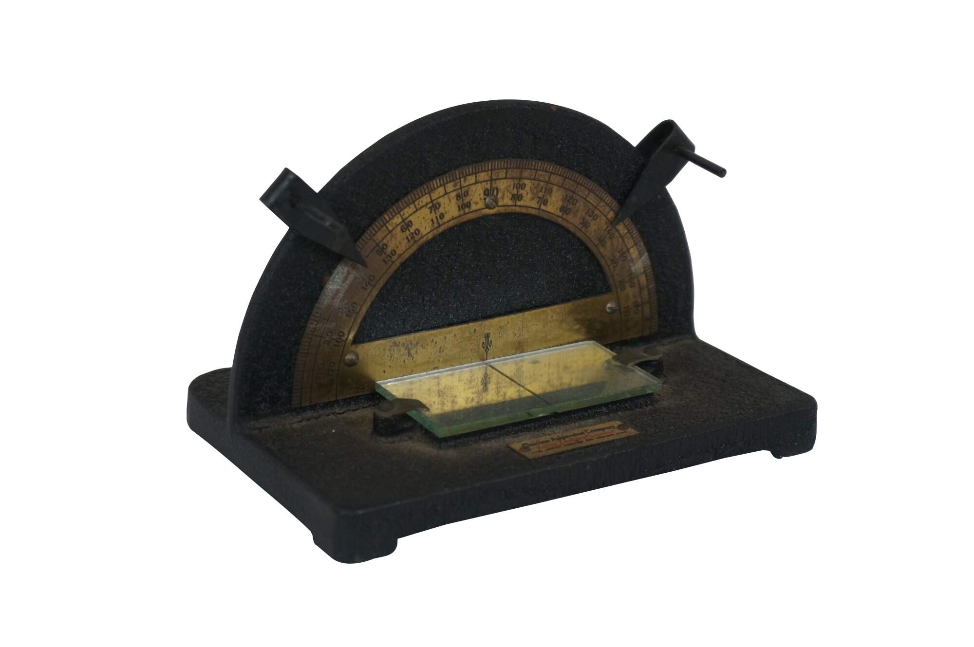 Early 20th century scientific apparatus consisting of an L shaped iron base set with a small mirror below a brass protractor and two rotating indicators. Likely for use in demonstarting / measuring the angle oof incidence and reflection of a beam of light. Produced by the Chicago Apparatus Company of Chicago, USA. Faience Laboratory Equipment.