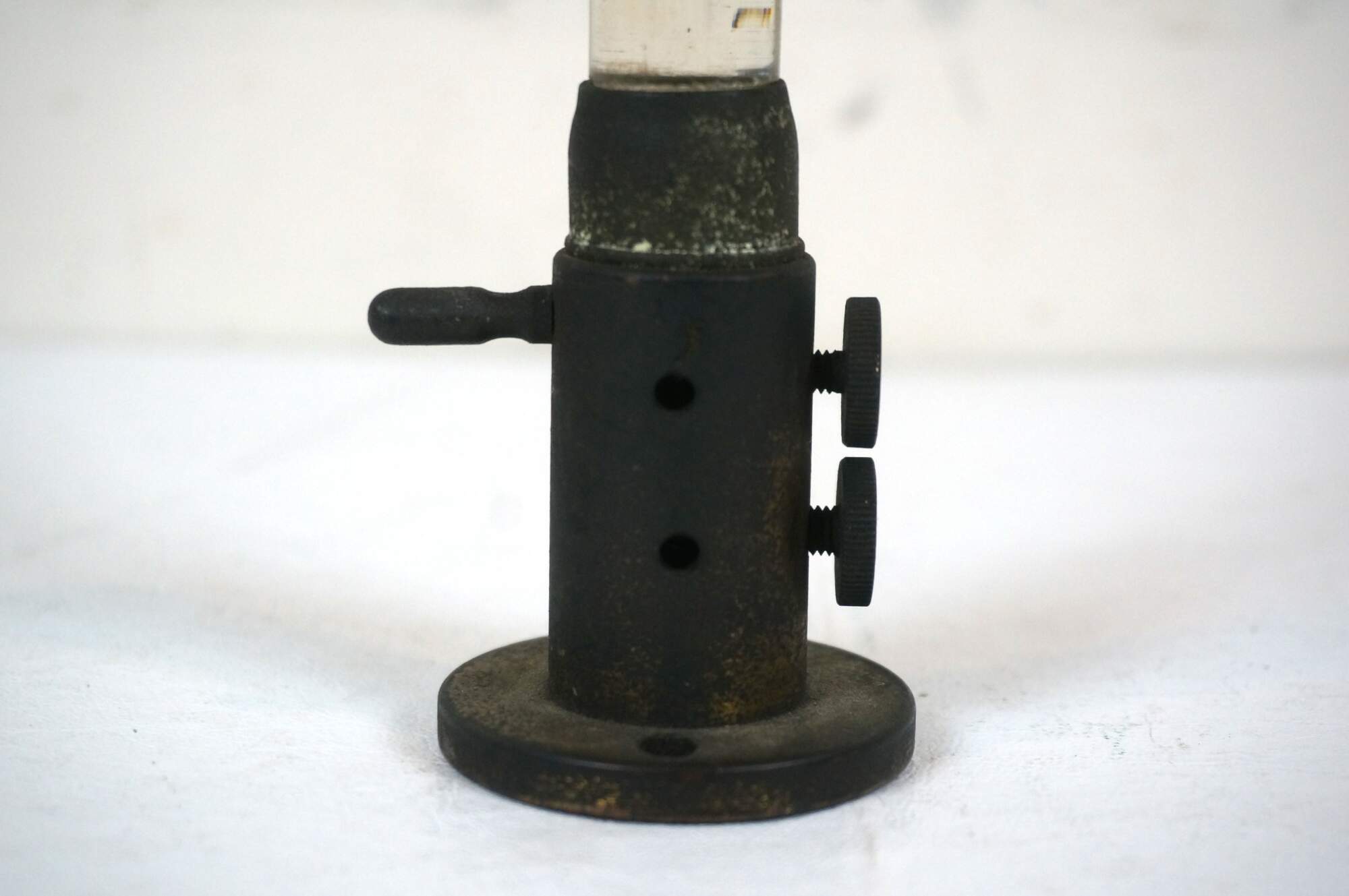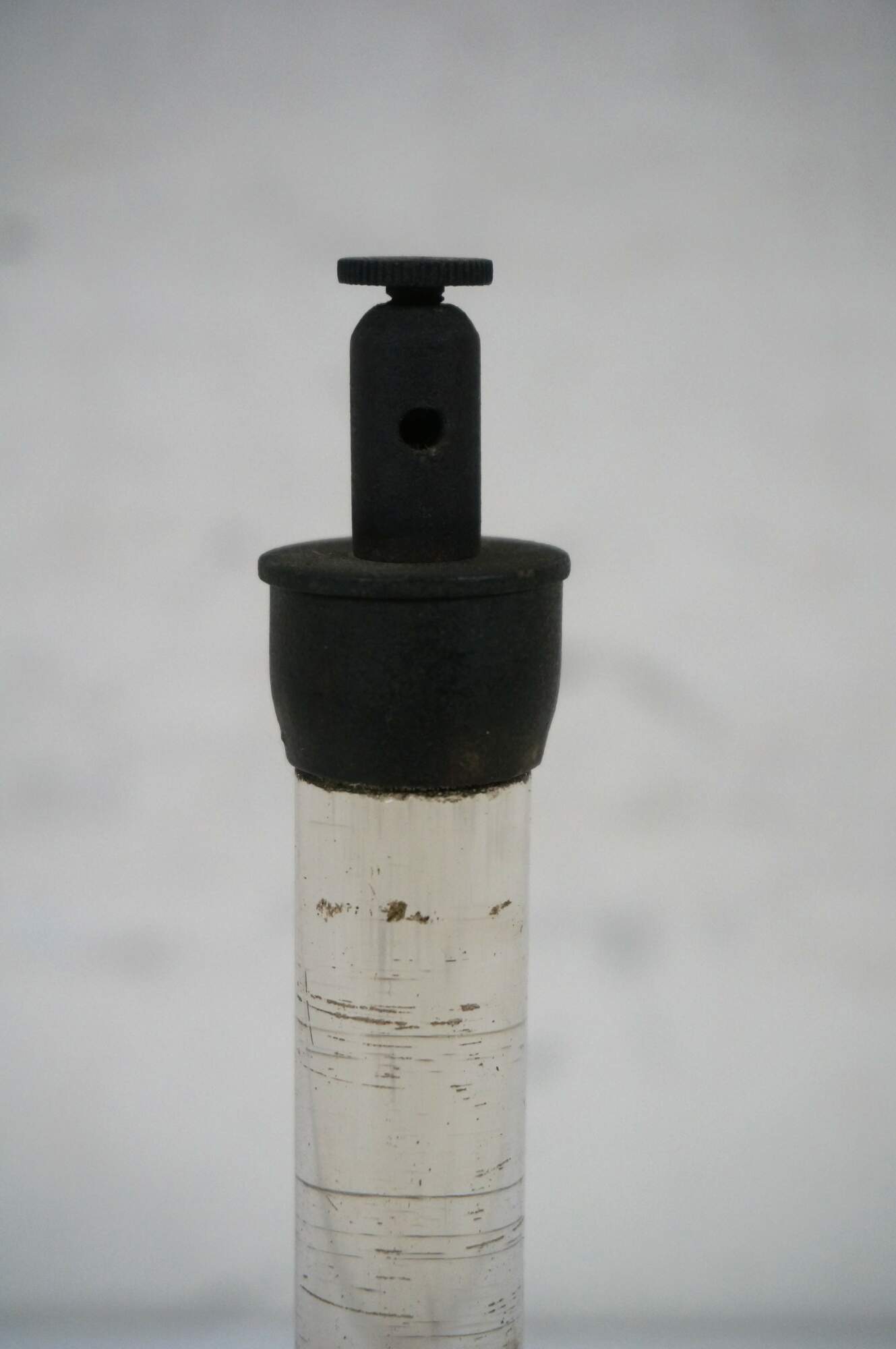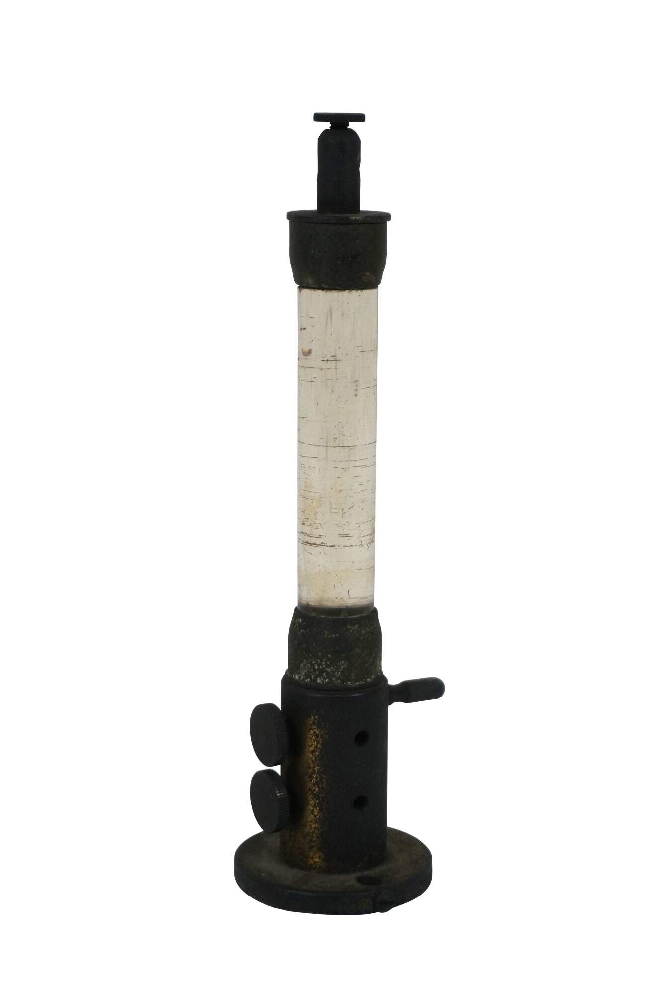 Scientific testing instrument consisting of a solid glass cylinder set in a solid brass base with two inset screws and top.
