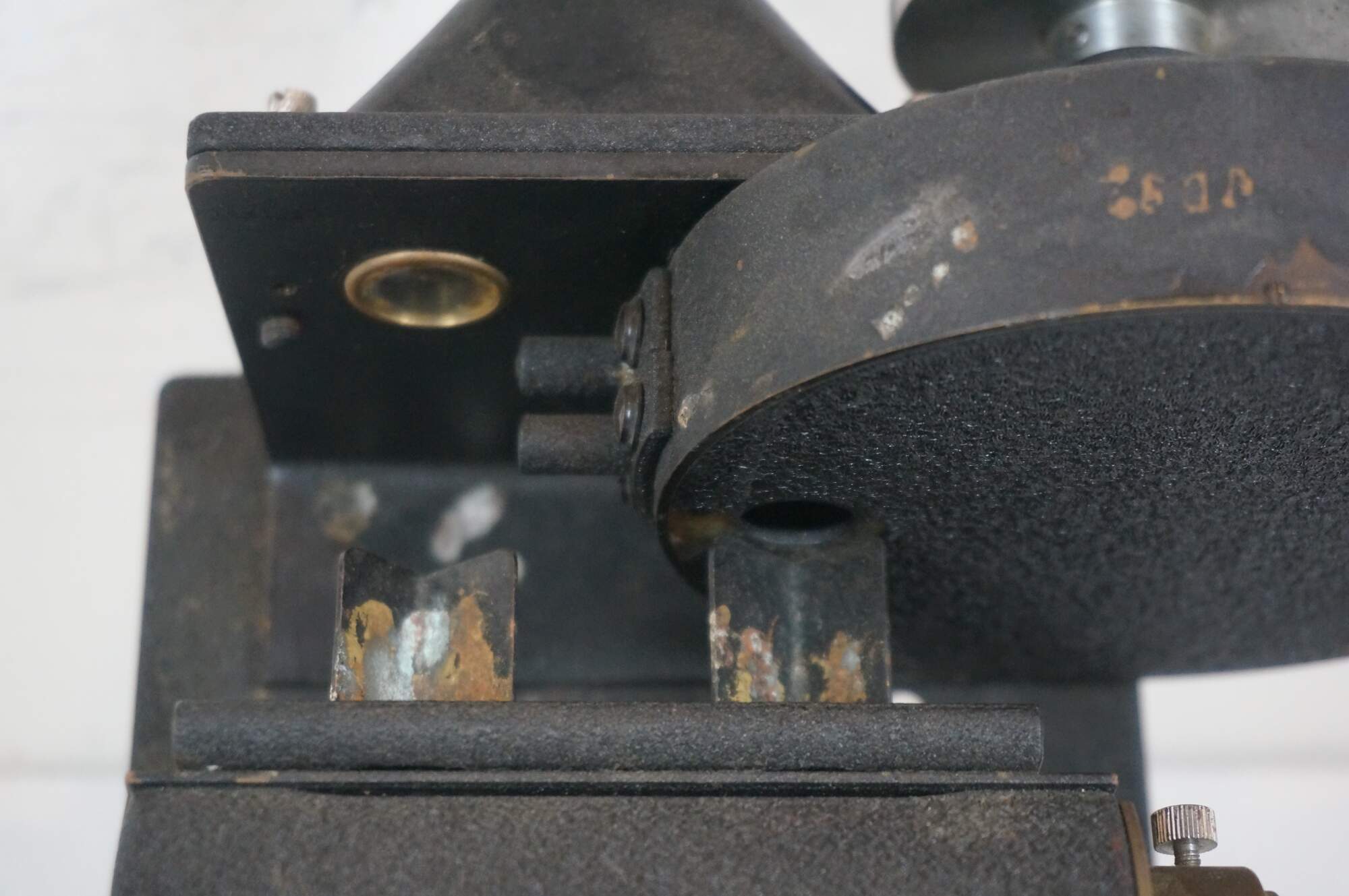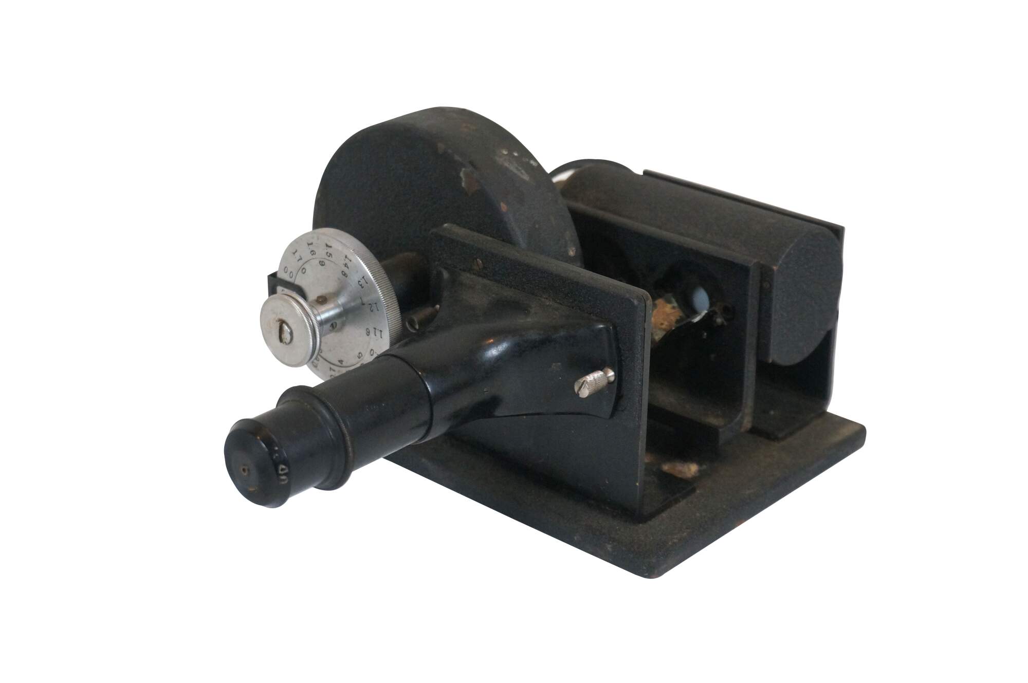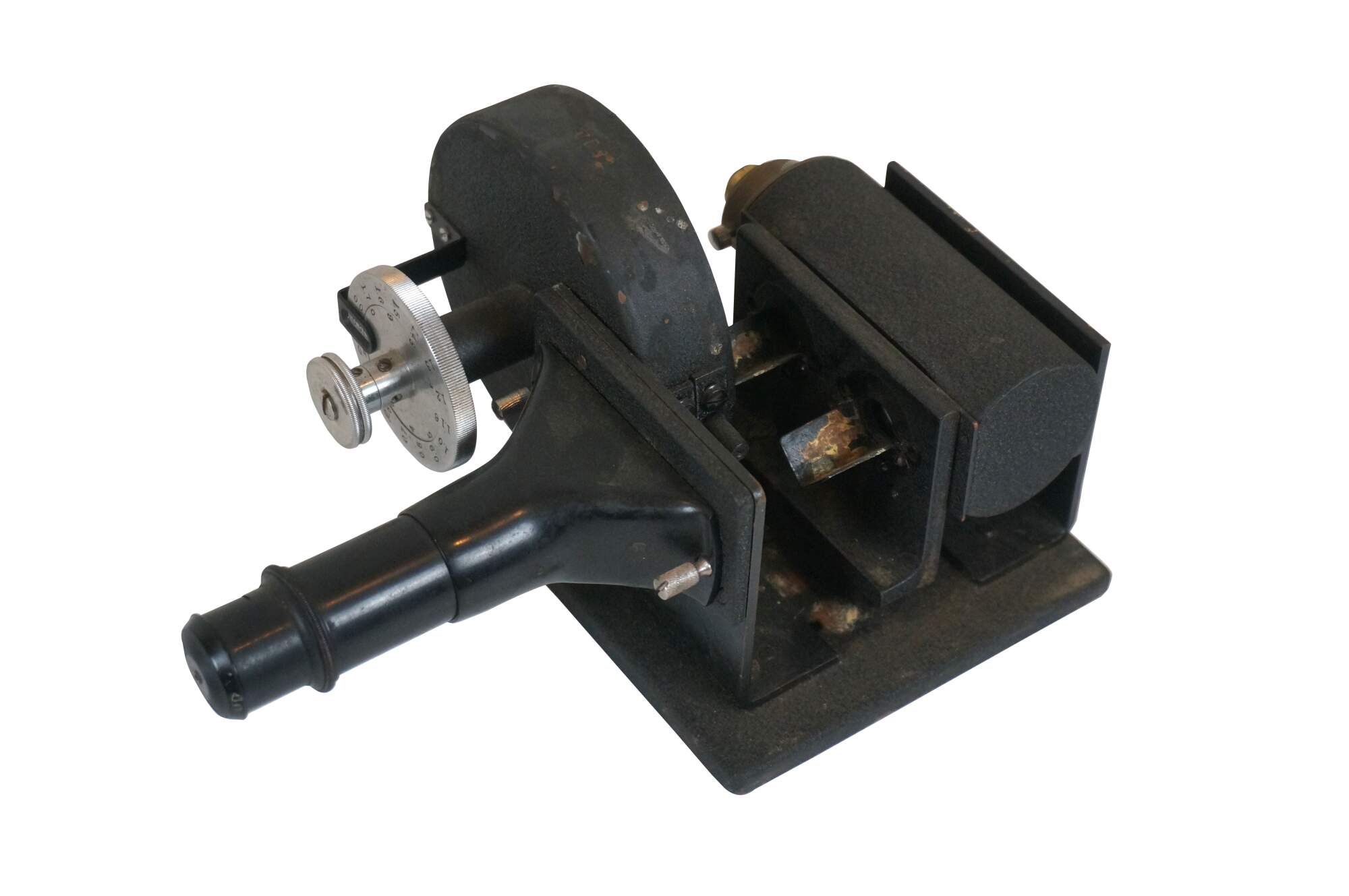 Mid to early century optical measuring device. "This device features a light which shines a beam of light through two openings, one of which passes through the assembly with two nested dials, then rejoining them with prisms at the eyepiece. By turning the dials and comparing the light on each side, measurements can be made.