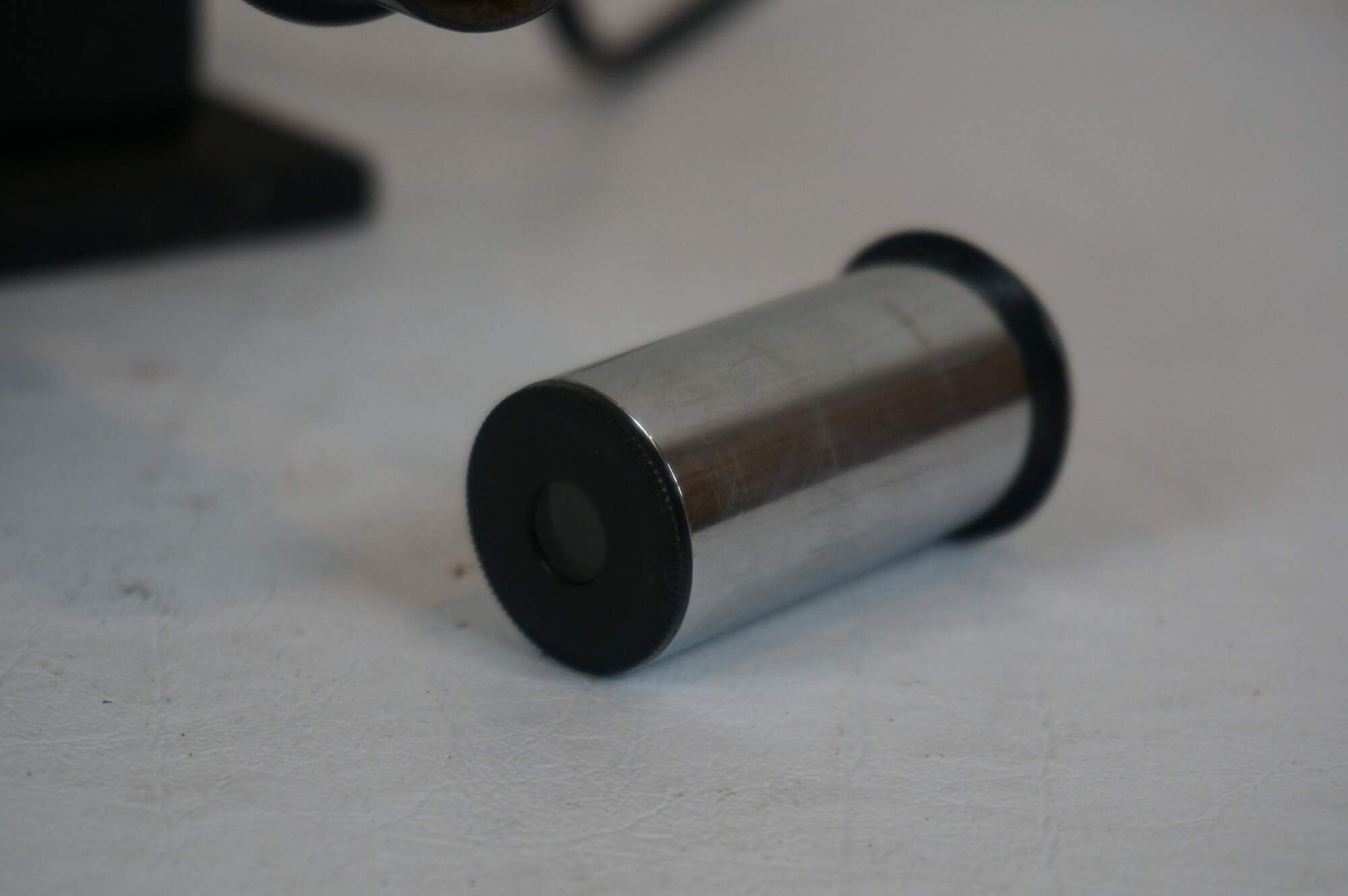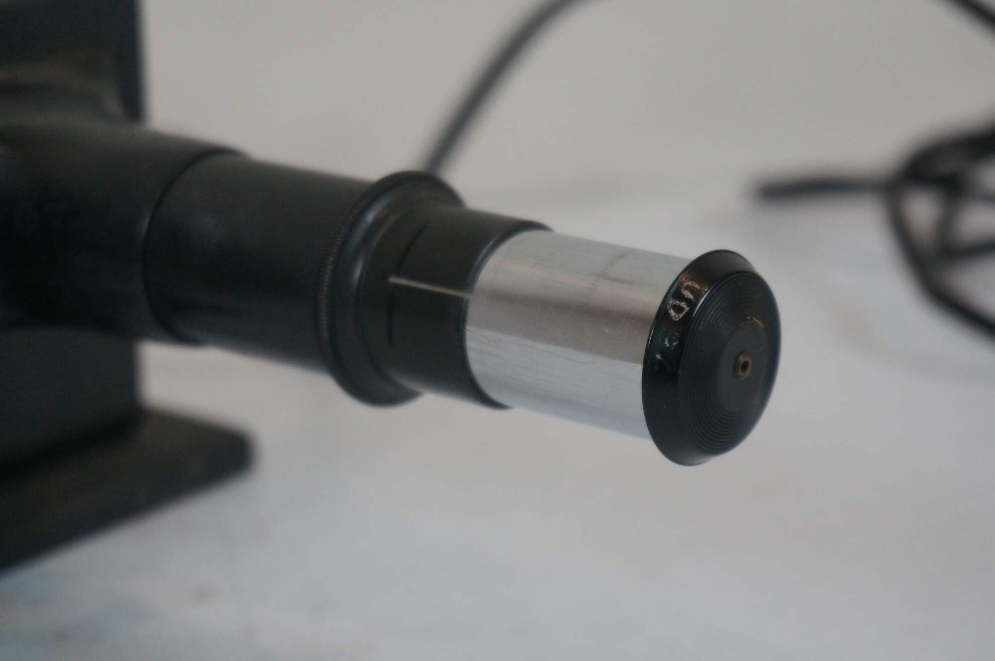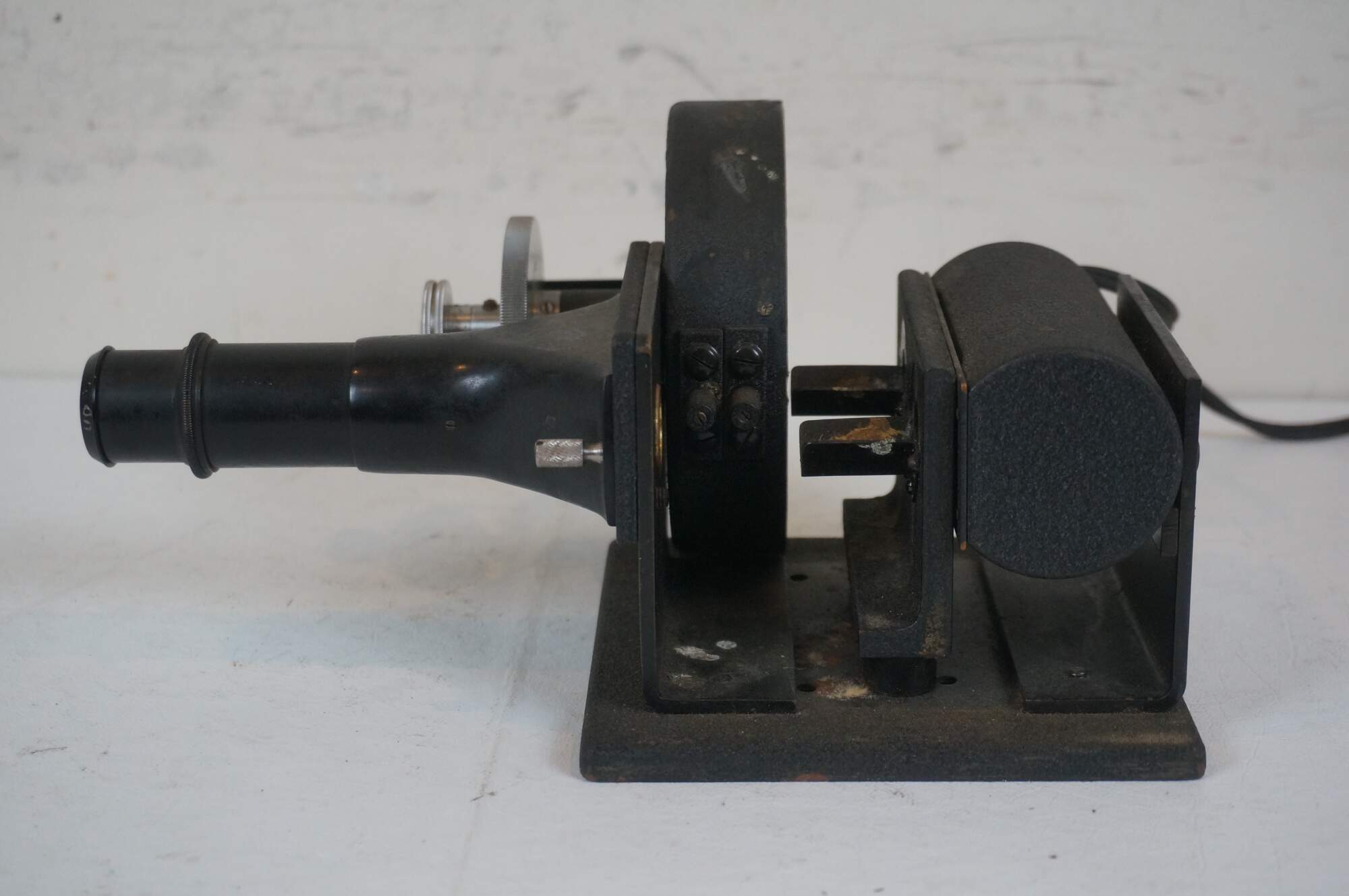Mid to early century optical measuring device. "This device features a light which shines a beam of light through two openings, one of which passes through the assembly with two nested dials, then rejoining them with prisms at the eyepiece. By turning the dials and comparing the light on each side, measurements can be made.