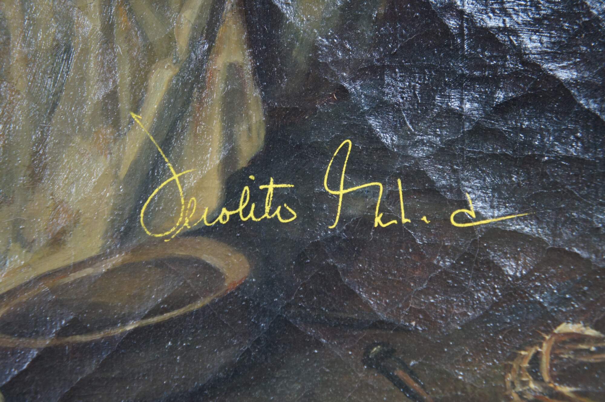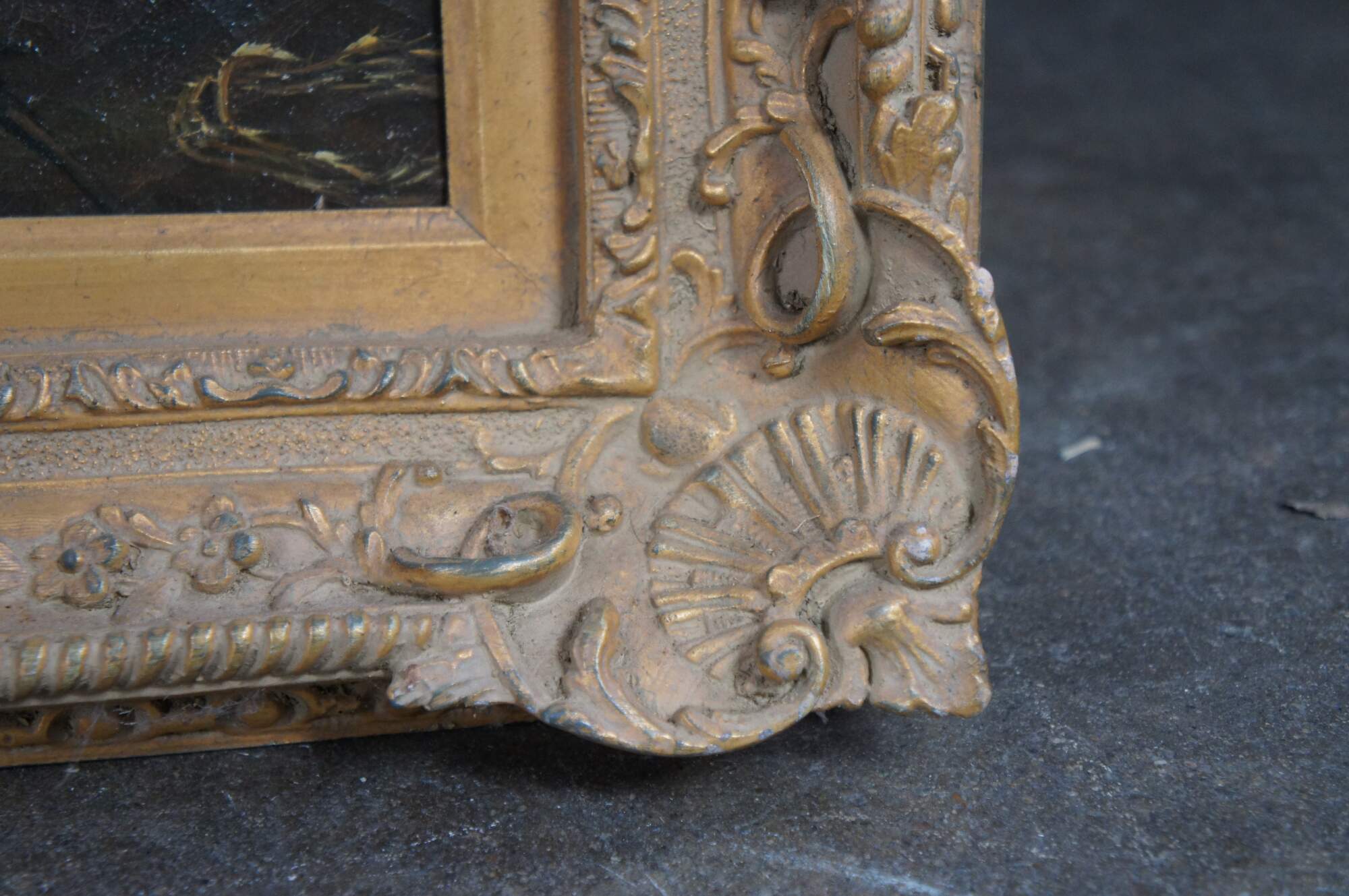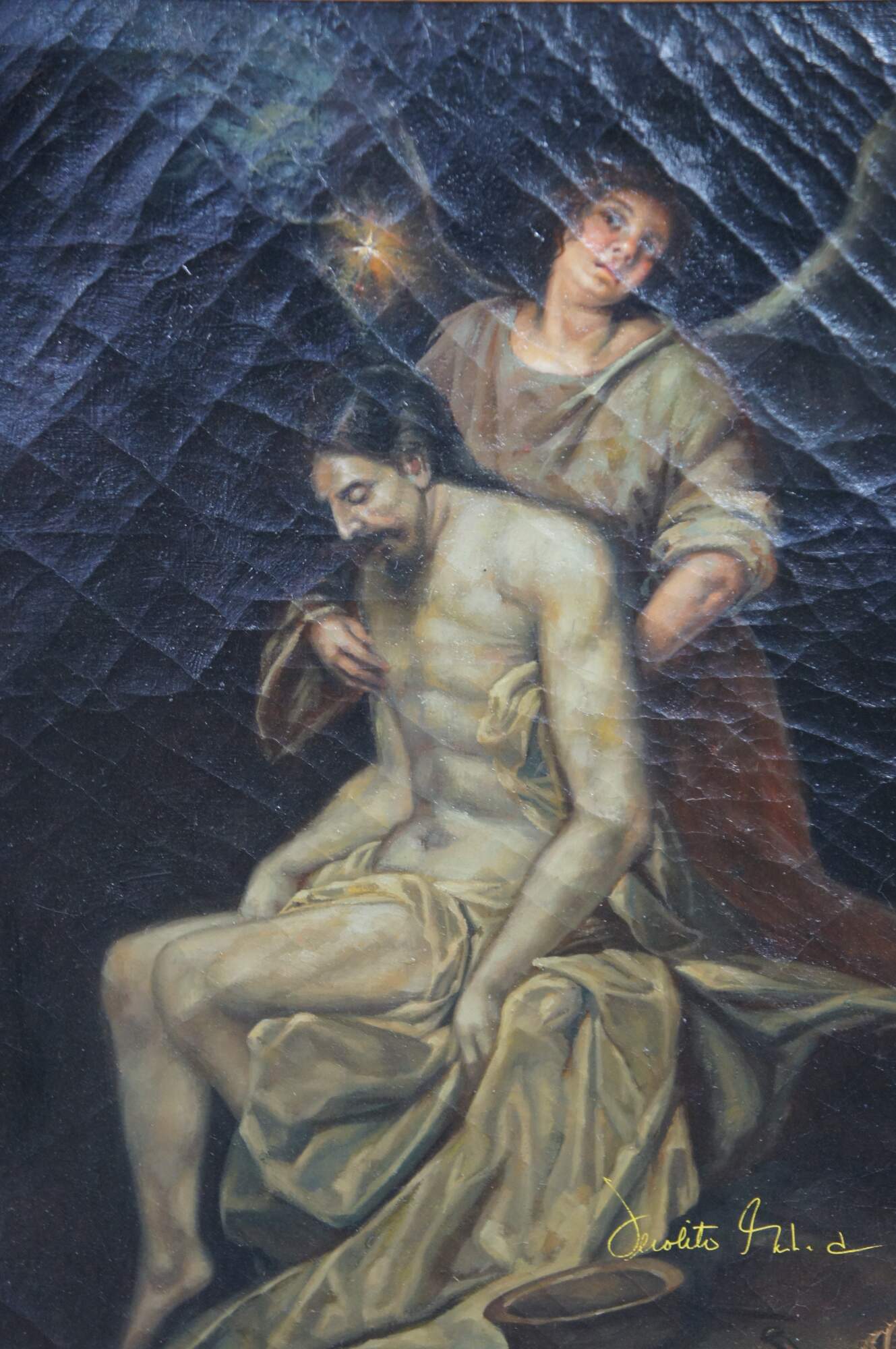 The Dead Christ supported by an Angel Oil Painting after Alonso Cano. Scalloped gold baroque frame with foliate accents.