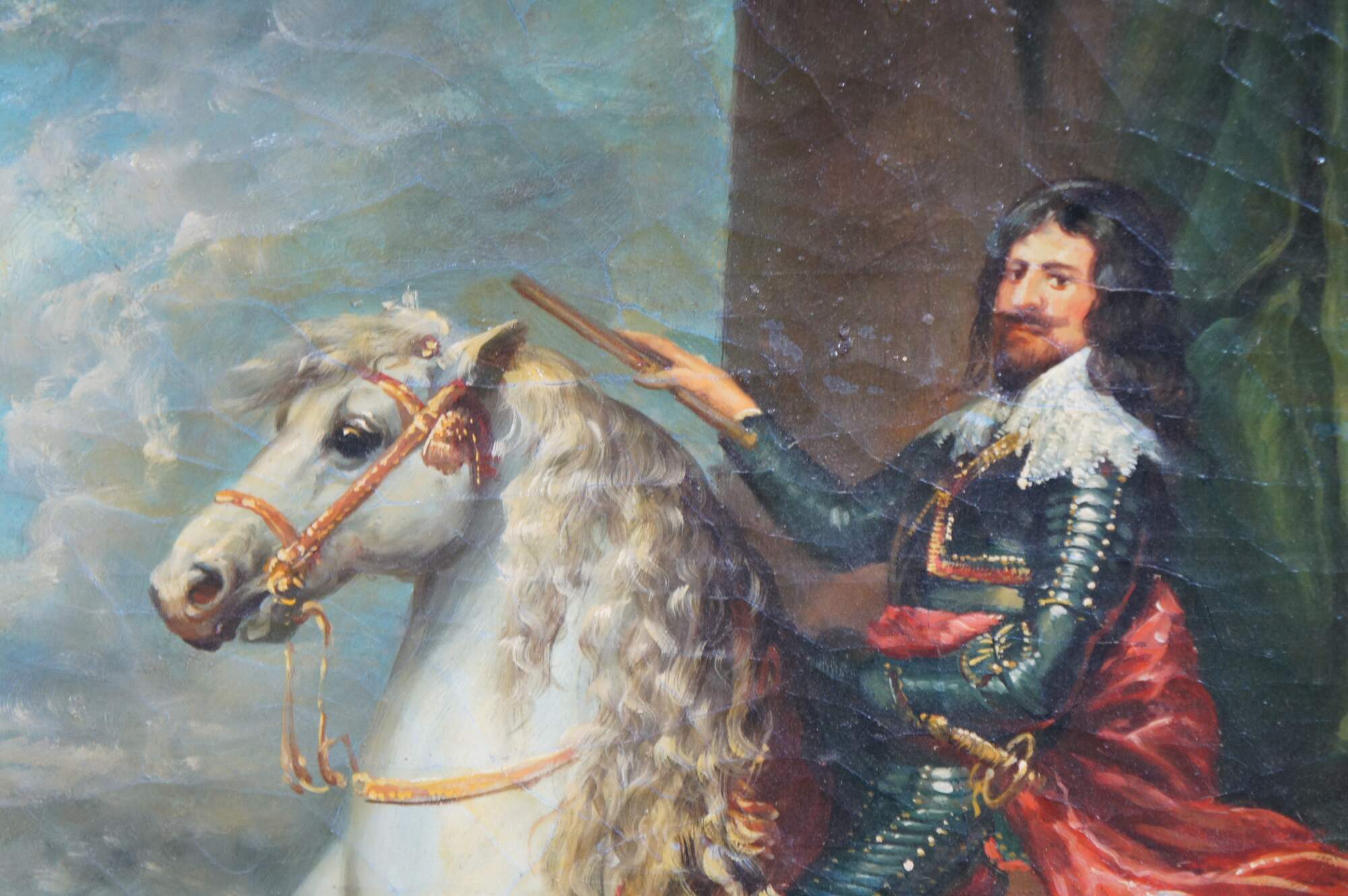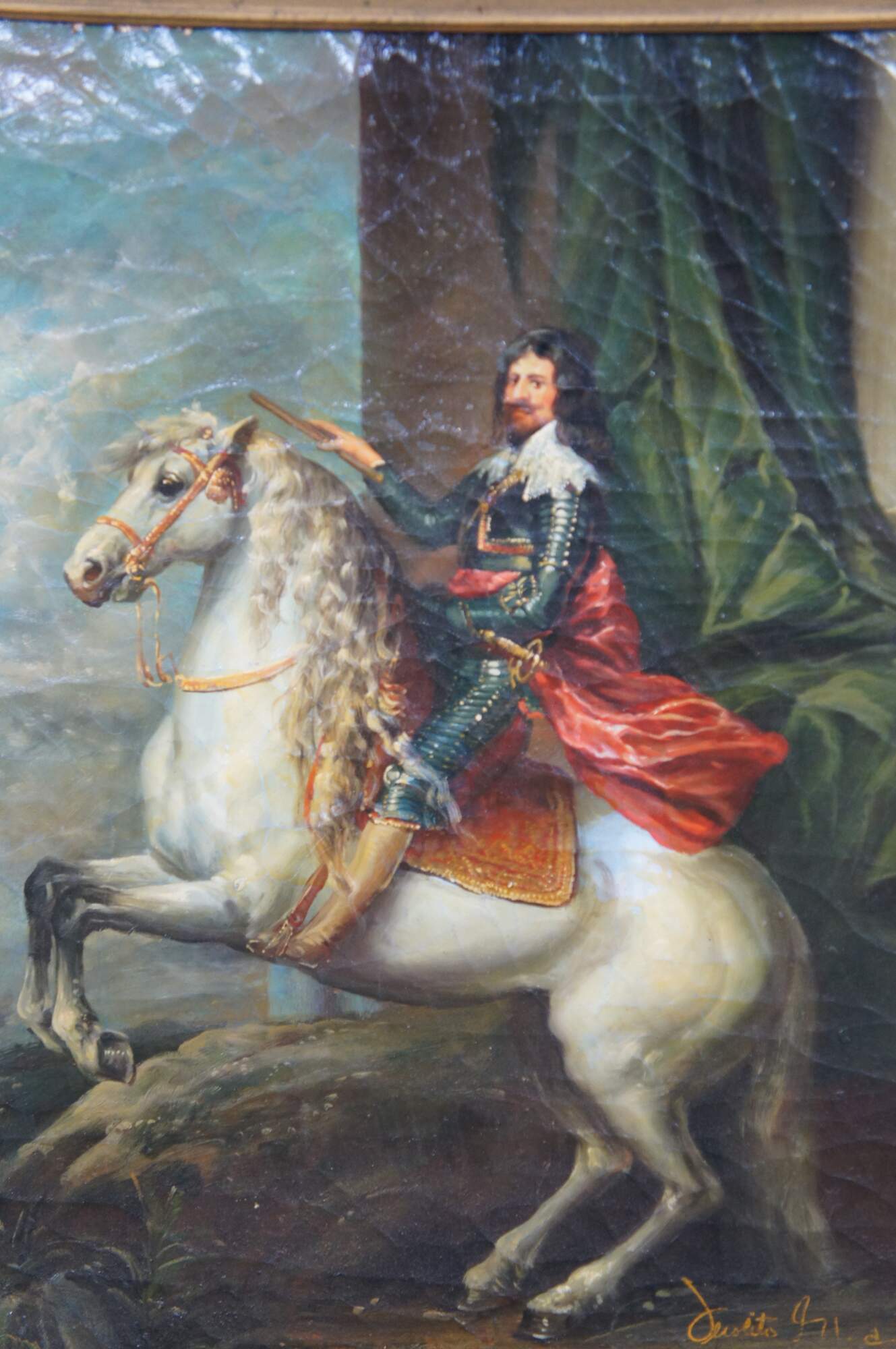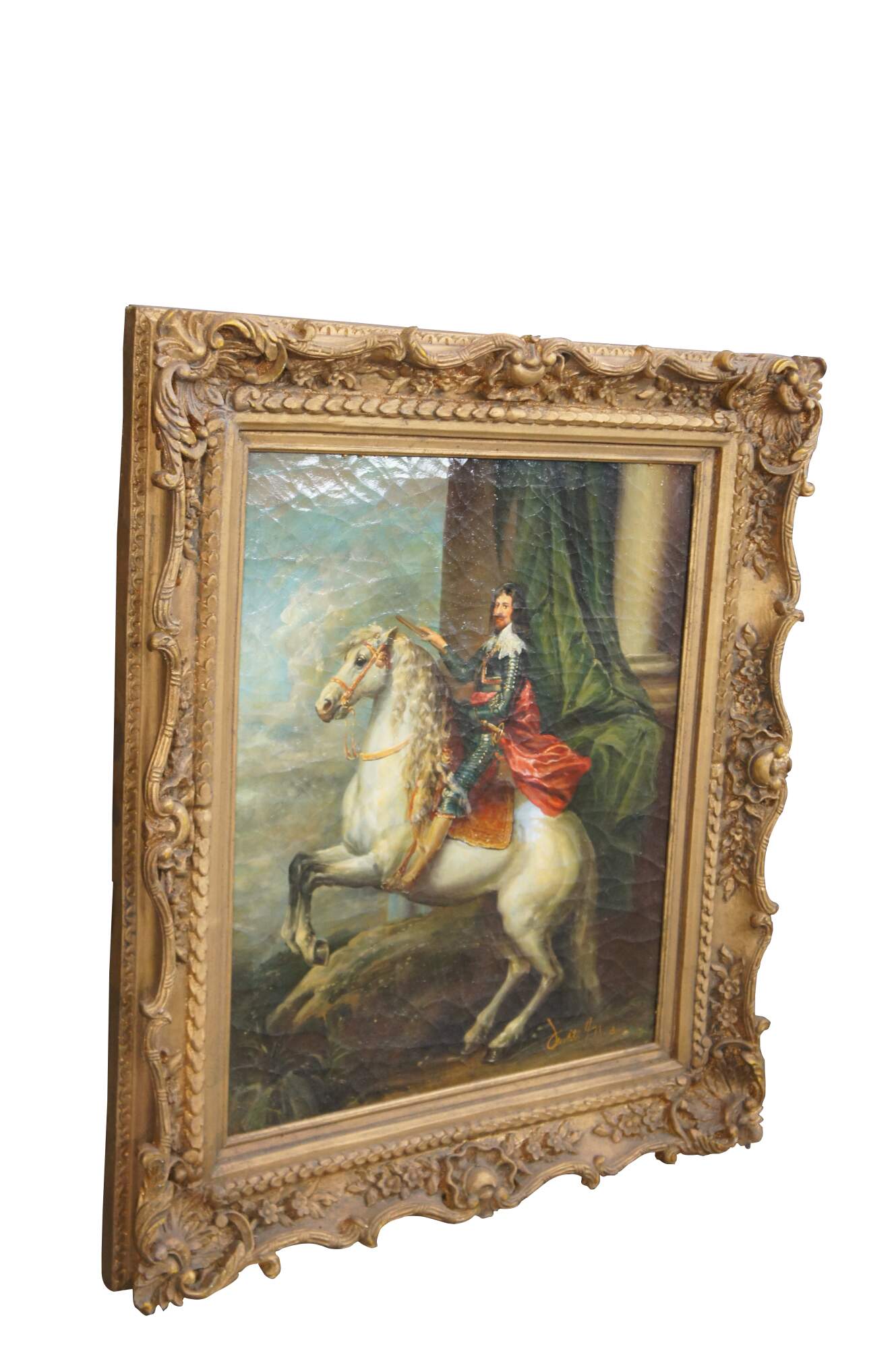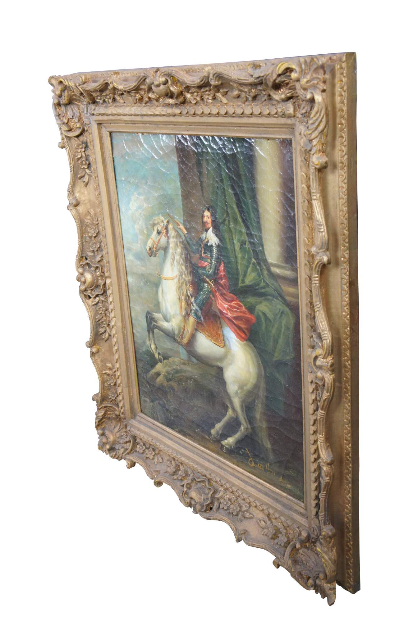 Late 20th century oil painting on linen after "Equestrian Portrait of Thomas Francis of Savoy, Prince of Carignano" originally painted in 1634 by Anthony van Dyck. Baroque gold floral and foliate frame.